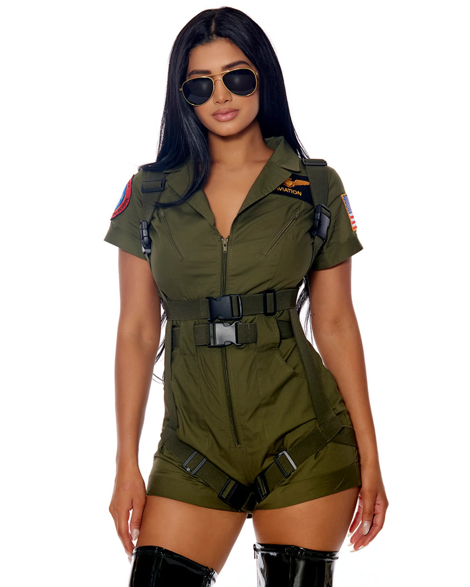 4-piece sexy movie character costume features poplin zipfront collared romper with embroidered ornamental patches paired with elastic body harness and belt and glasses.