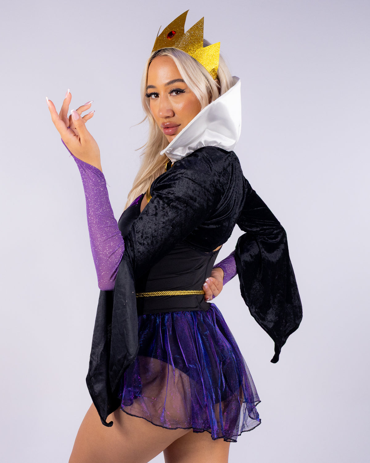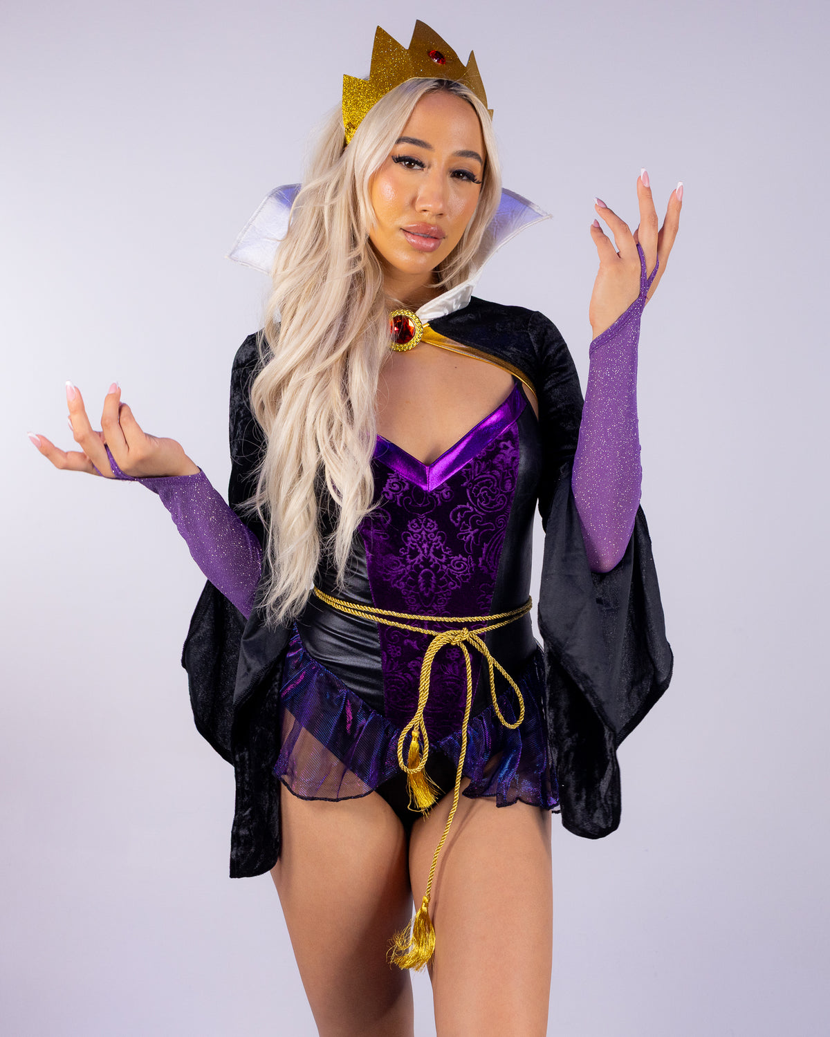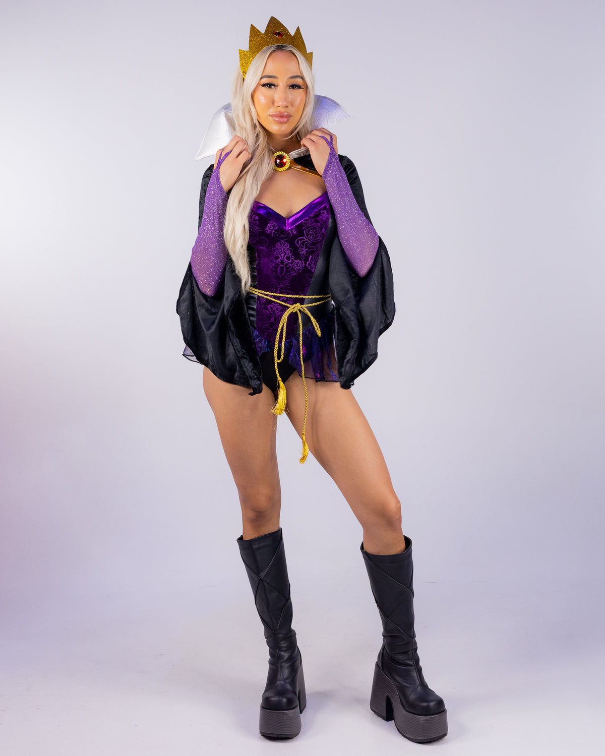 The velvet shrug, complete with a jewel closure and dramatic gauntlet sleeves, adds a regal touch, while the gold rope belt cinches your waist for a flawless silhouette. Top off your look with the striking crown, perfect for ruling any costume party. For a wickedly fun twist, team up with a Snow White costume and become the iconic duo everyone will remember.
