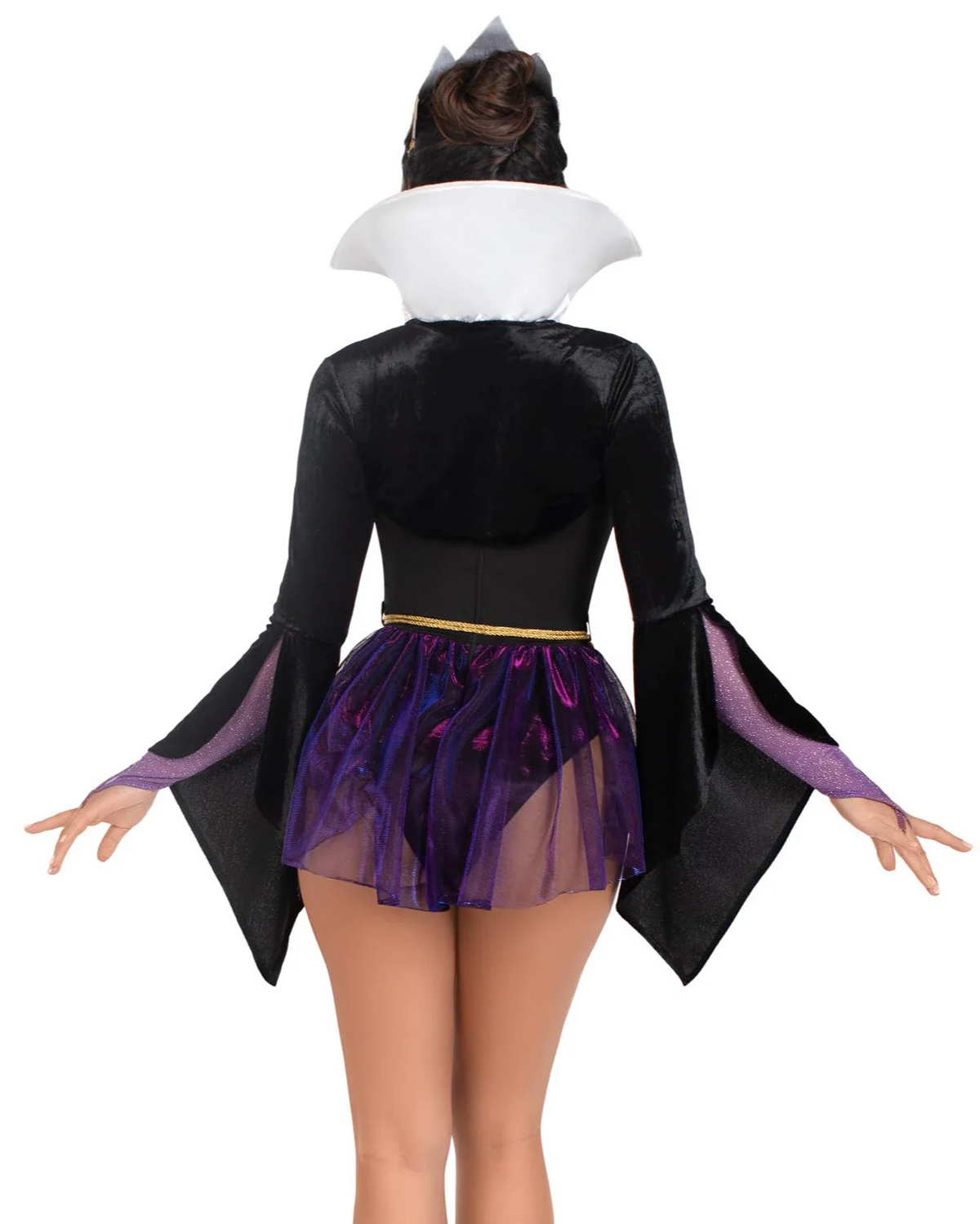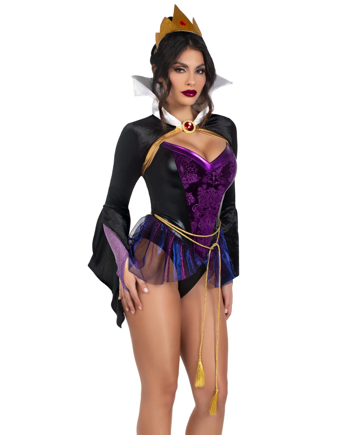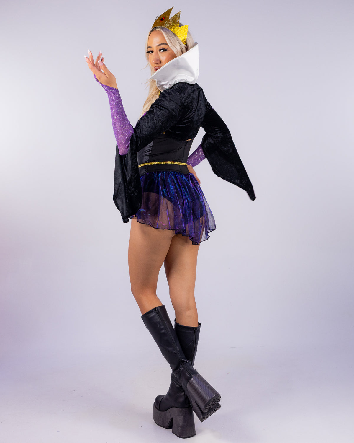 Step into the spotlight as the ultimate villainess with the Poisonous Queen 4pc Women's Costume Set. This enchanting ensemble features a snap crotch bodysuit adorned with luxurious velvet brocade and a shimmering iridescent skirt that catches every eye.