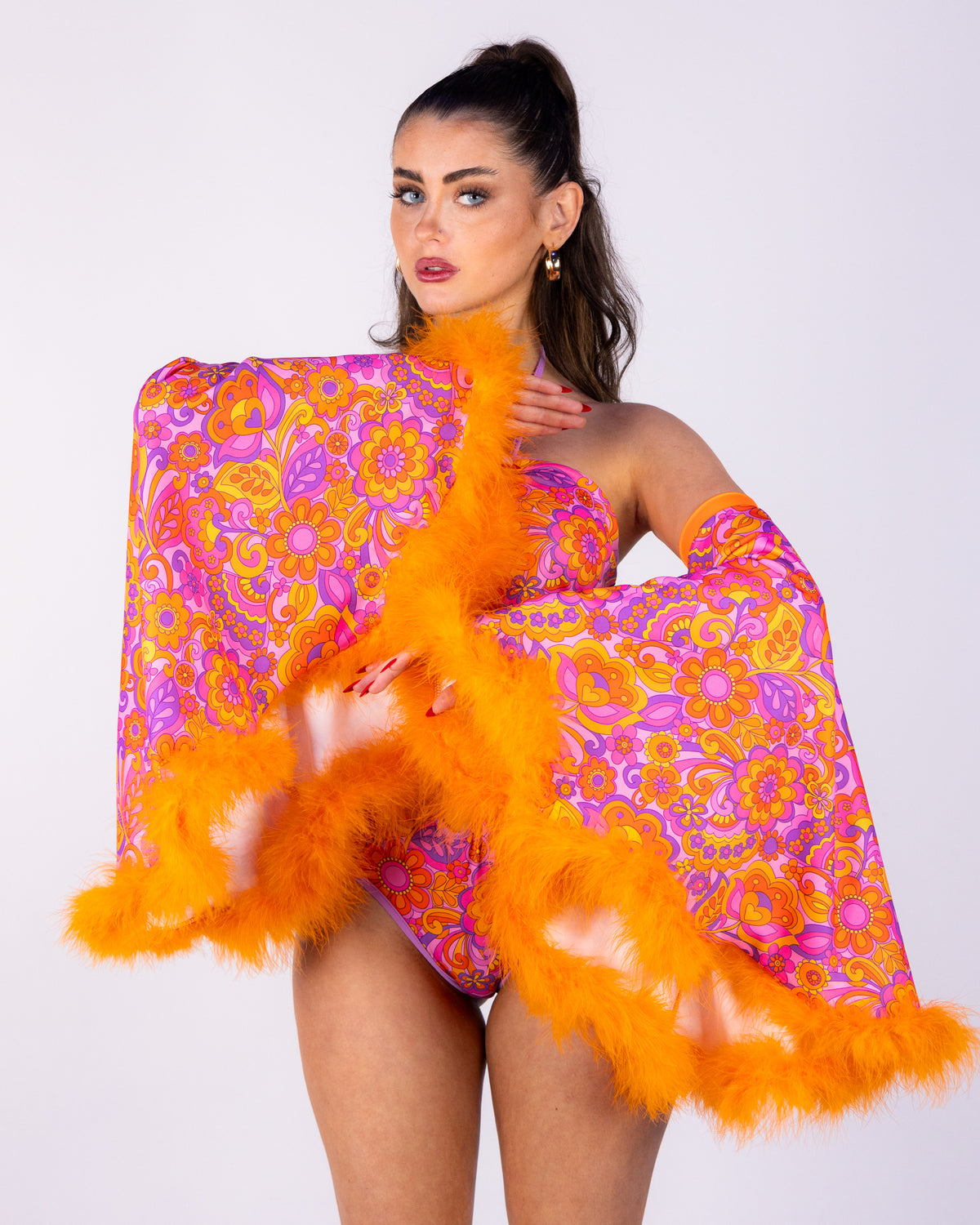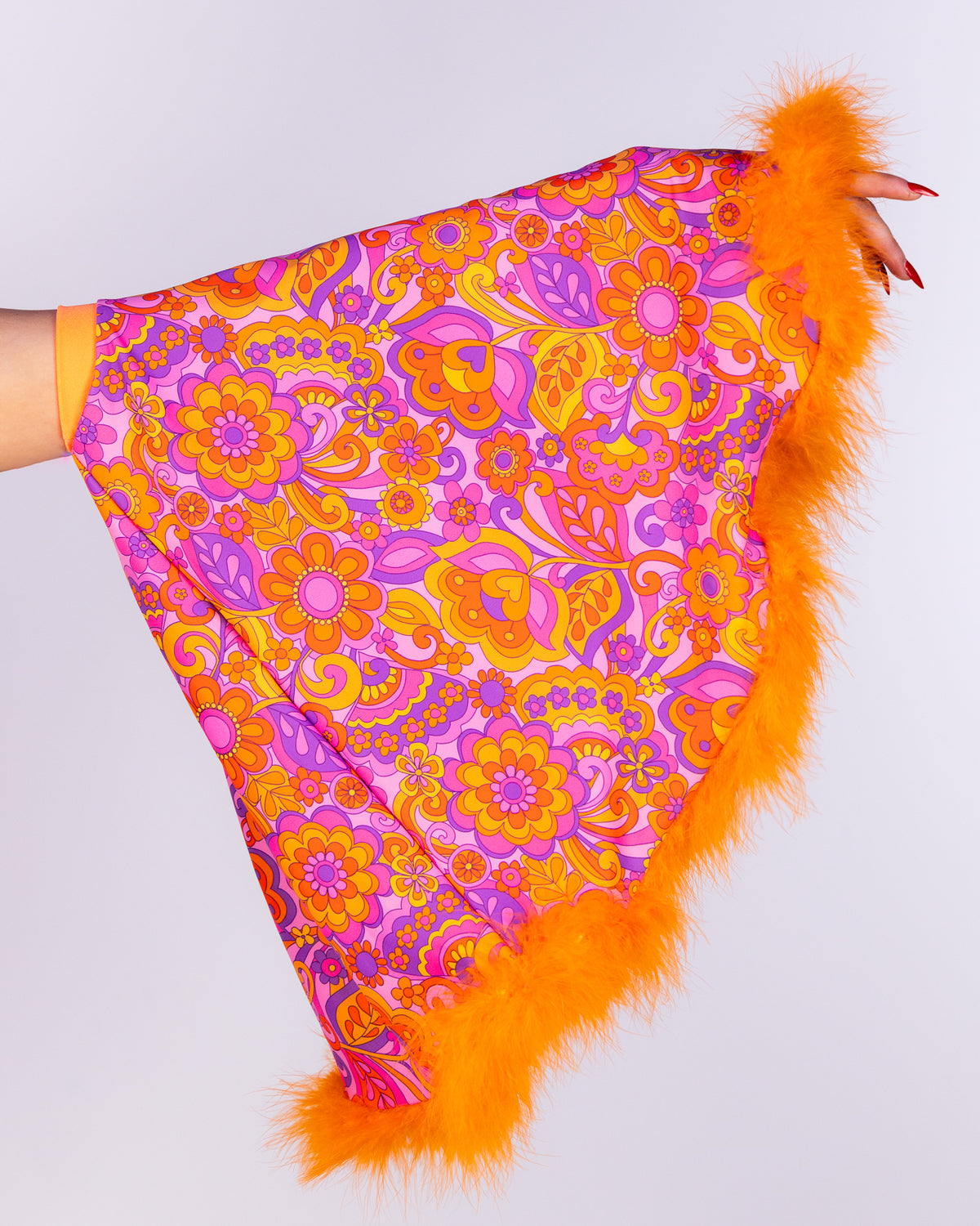 - Care: hand wash cold, air dry (avoid heat to preserve the vibrant print and the soft marabou hem!)