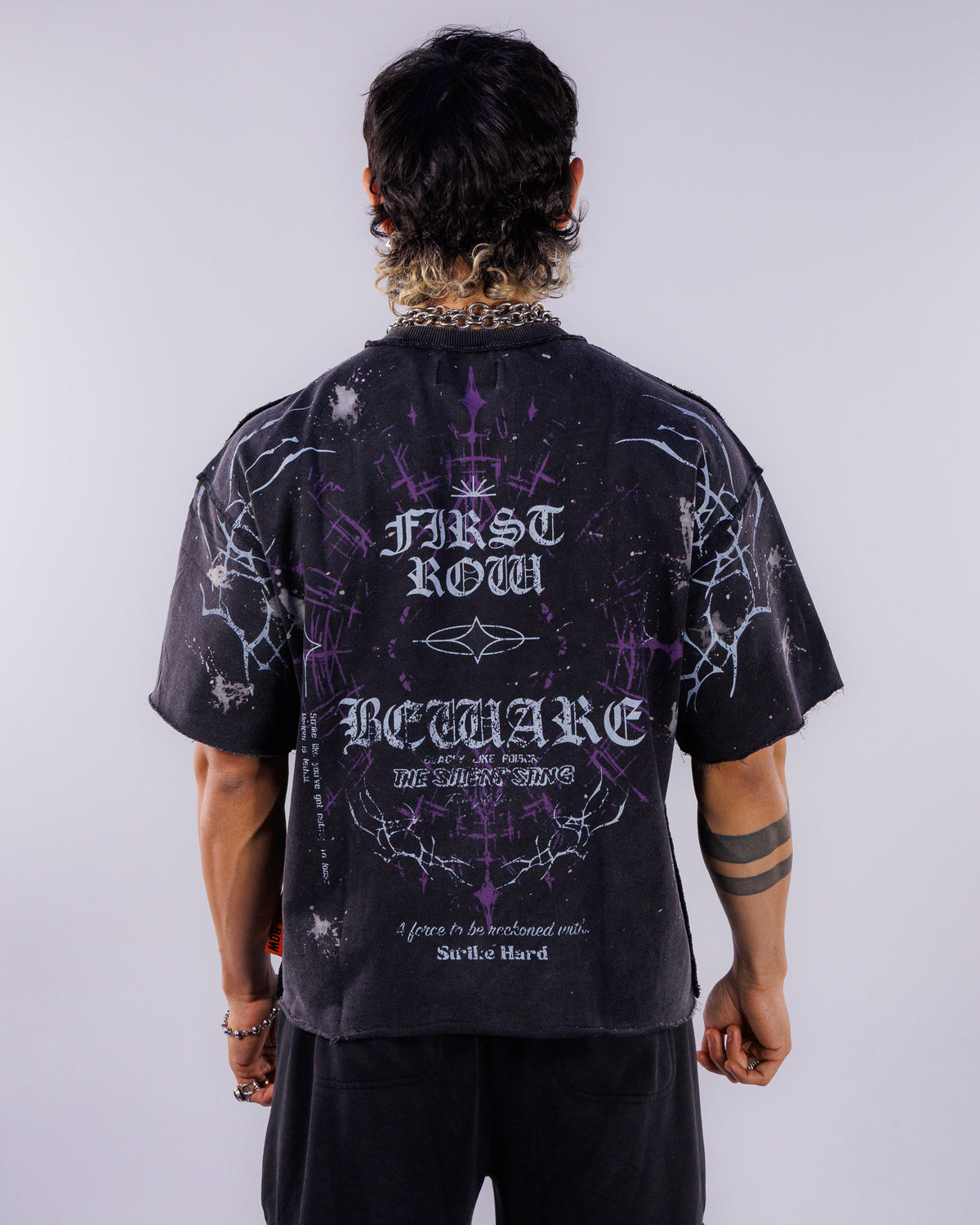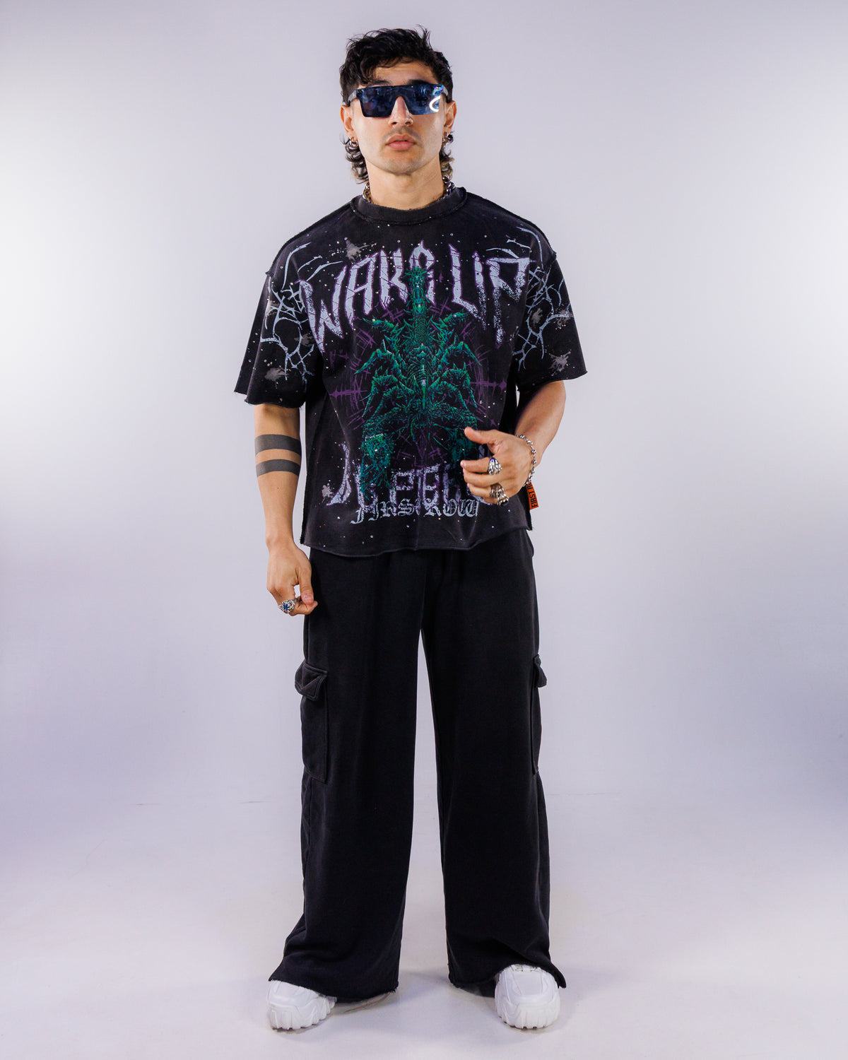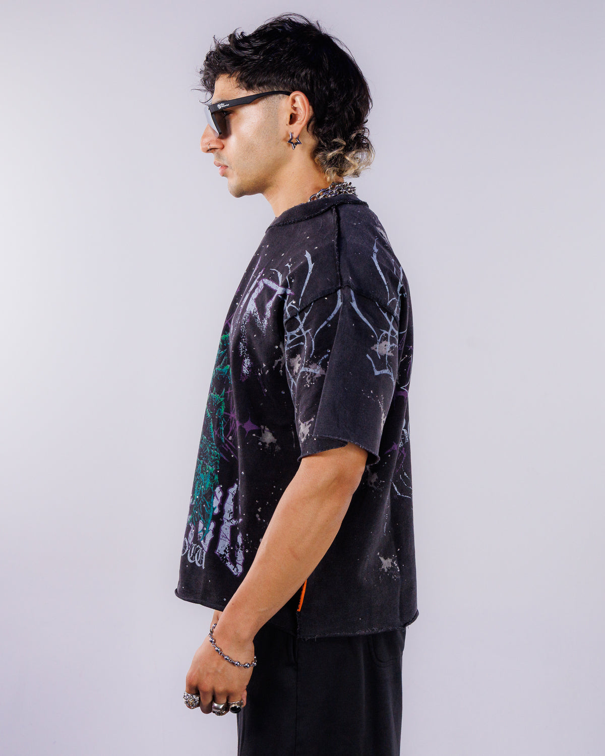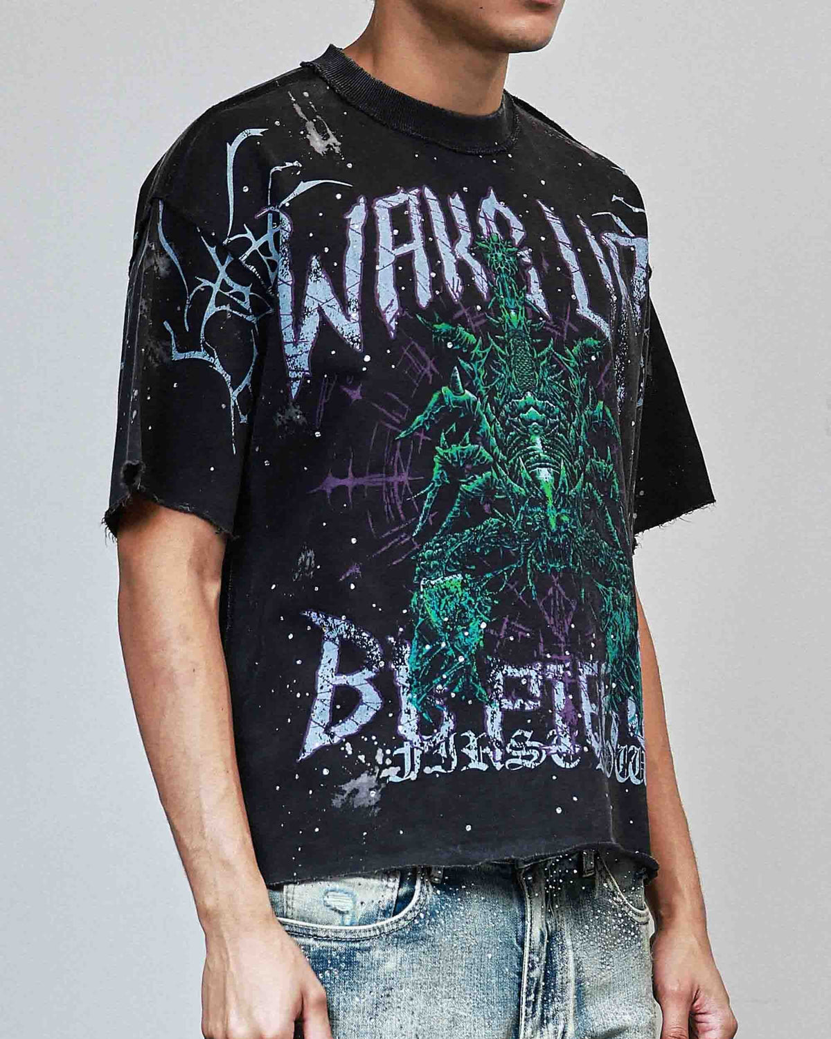 Whether you're shopping for a tomboy or any guy in your life, this washed graphic crop t-shirt with raw edges and rhinestone details is the perfect casual piece to have in your rave or everyday wardrobe for a little Y2K throwback! Featuring a front and back design, a flat hem line and slightly dropped shoulder fit.