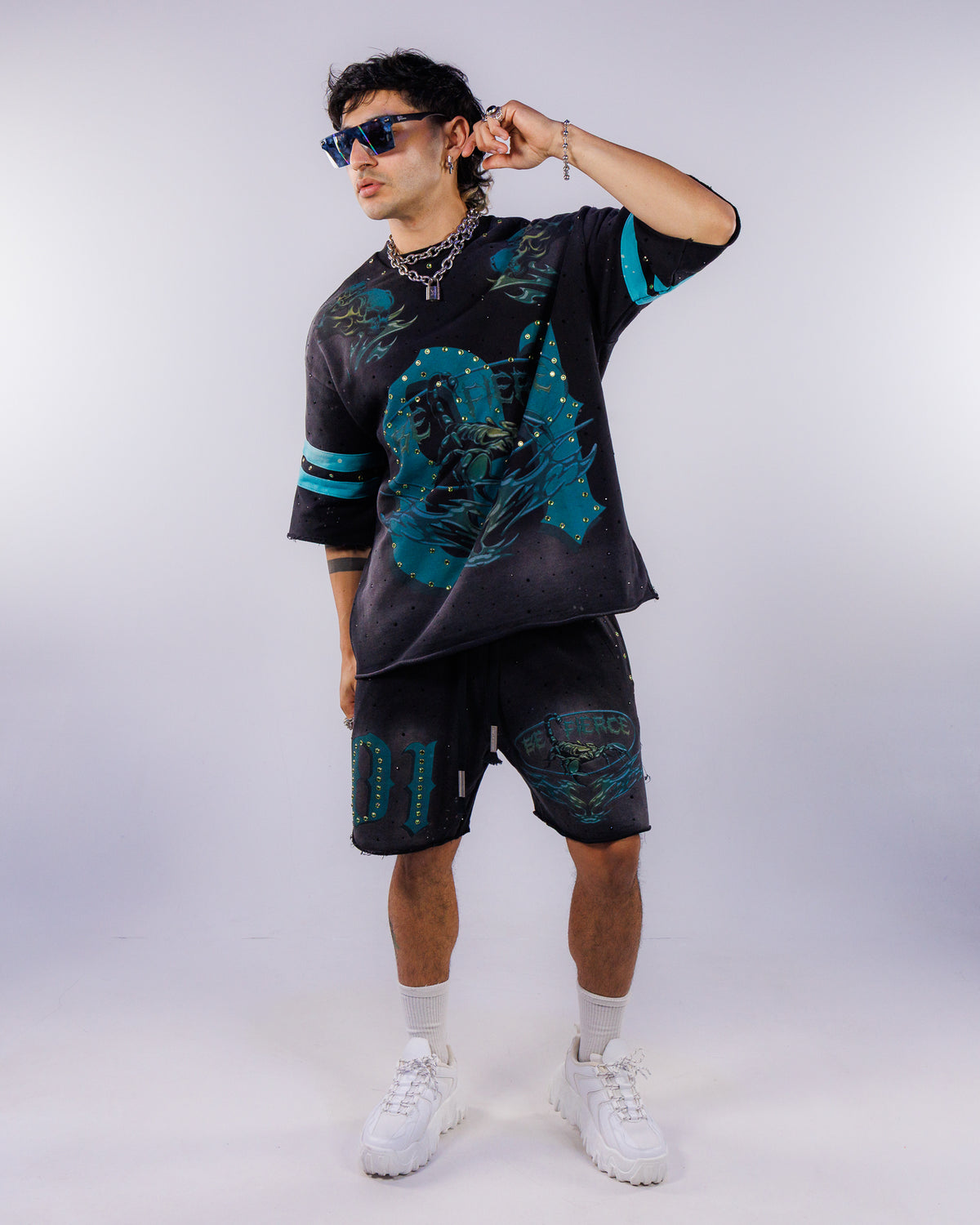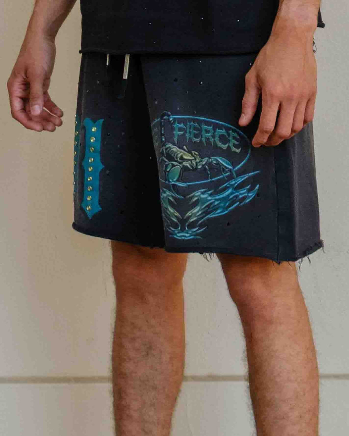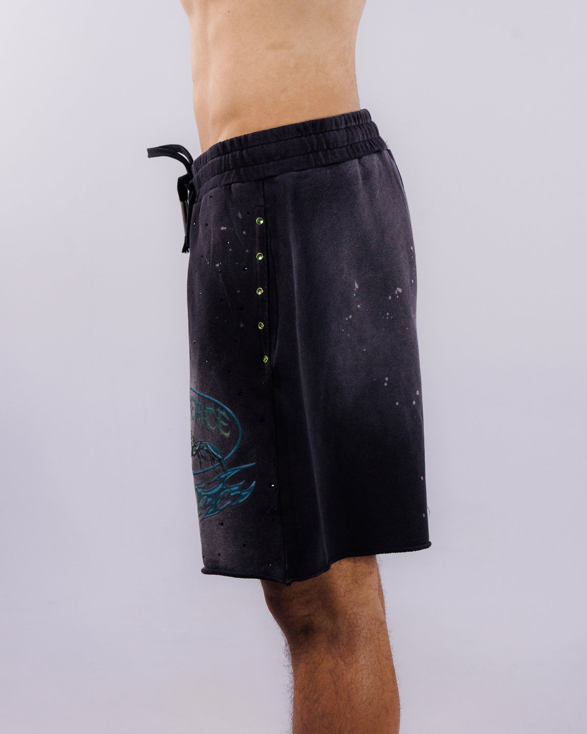 Whether you're shopping for a tomboy or any guy in your life, these washed jogger shorts with rhinestone detail are the perfect staple piece to have in your rave or everyday wardrobe. Featuring a simple and comfy silhouette with lined with terry inside, an adjustable drawcord at the waist and front pockets.