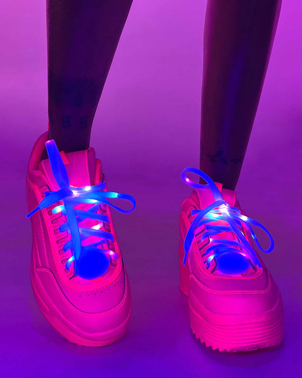 LEDÂ shoelaces. Includes battery pack and features 4 light modes and 5 color options!
