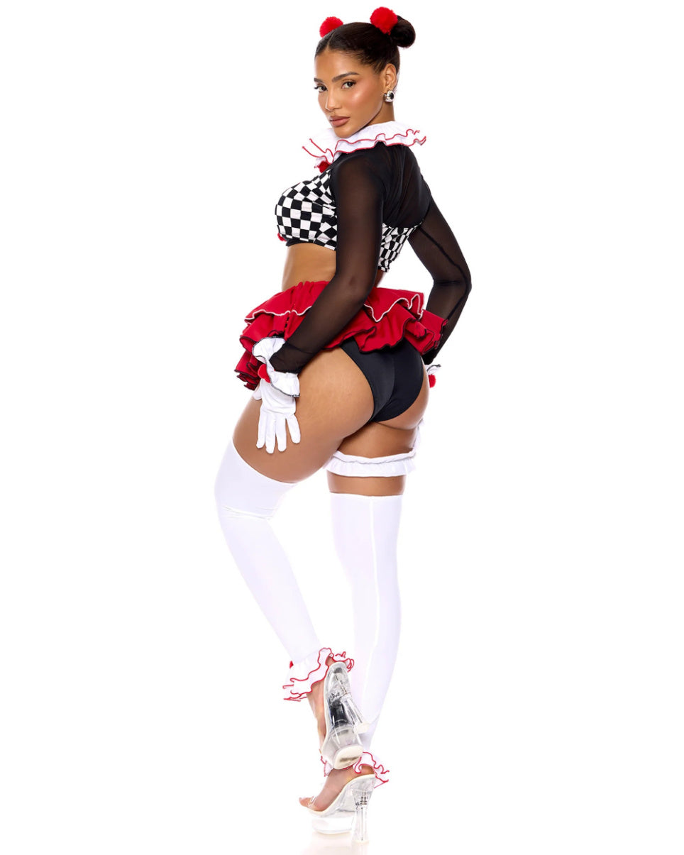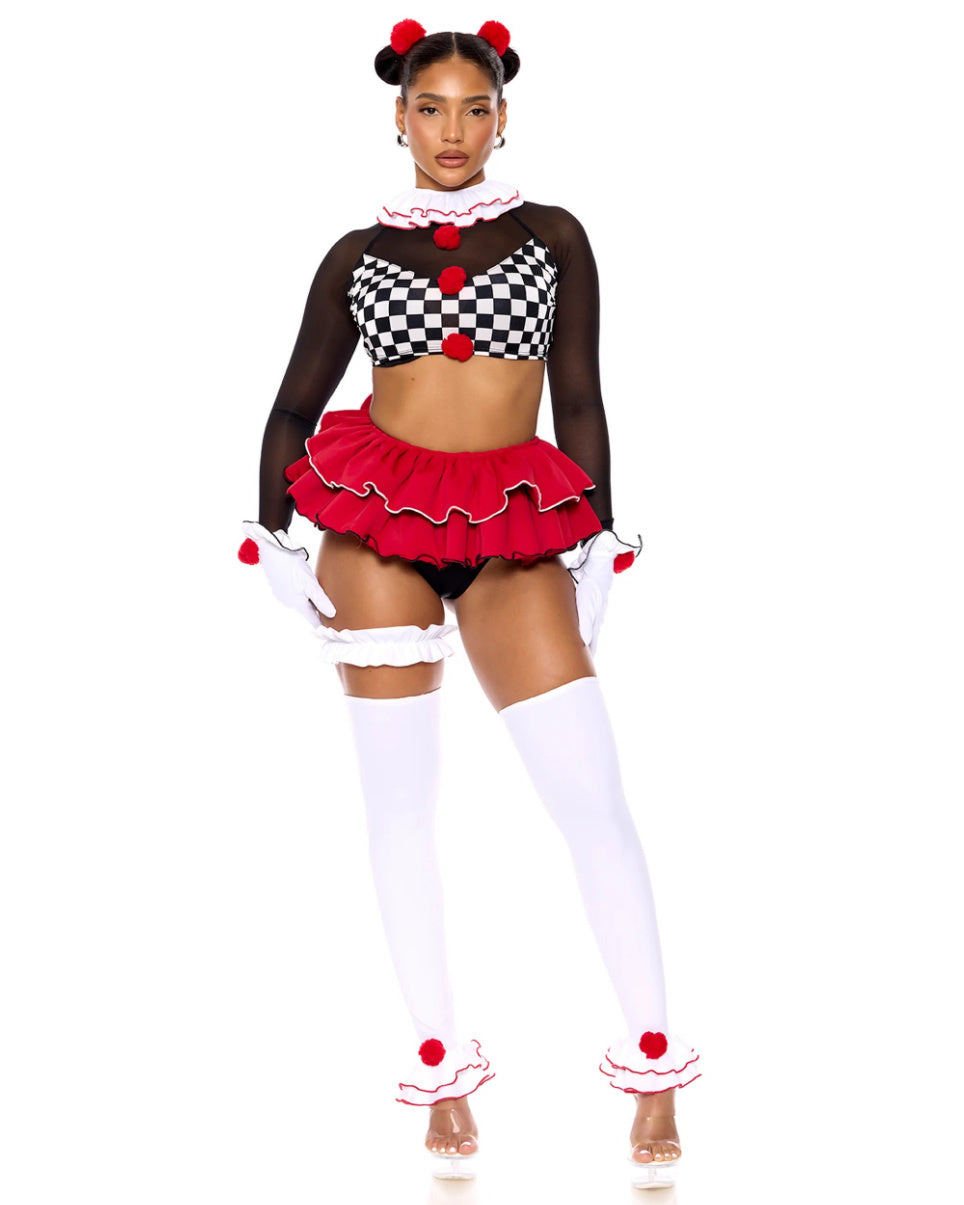 8-piece sexy clown costume features checkered print long sleeve top with sheer mesh panel and pom pom detail and panty paired with ruffle skirt and collar and leg accessories and thigh garter and hair accessories and matching gloves.