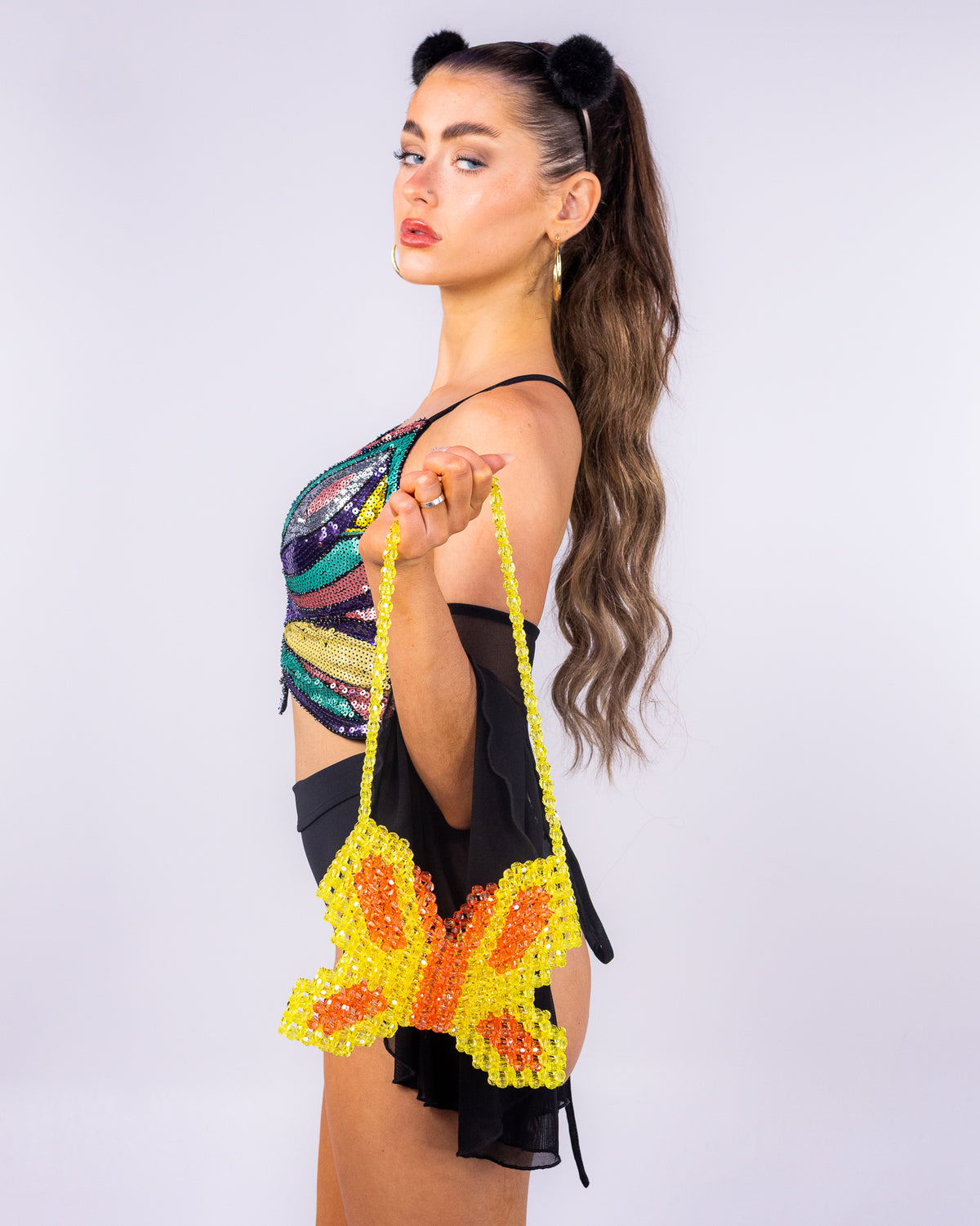 Spark your sense of adventure and break out of your style routine with the 8-Bit Butterfly Women's Yellow & Orange Beaded Handbag! Embrace the limelight with its striking color palette and standout beaded detailing. Elevate your look and add a burst of fun to your wardrobe with this playful mini bag. Perfect for adding a pop of playfulness to any outfit!
