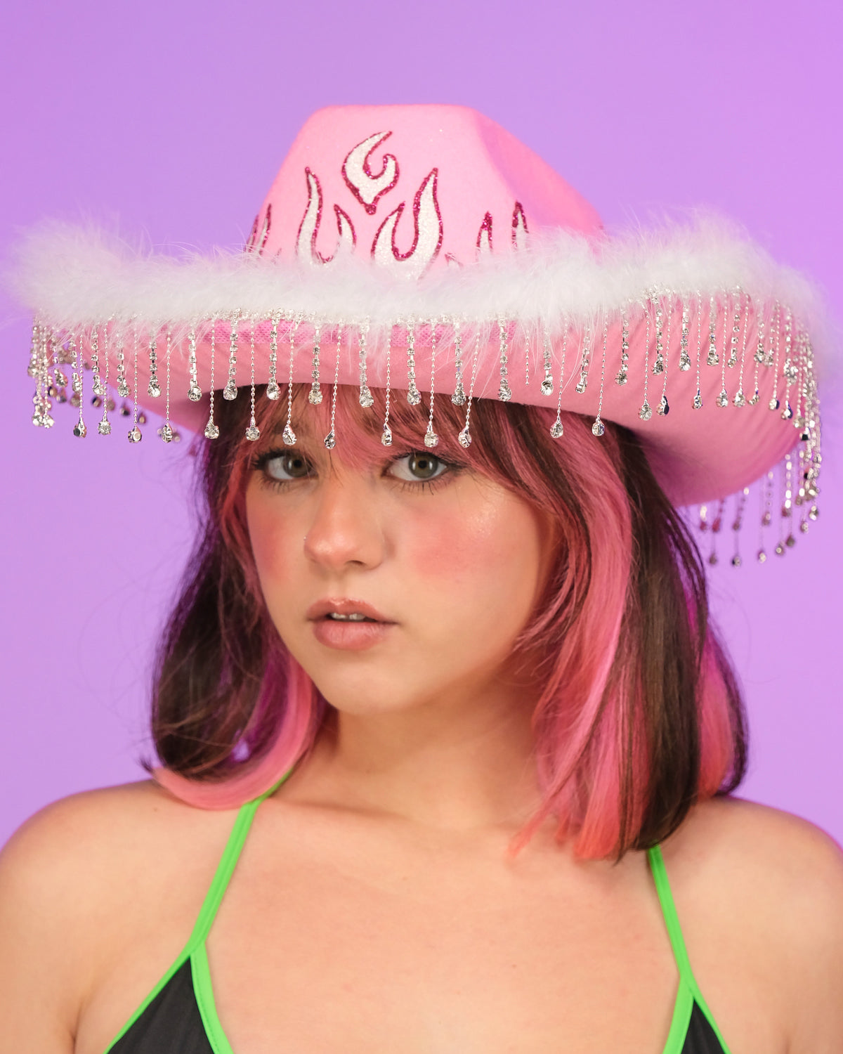 Yippee Ki-Yay! This premium cowboy hat is lined with faux fur and beaded fringe.