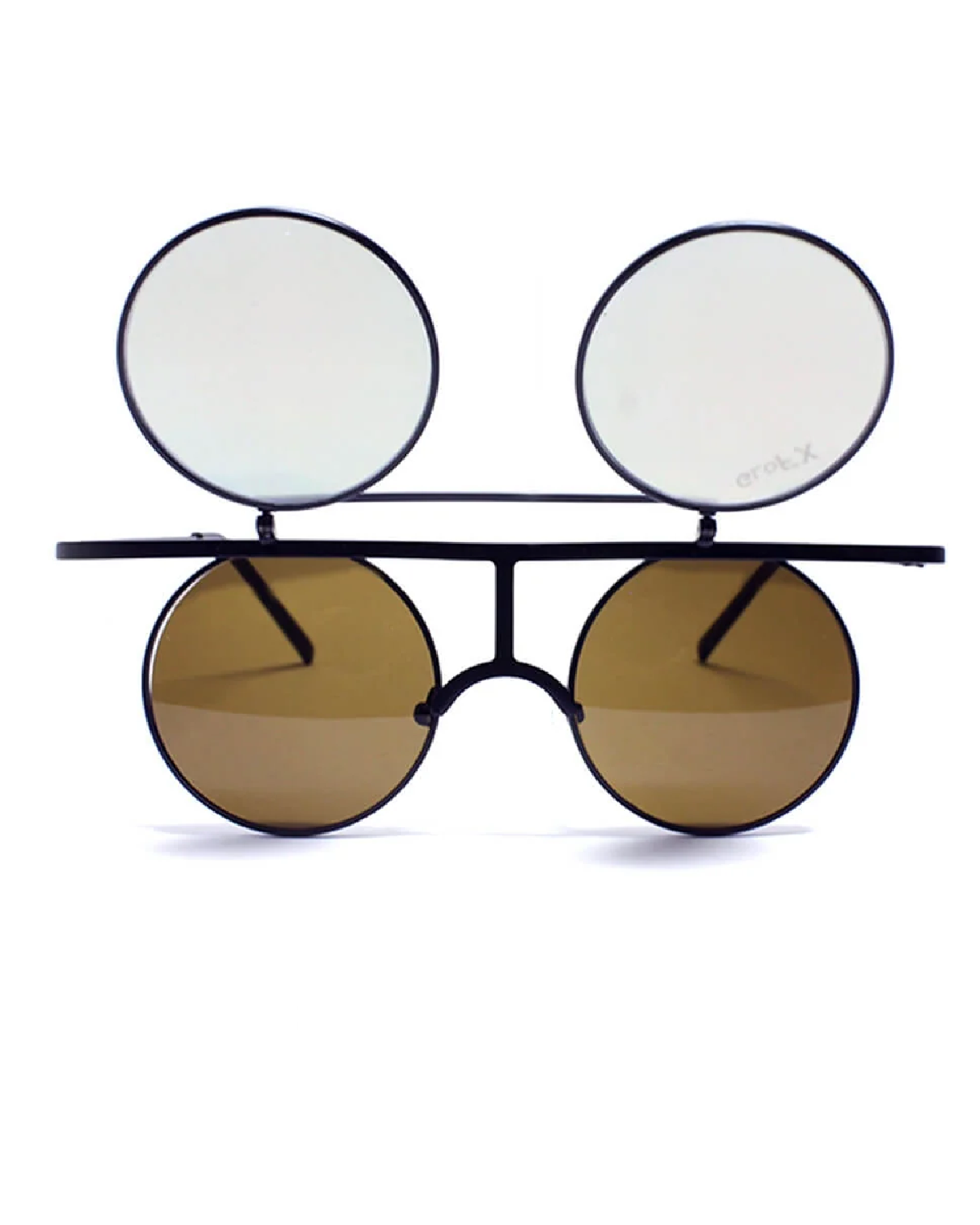 At GloFX we know how important it is to look stylish, while maintaining the ability to achieve a sick visual effect! These rave glasses offer you the choice of diffraction when flipped down, or regular sunglass lenses when flipped up. The base lenses are auburn enhanced and fitted in a cross bar style vintage circular frame. This classic design is in a true metal frame, just like they made in the 70s! The flip-down round lenses feature a reflective silver mirror finish and epic rainbow prism effect. These glasses are perfect for the raver who wants to be able to be able to create an outstanding visual effect with the flick of their wrist!
