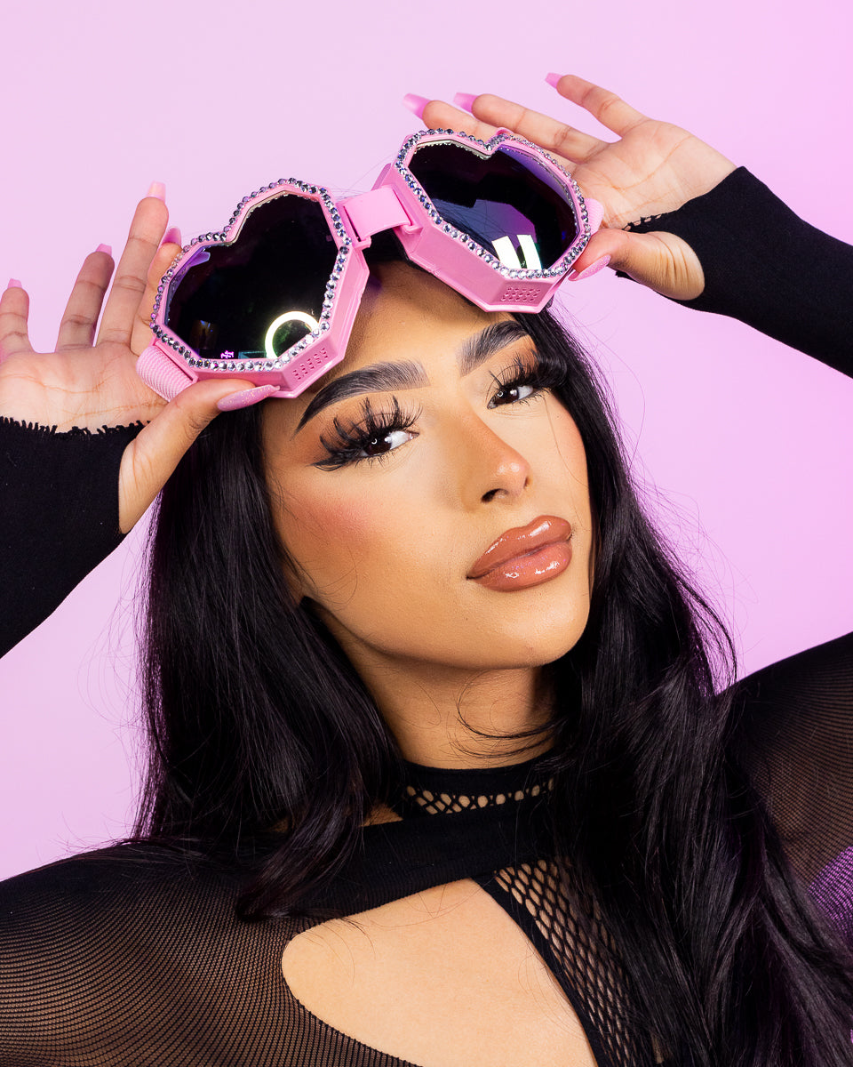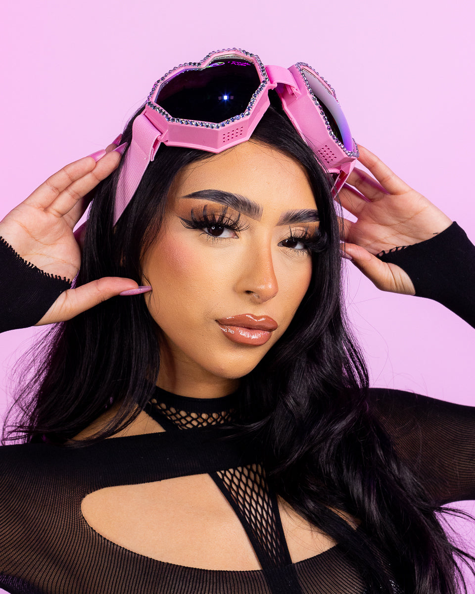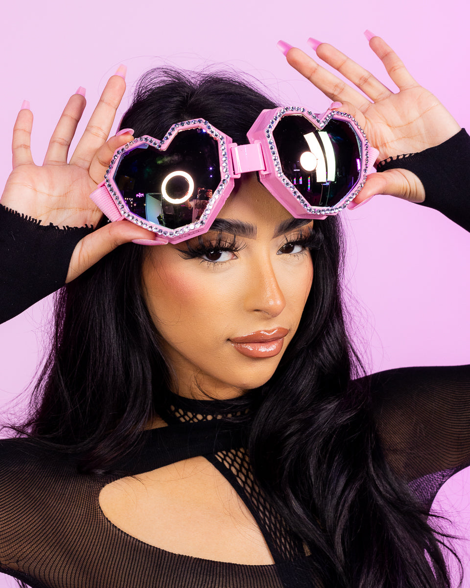 Rise up to the challenge with our I Heart U Goggles! These geometric heart shaped goggles feature rhinestone studded edges and the elastic adjustable strap allows for a comfortable fit. With rainbow reflected lenses, you'll stand out from the crowd and show your daring spirit, while protecting your eyes from the sun and dust. Take on any adventure with style!