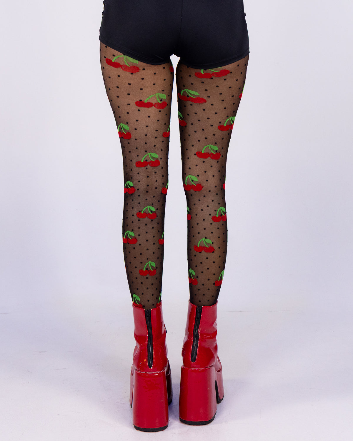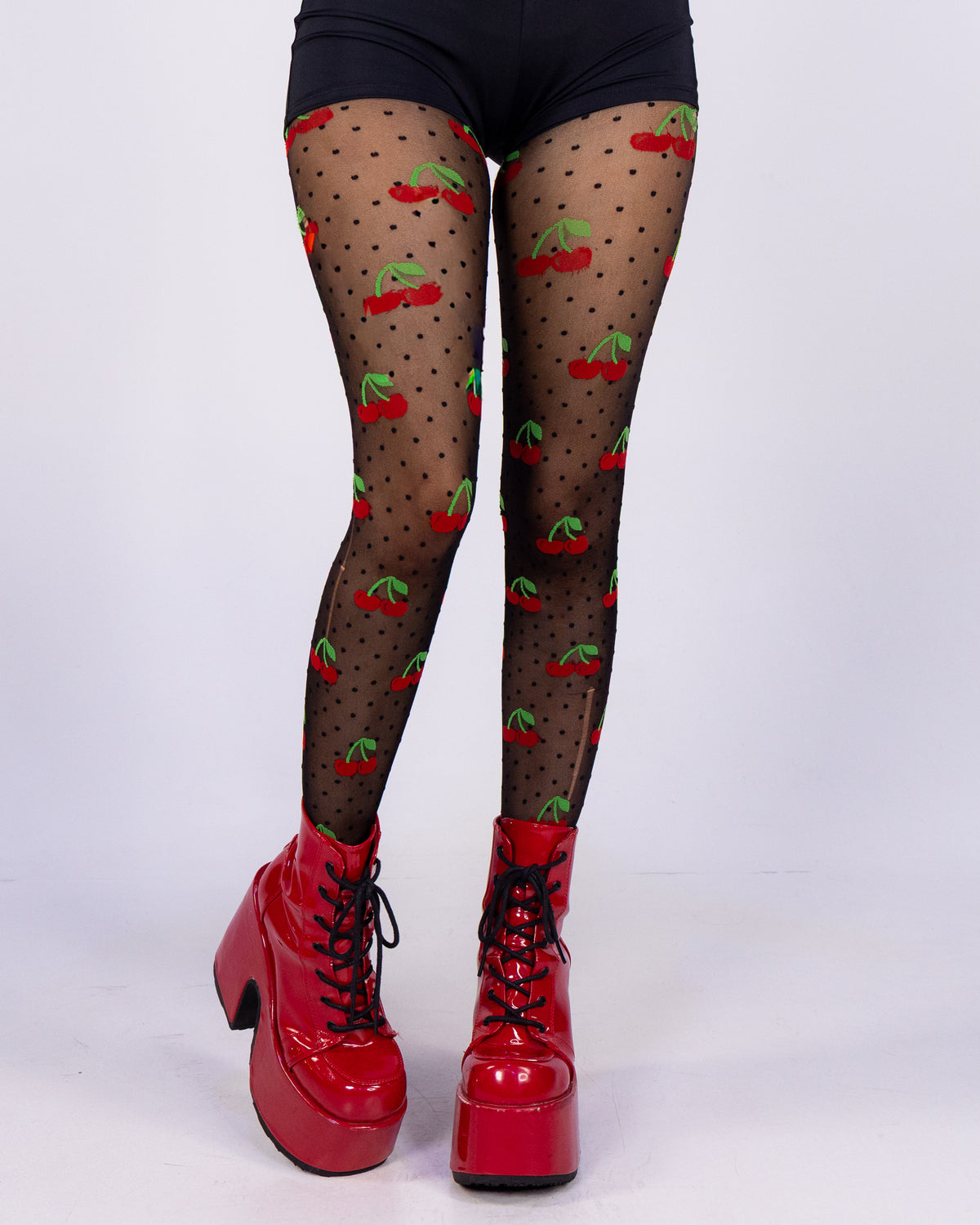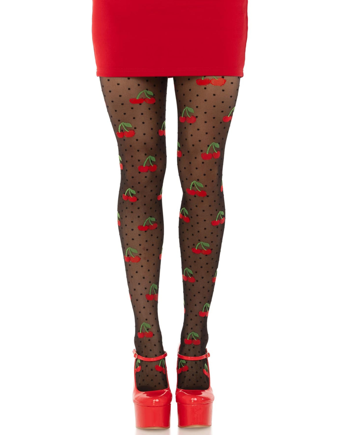 Flirty and playful, these polka dot cherry tights are a rockabilly dream. Sheer pantyhose design and exquisite pattern detail combine for a hosiery look that pairs perfectly with summer styles and date night outfits.