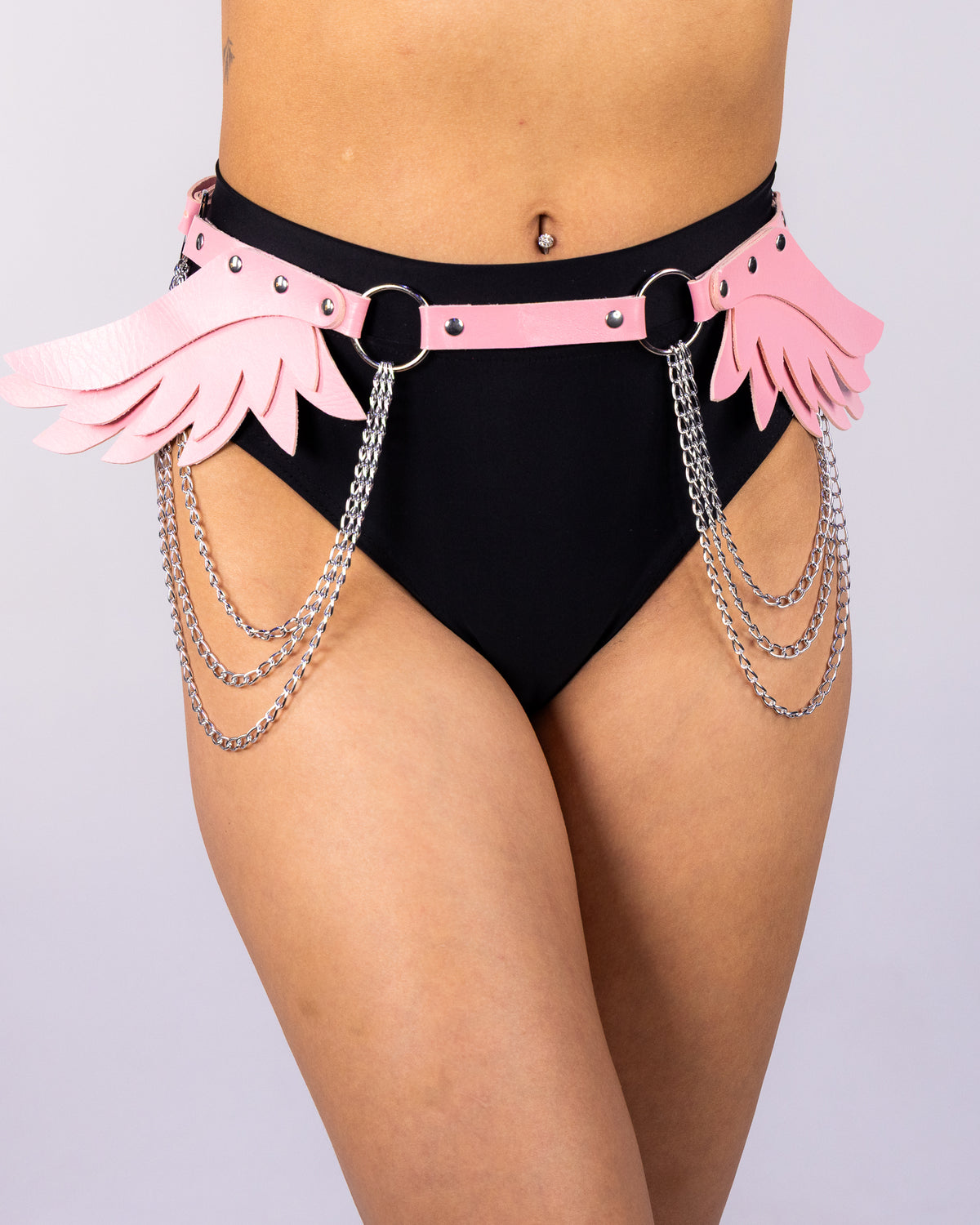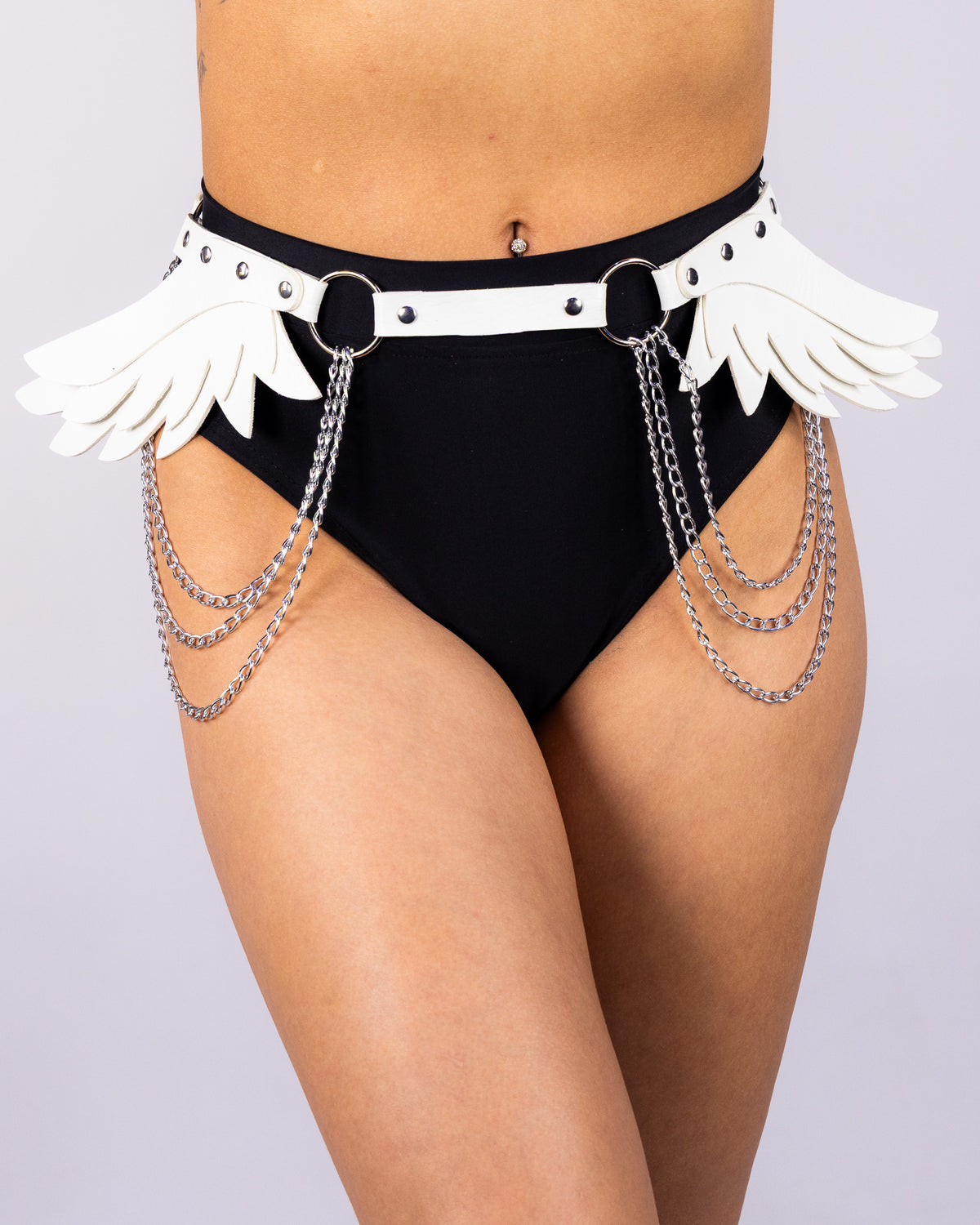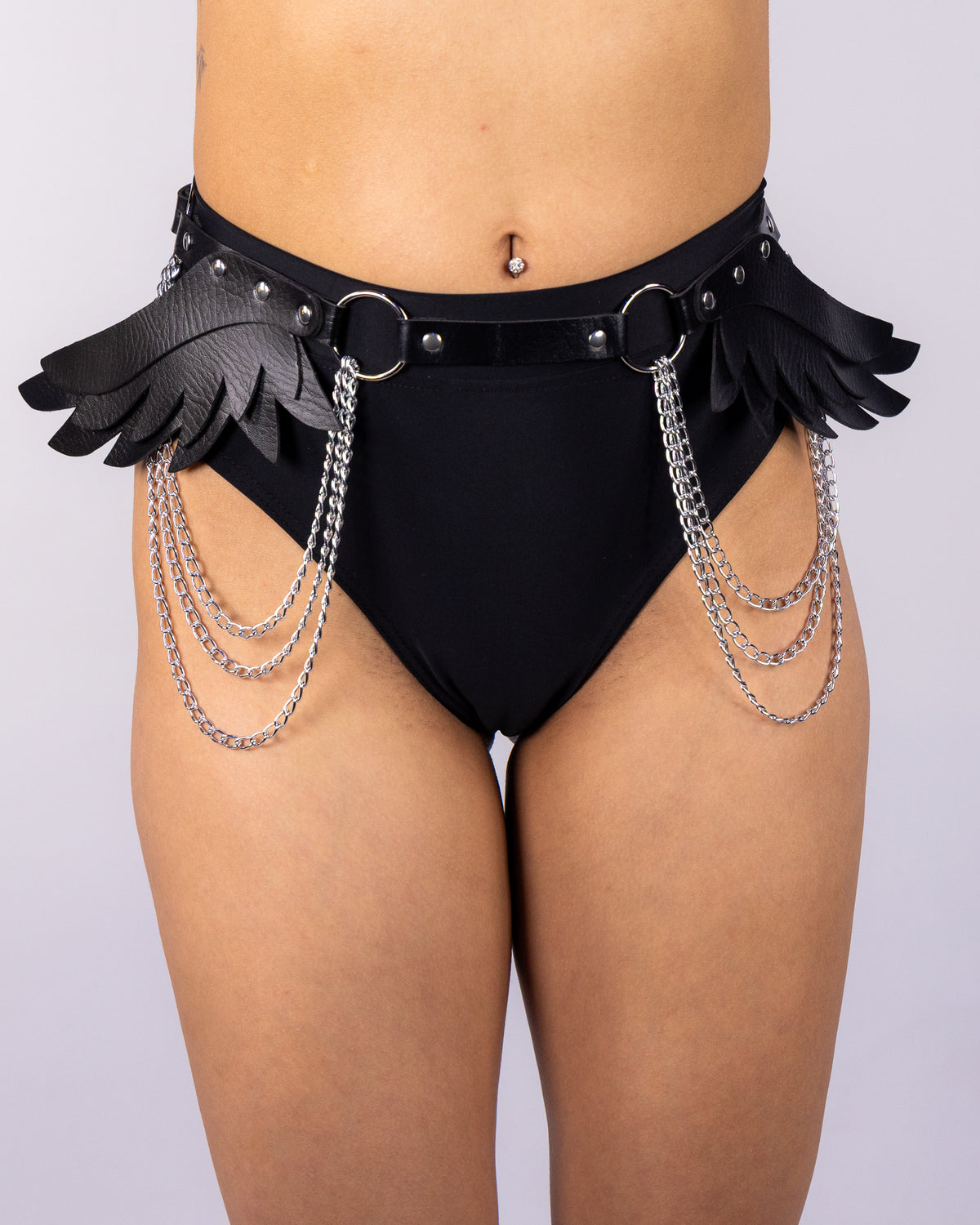 Elevate your rave or festival look with the Heaven Sent Unisex Angel Wing Chained Belt, designed to turn heads from dusk till dawn. Crafted with black faux leather and chains, this belt with angel wings brings a daring edge to your outfit.