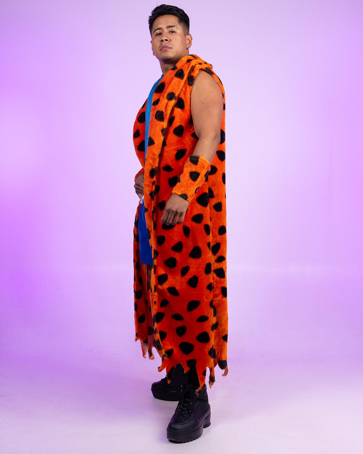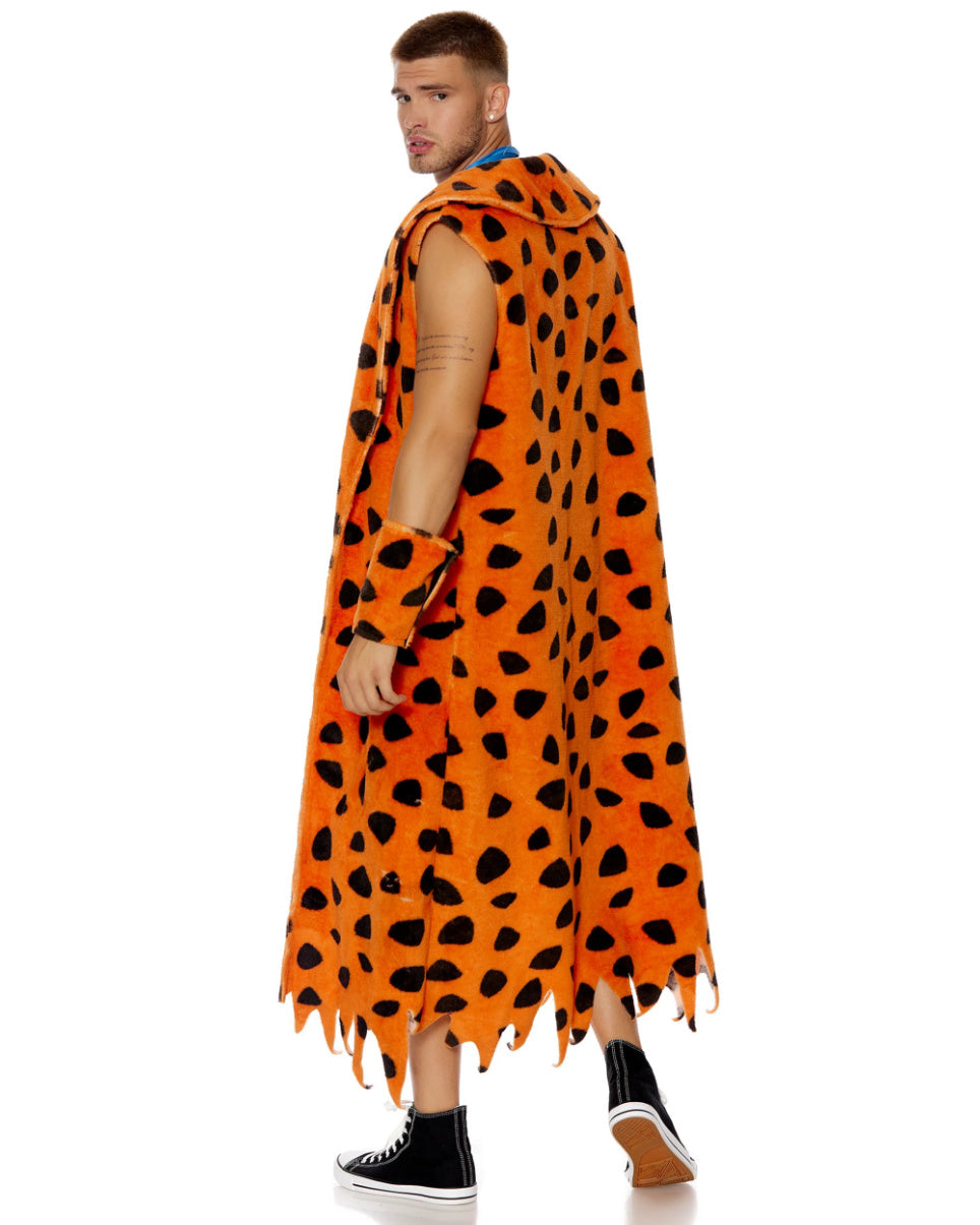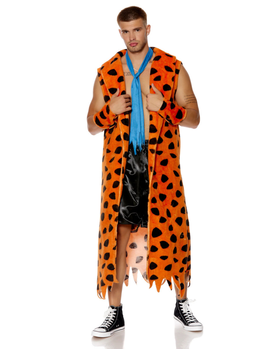 3-piece men's cartoon character costume features faux fur spotted sleeveless fringe robe with matching gauntlets and faux suede necktie.
