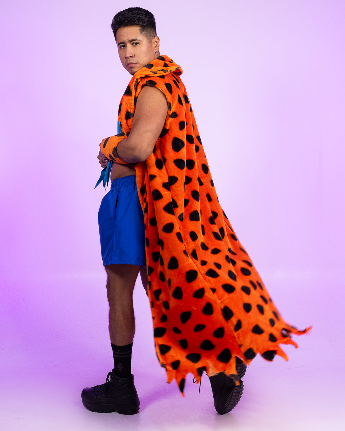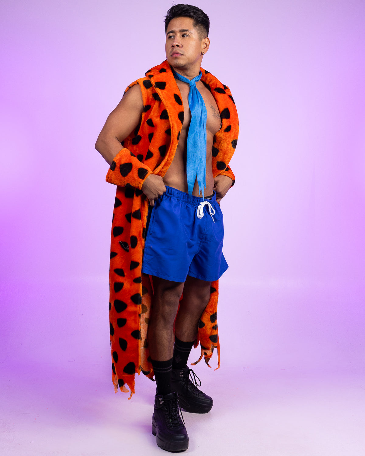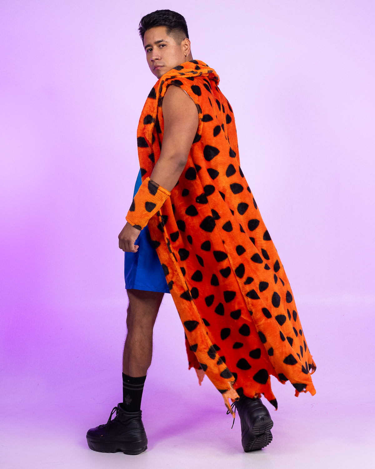 3-piece men's cartoon character costume features faux fur spotted sleeveless fringe robe with matching gauntlets and faux suede necktie.