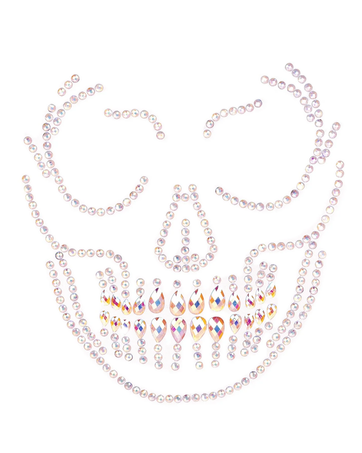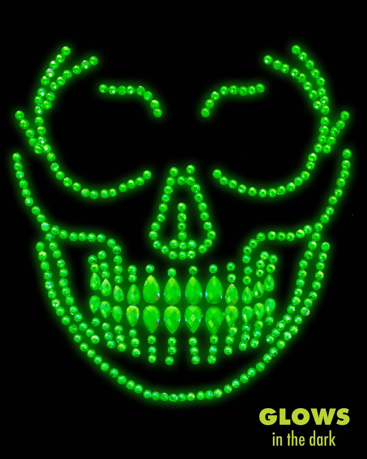Stand out among the mortal souls with the adhesive Glow in the Dark Skull face jewels. Take your skeleton costume to the next level or create a spooky DIY Halloween costume by adding these jaw-dropping glow-in-the-dark body jewels. Perfect for Halloween, themes parties, or any costume event. Skin-friendly and easy to use.