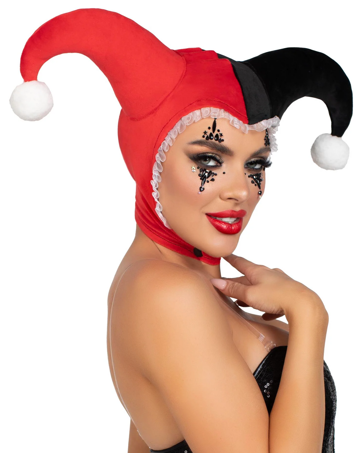 Add a touch of whimsy and mischief to your costume with the Harlequin Jester Bonnet Hat. Crafted from ultra-soft velvet plush, this hat features charming pompom accents and a flirty ruffle trim that perfectly capture the playful spirit of a classic jester.