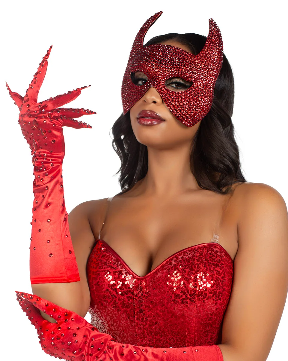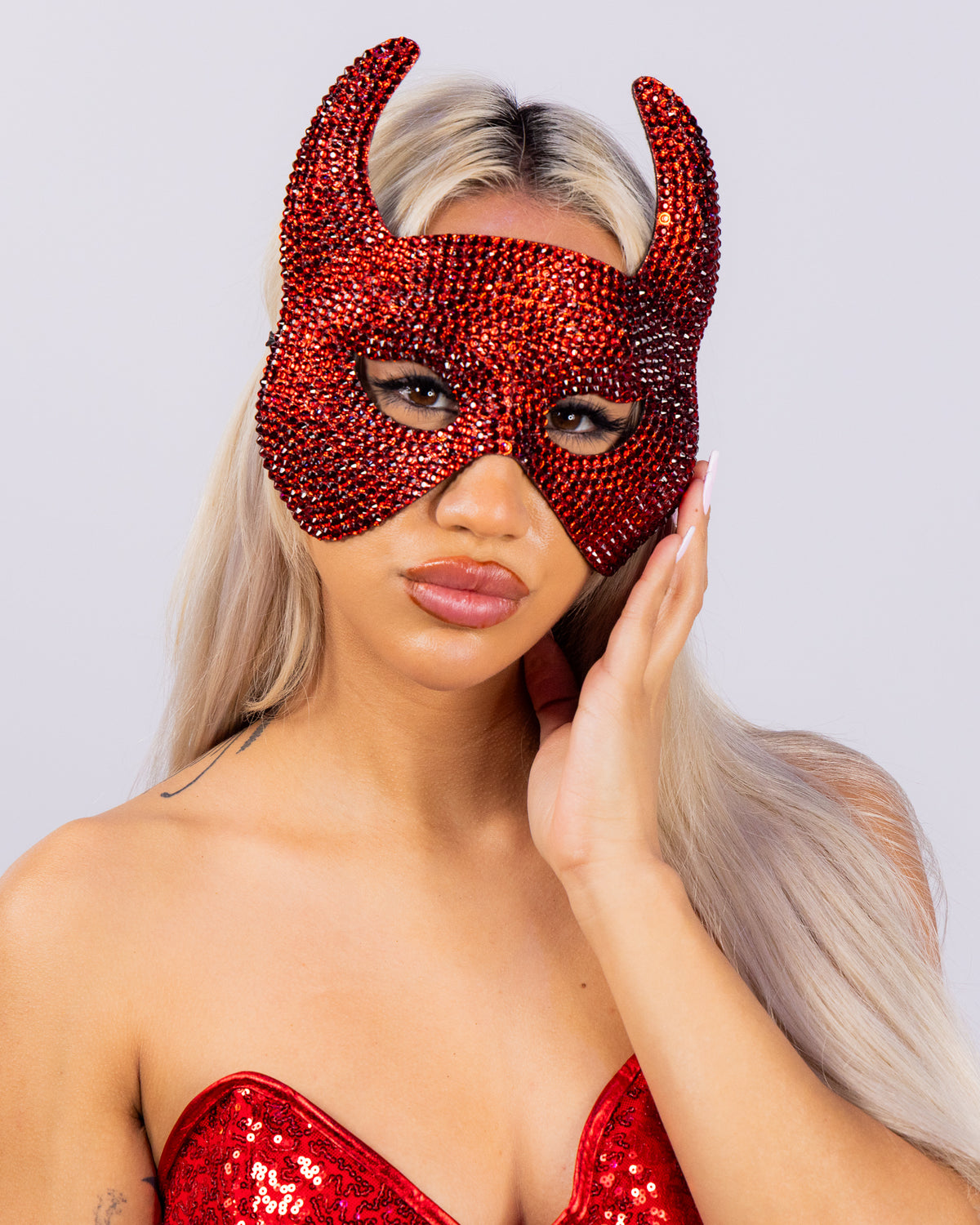 Take your devil costume to the next level with this shimmery rhinestone devil mask. The molded mask features stunning rhinestone detail with a soft back and elastic strap for comfortable wear.