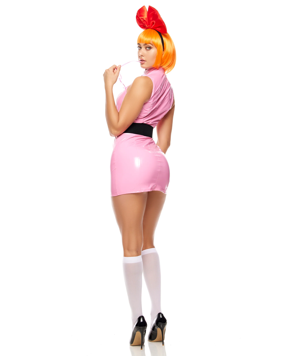 Turn heads with the Spice Nice Women’s 5pc Cartoon Costume. This daring set includes a zip-front mockneck vinyl mini dress paired with a wide buckle belt to define your silhouette. Complete your look with coordinating socks, playful pom pom hair accessories, and stylish glasses that add a fun, flirty edge. Perfect for making a bold statement at any party or event.