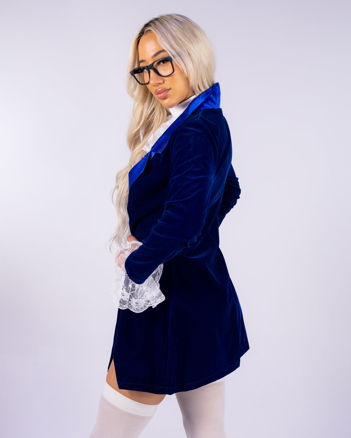 Even Dr. Evil won’t be able to resist your charms in the bold blue velvet suit dress with split hem, satin lapels, and plunging V neckline. The lacy cuffs, lace neck piece and faux frames take this naughty look to the next level.