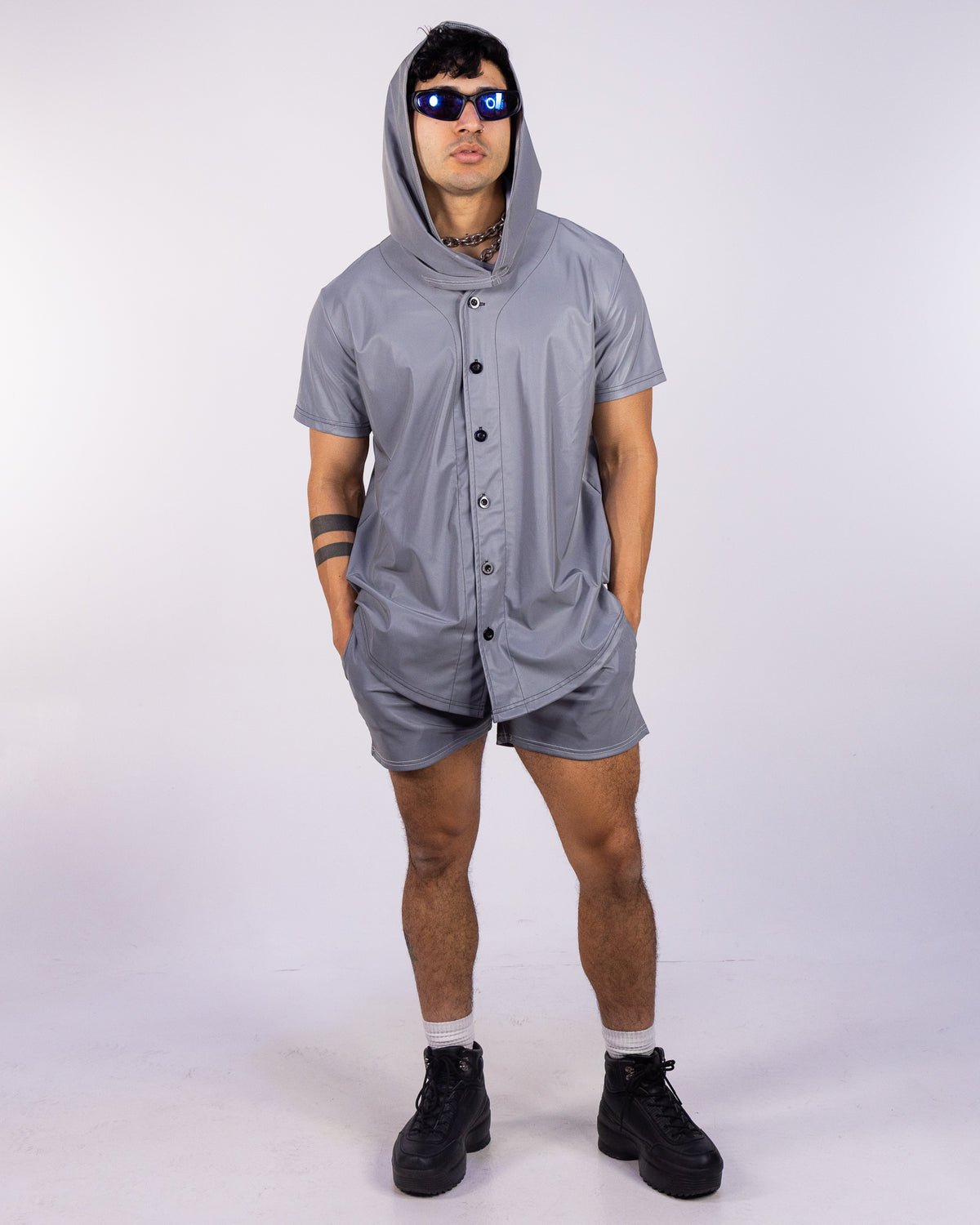 Stand out and take risks with our Silver Flash Reflective Hood. Made of flash reflective print fabric, this hood will light up in the night at any rave, concert, or music festival. Be bold and adventurous with this perfect accessory that will make you shine.