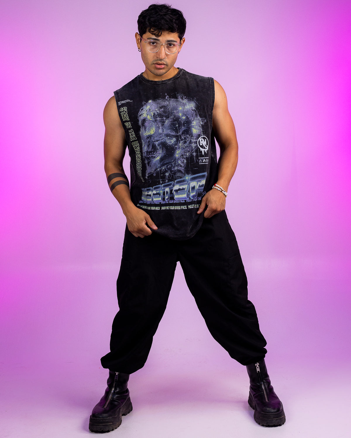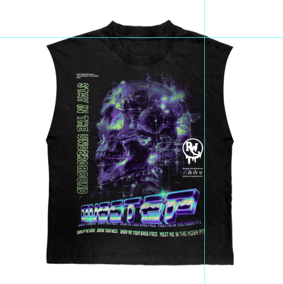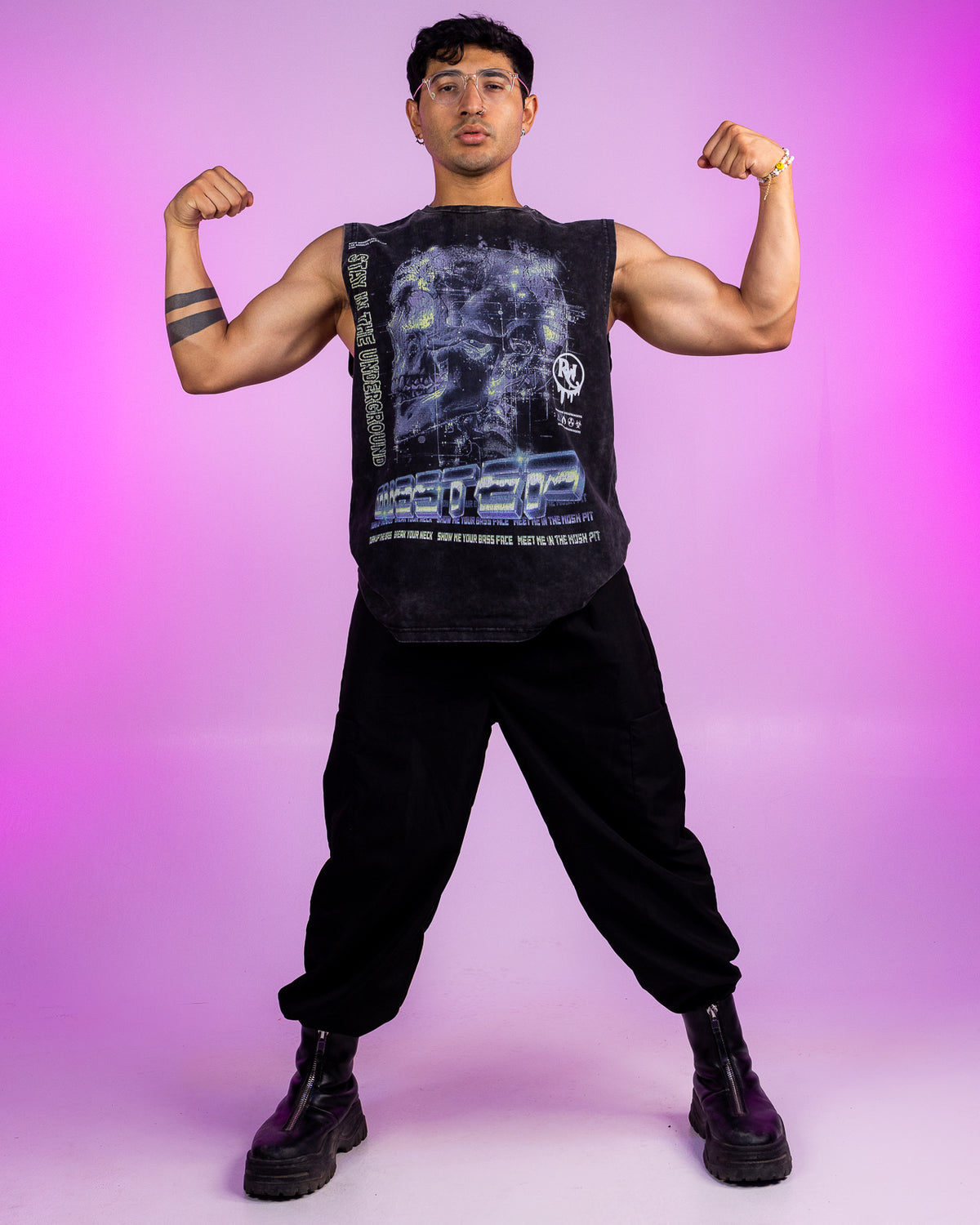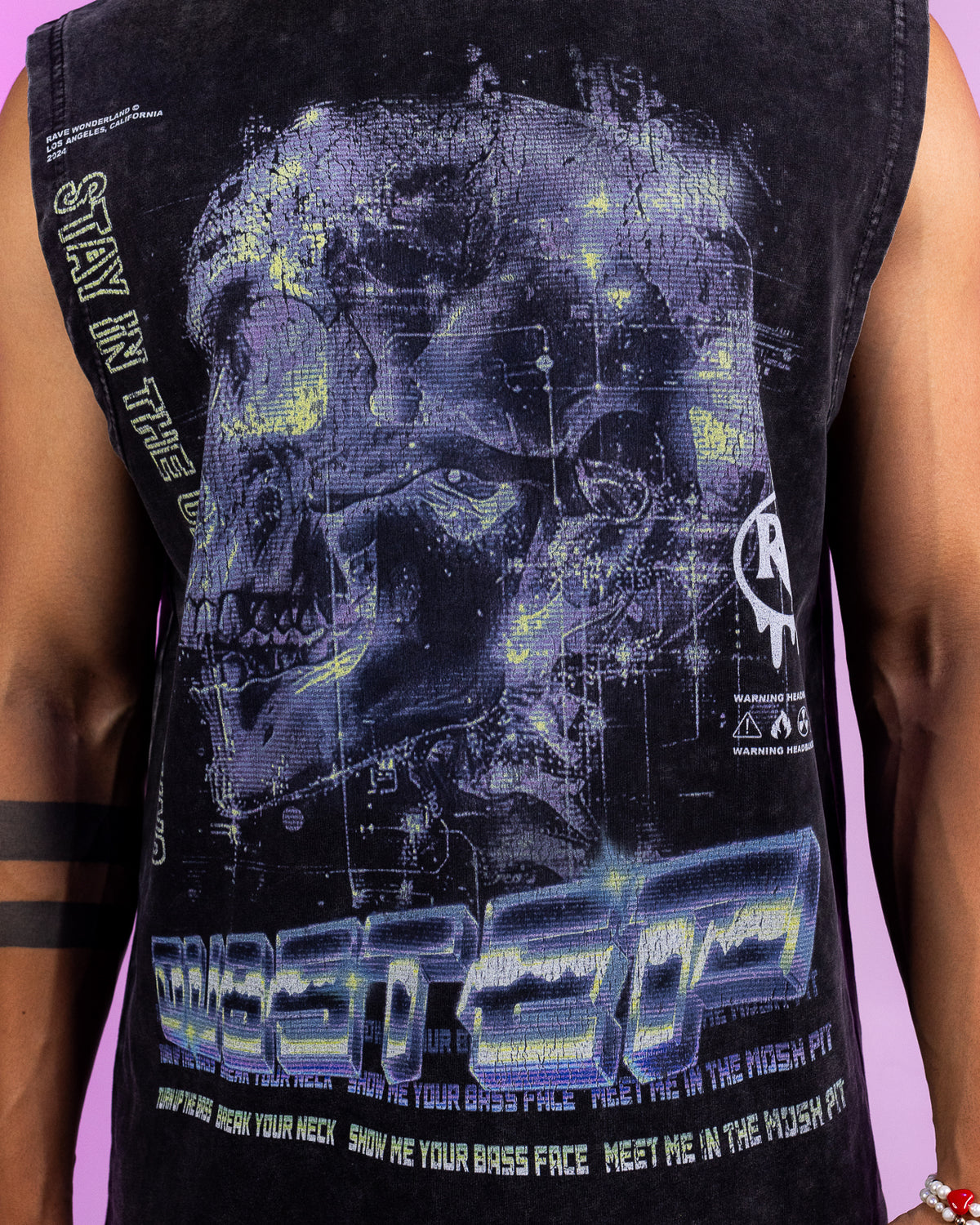 Take your style to the next level with our Acid Wash Dubstep Muscle Tee! Get ready to stand out at raves and festivals with this trippy skull graphic and bold acid wash design. Don't let sleeves hold you back - show off your daring and bold fashion sense with our sleeveless muscle tee. Take a risk and rock this unique and edgy piece!