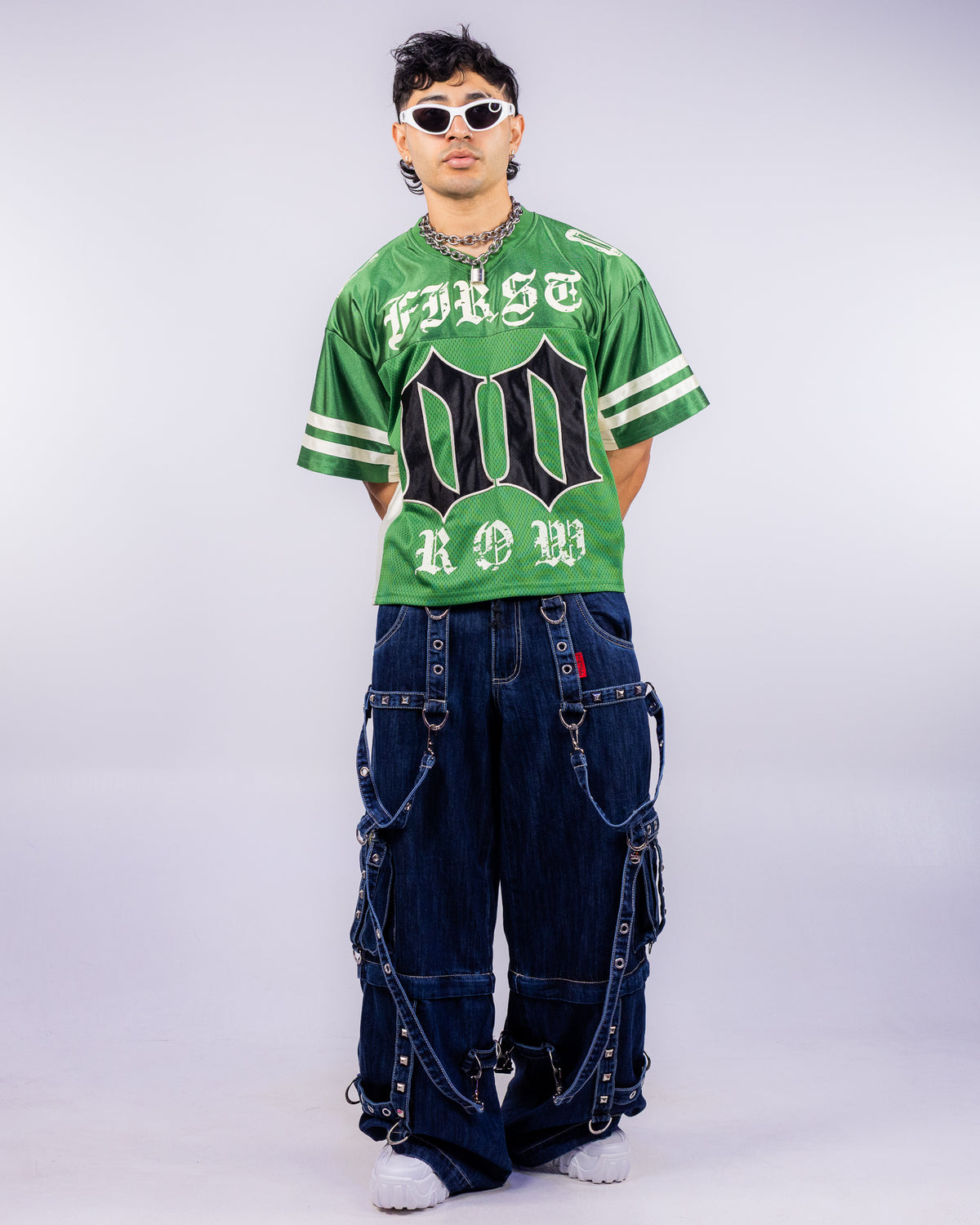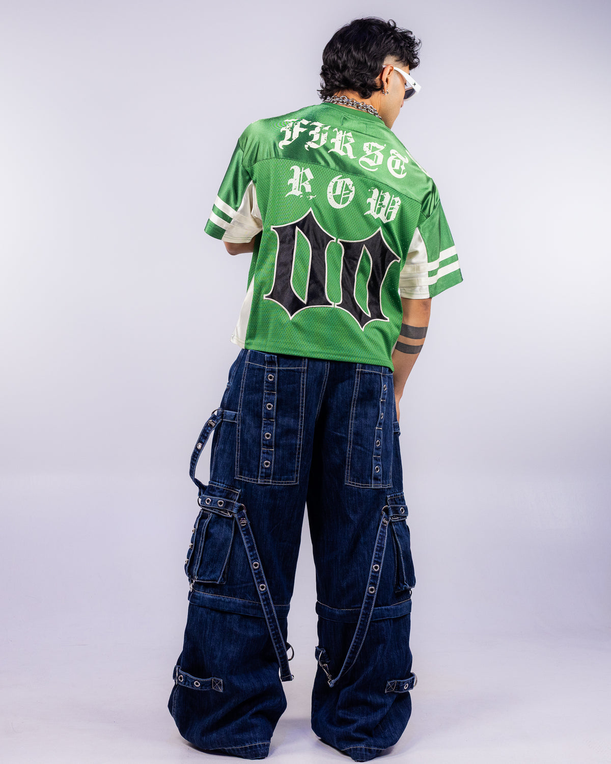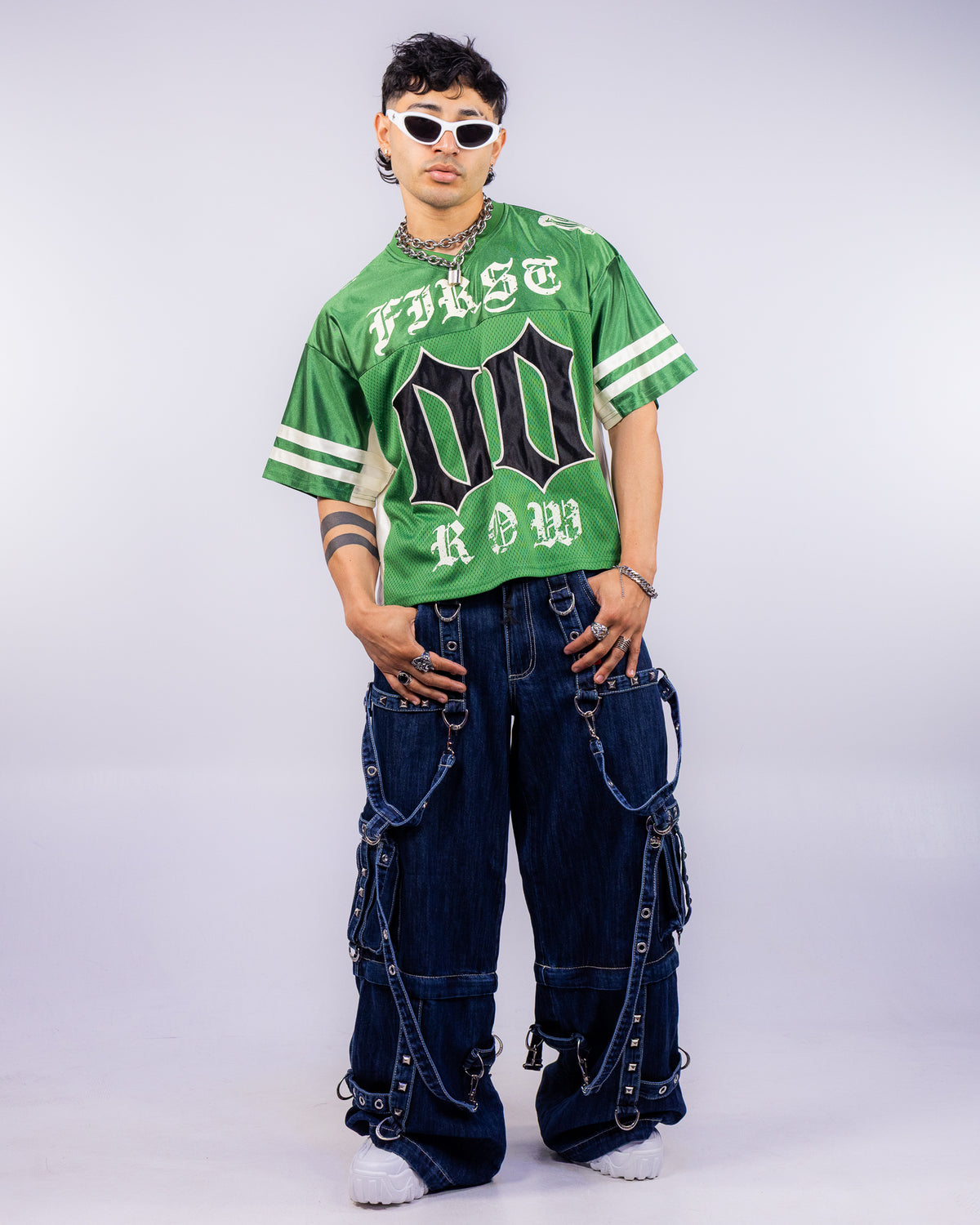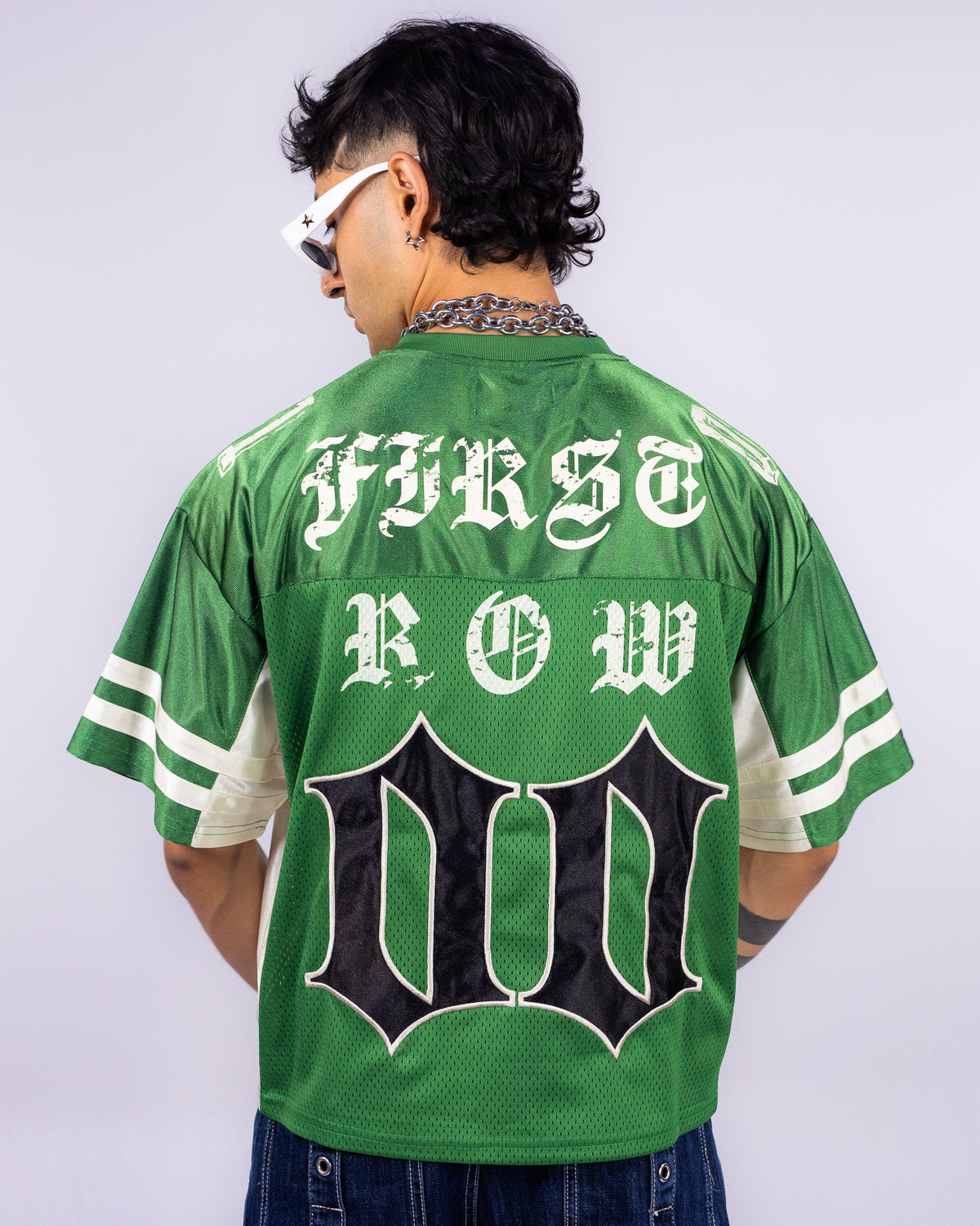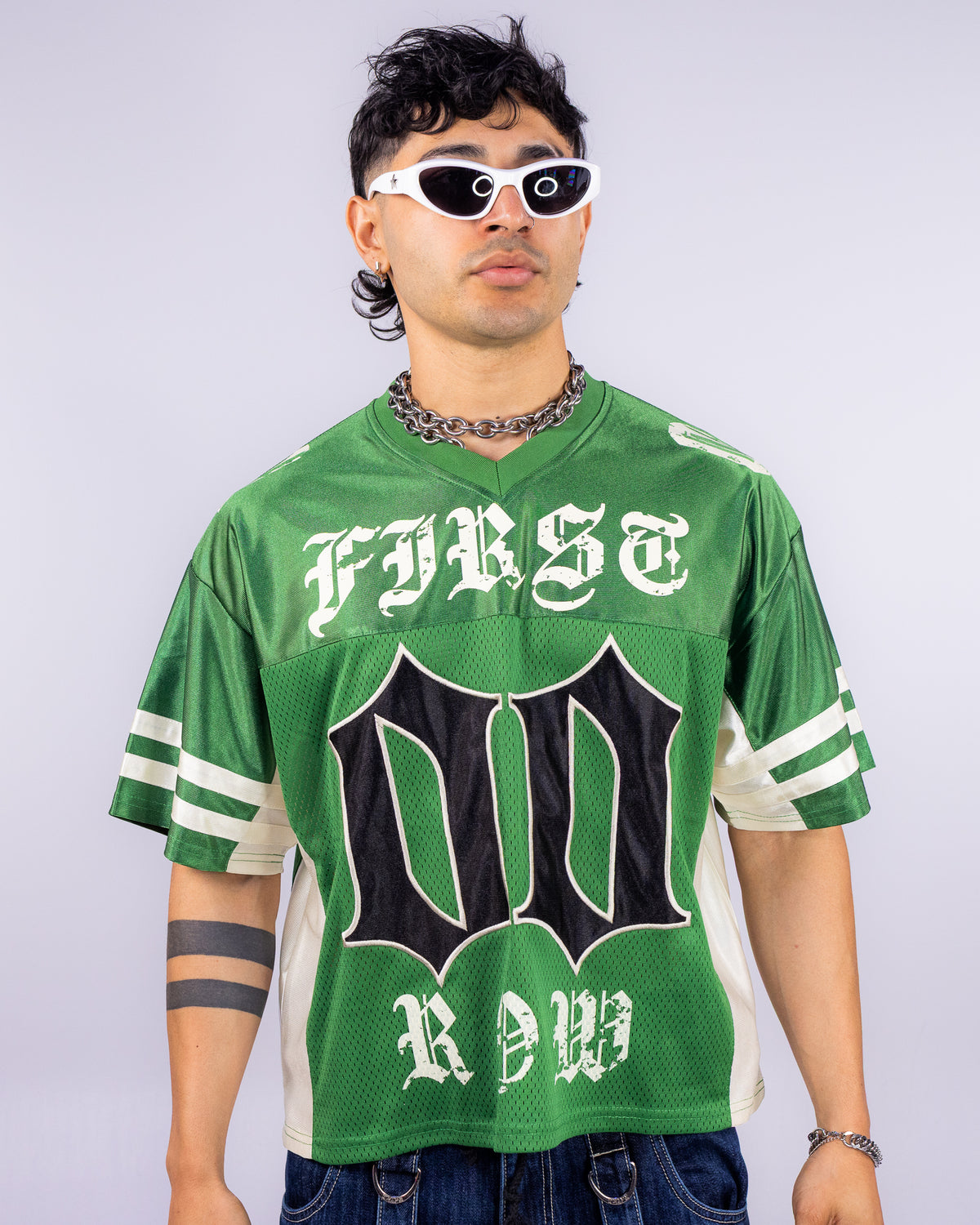 Whether you're shopping for a tomboy or any guy in your life, this green and cream football jersey are the perfect casual piece to have in your rave or everyday wardrobe for a little Y2K throwback! Featuring multi patches, applique embroidery and ribbed neck..