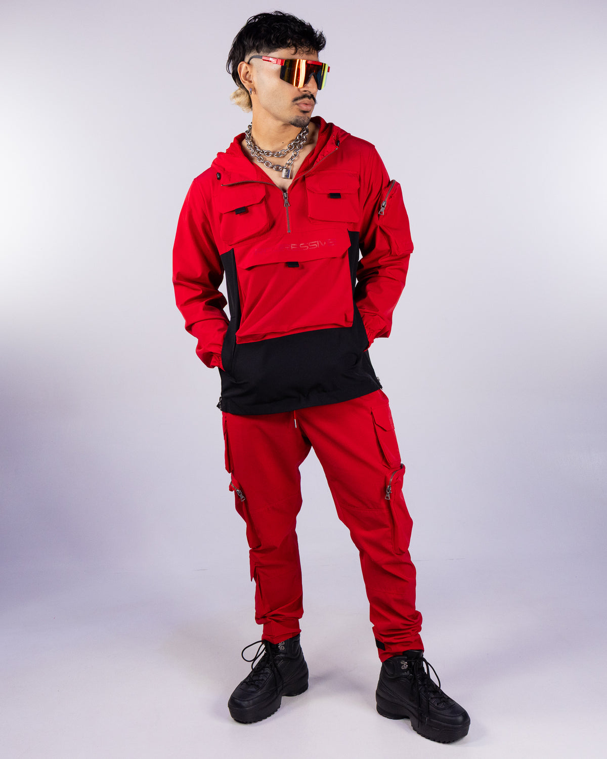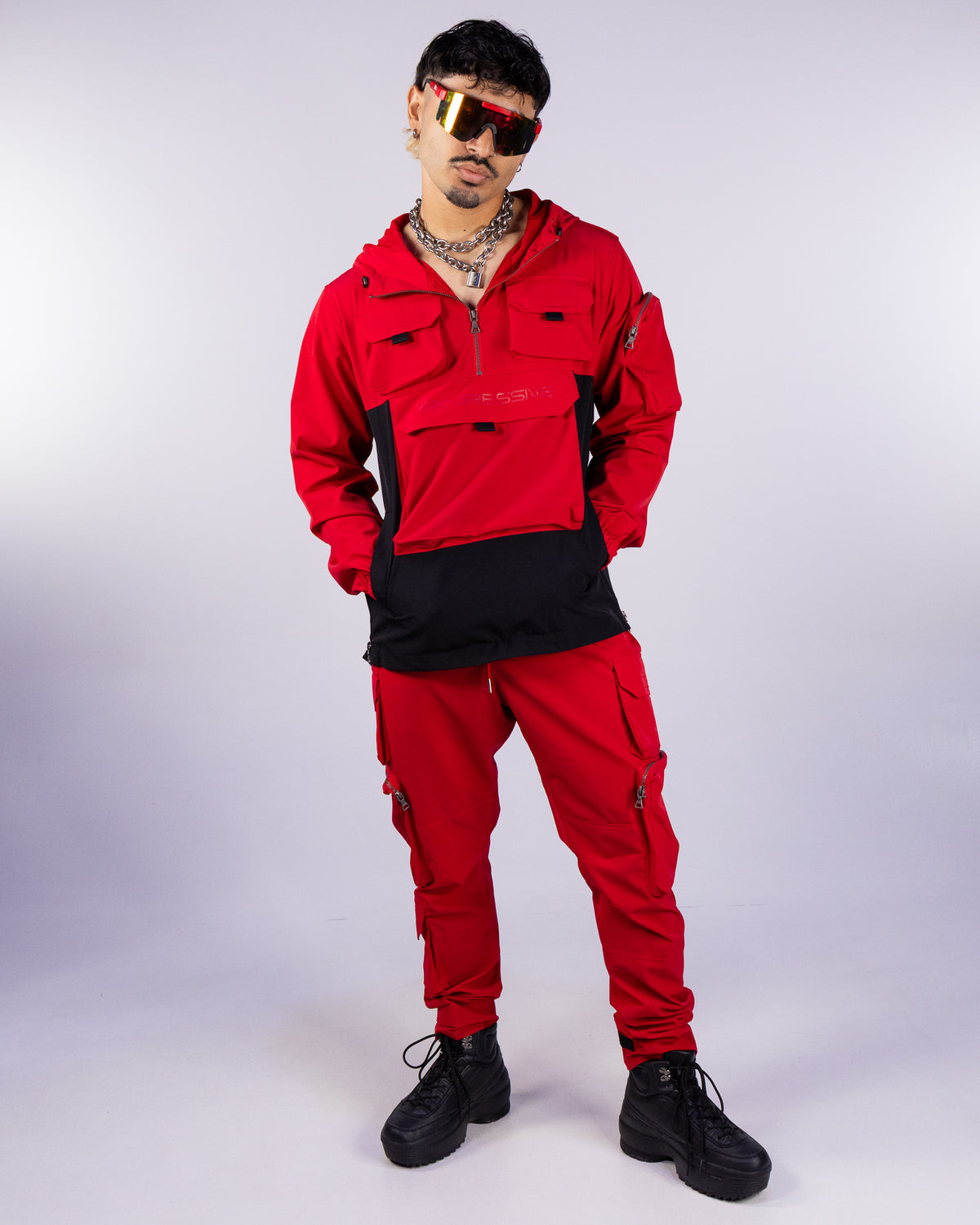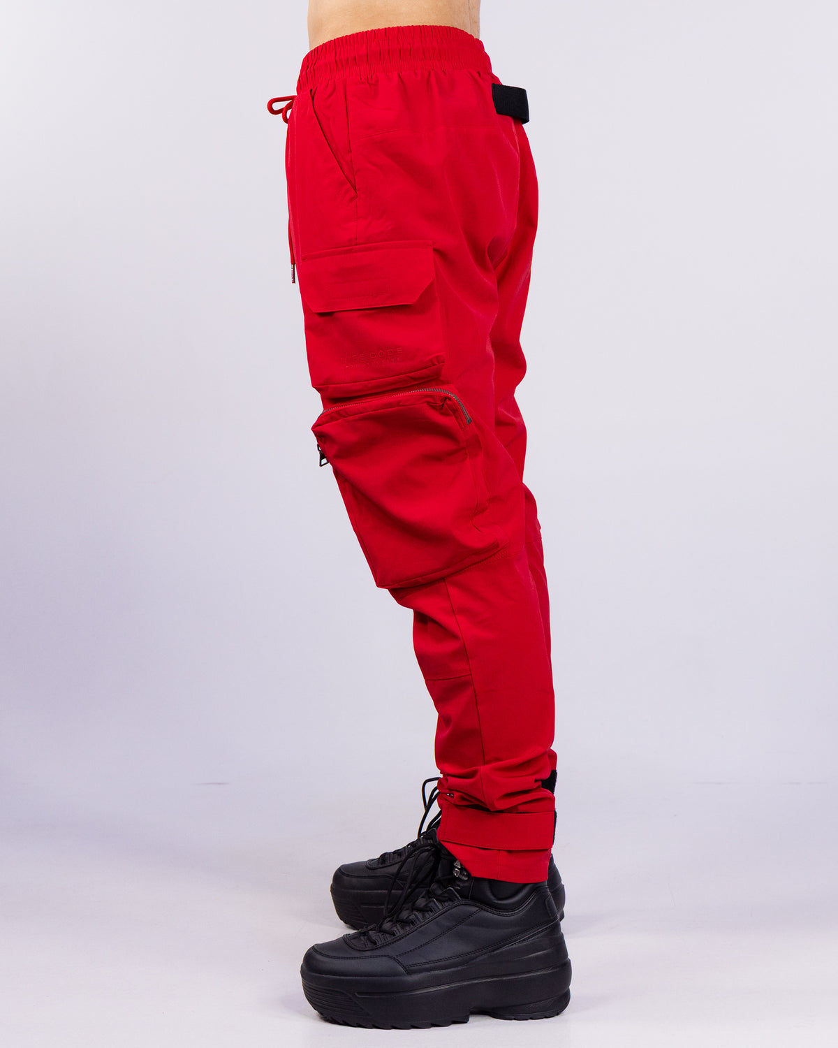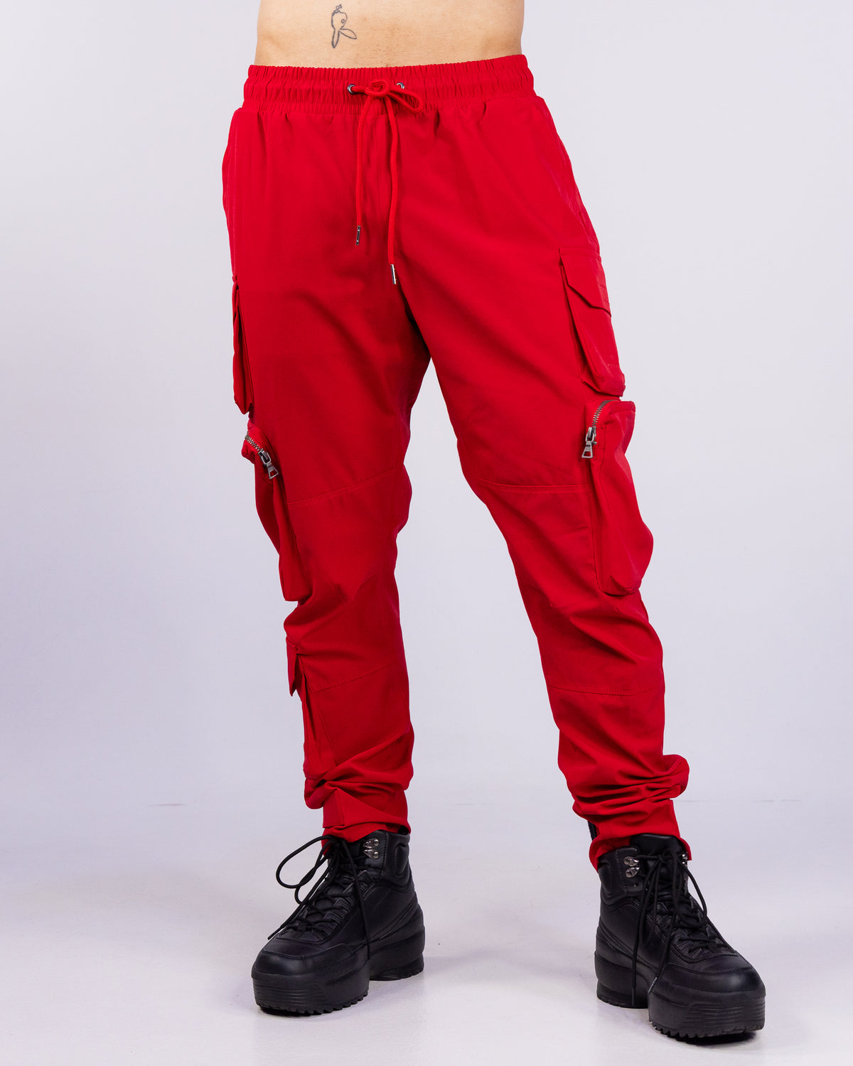 Upgrade your streetwear game with our Red Cargo Pants. These multi-functional cargo joggers are perfect for festivals and raves, with secure zipper pockets to keep all your essentials safe. Elevate your style with these exclusive pants that add a touch of luxury to any outfit.