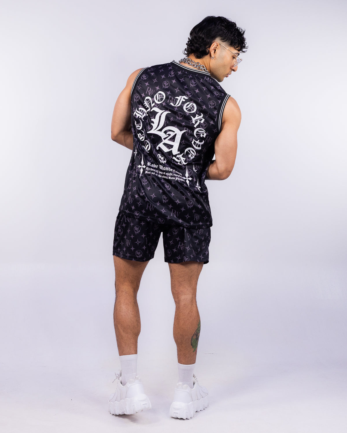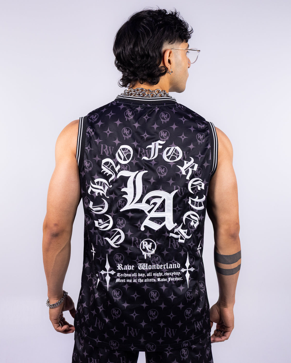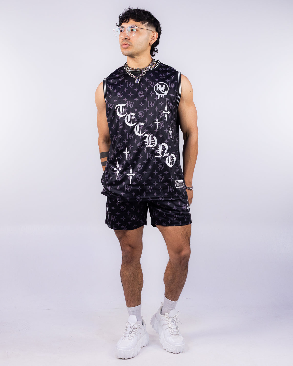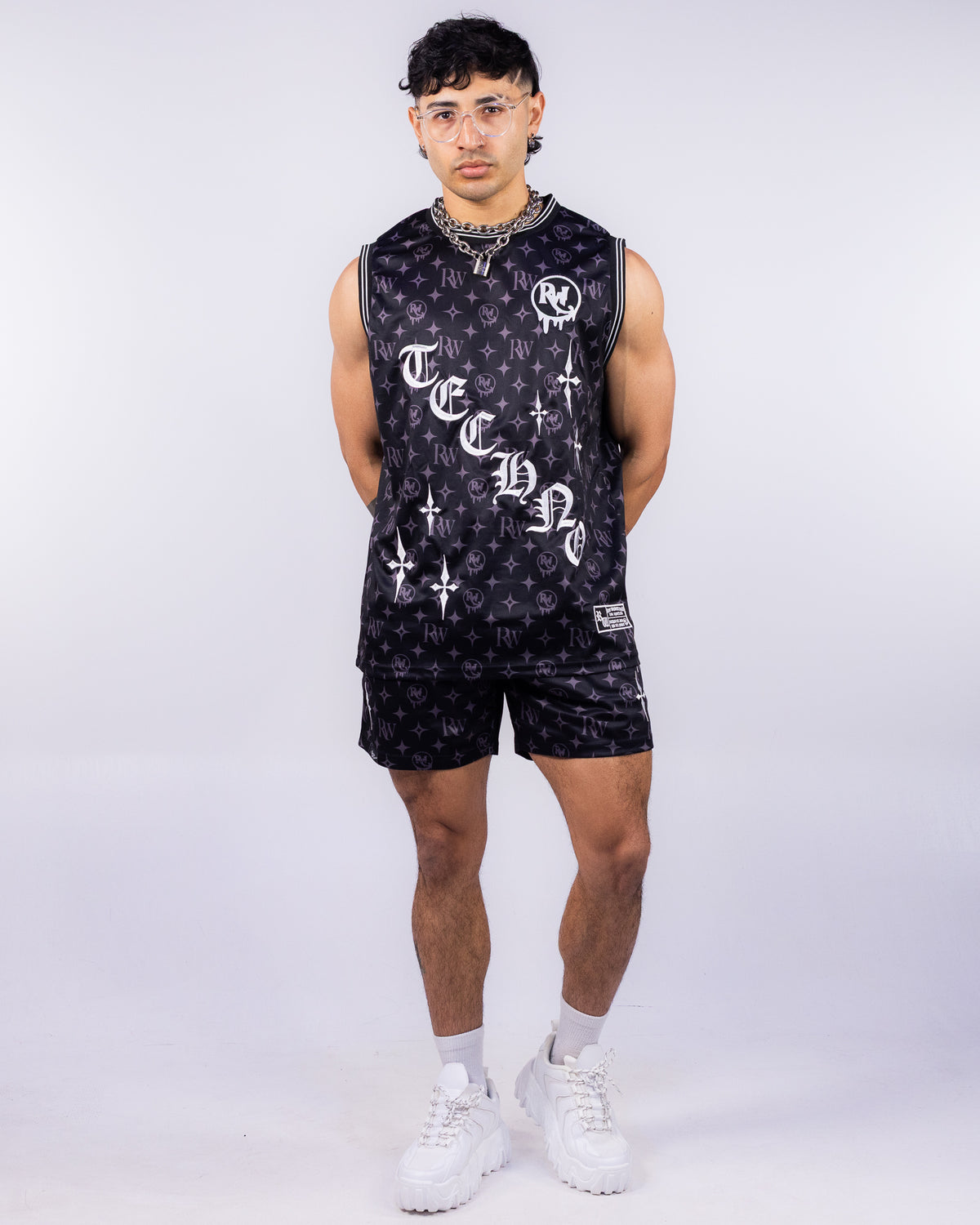 Time to show off those guns and celebrate techno music in style with this breathable, sleeveless basketball jersey, perfect for summer festivals or sweaty undergrounds. Featuring a neutral allover print and techno-inspired Old English design, this jersey is perfect for raves, music festivals, and any adventure on the court. Don't sleep on this one before it's gone!!!