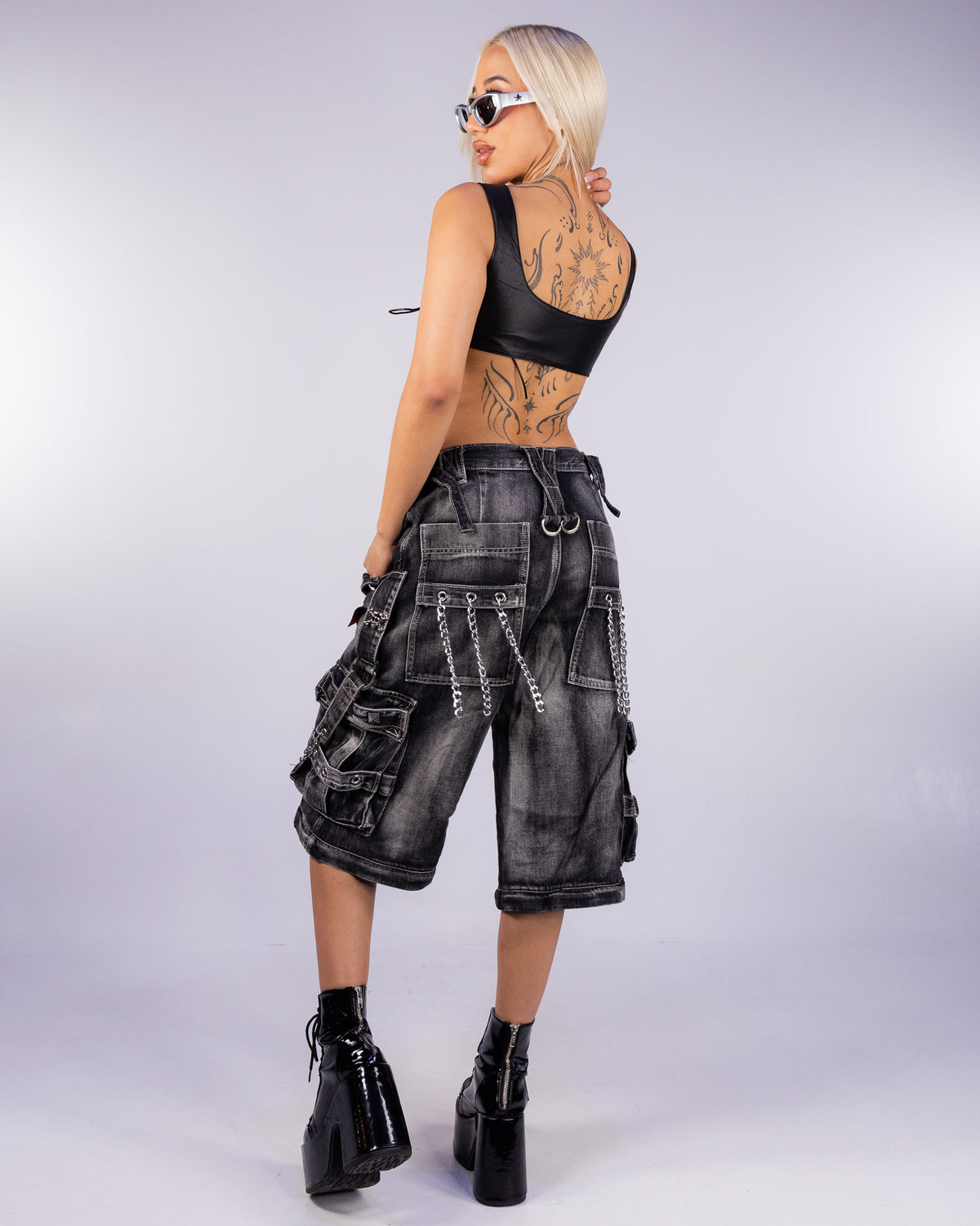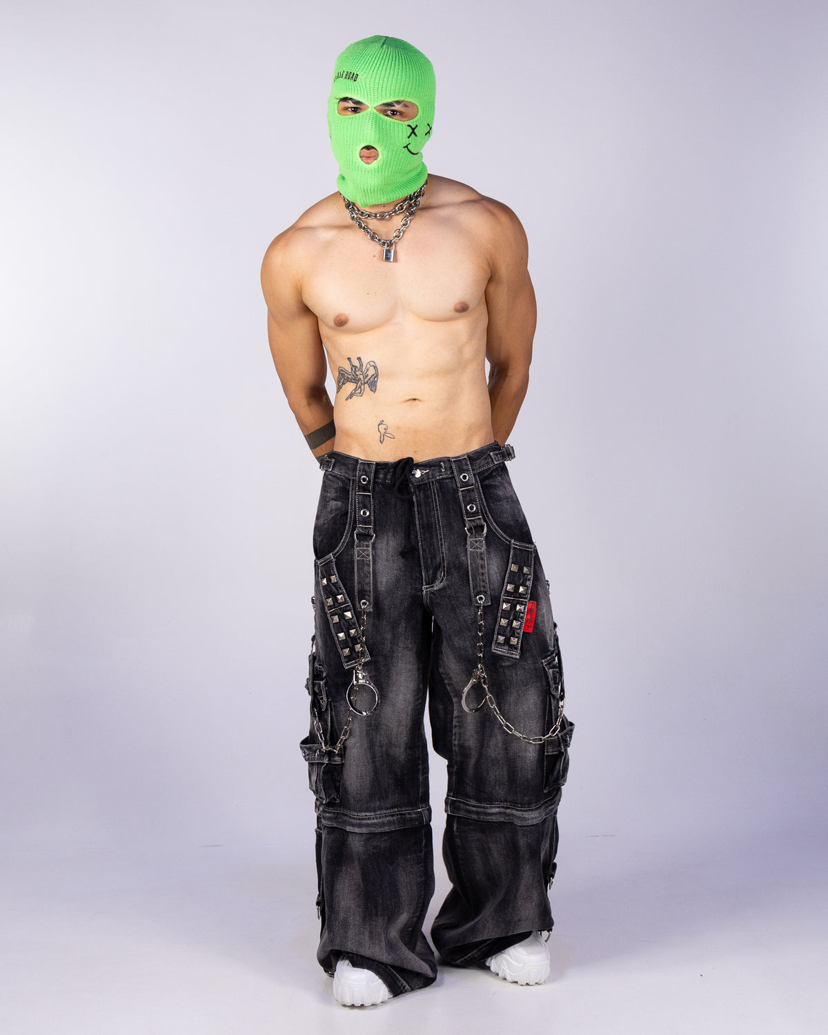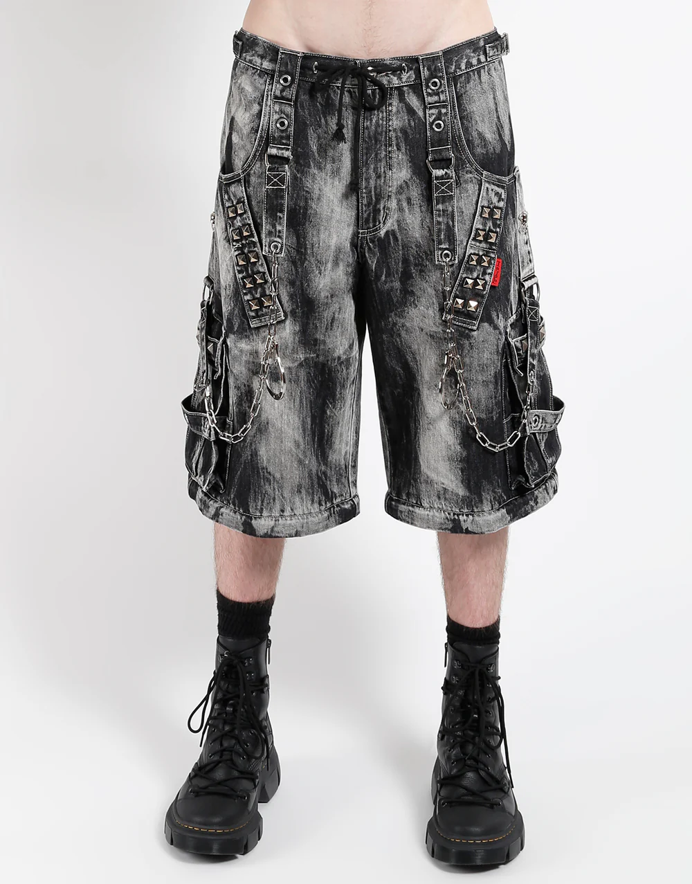 These black denim storm wash pants zip off into shorts and feature removable chains and handcuffs, adjustable ankles, studs, and deep pockets.