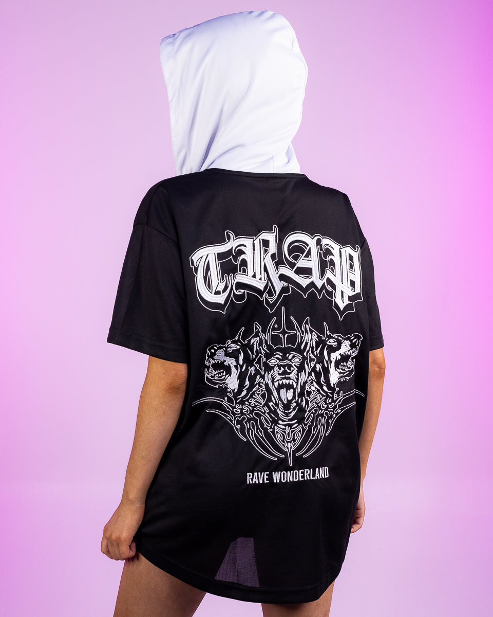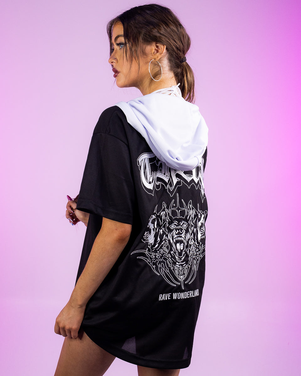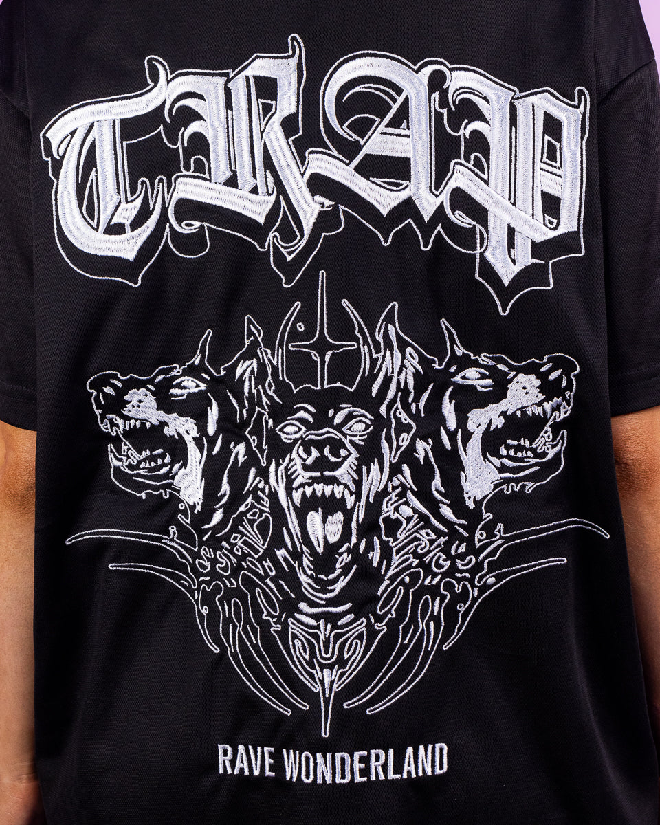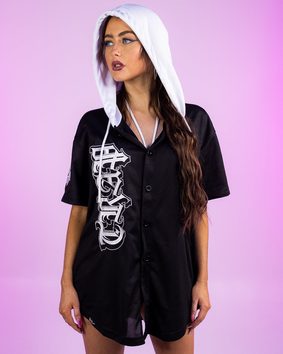Get the best of both worlds with the Trap Hooded Baseball Jersey. Made from soft, breathable baby pink fabric, this button-down jersey is perfect for staying comfortable while looking stylish. The added hoodie adds an extra layer of coziness, and the intricate three-headed dog design on the back adds a dark edge.