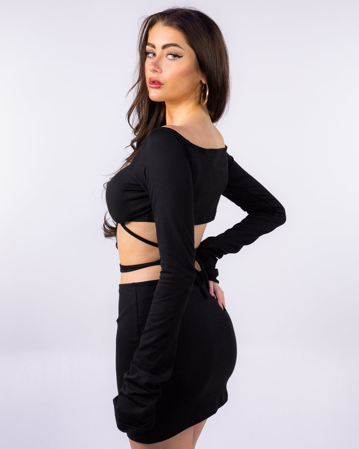 Bring the party wherever you go in our Black Frequency Women's 2pc Skirt Set! Our ultra cropped top hugs your curves and the matching bodycon mini skirt is a guaranteed showstopper. A ruched detail keeps it stylish and the center tie gives it a little something extra. Effortlessly transition from day to night with this must-have set. Don't miss out on being the talk of the town, grab yours today!