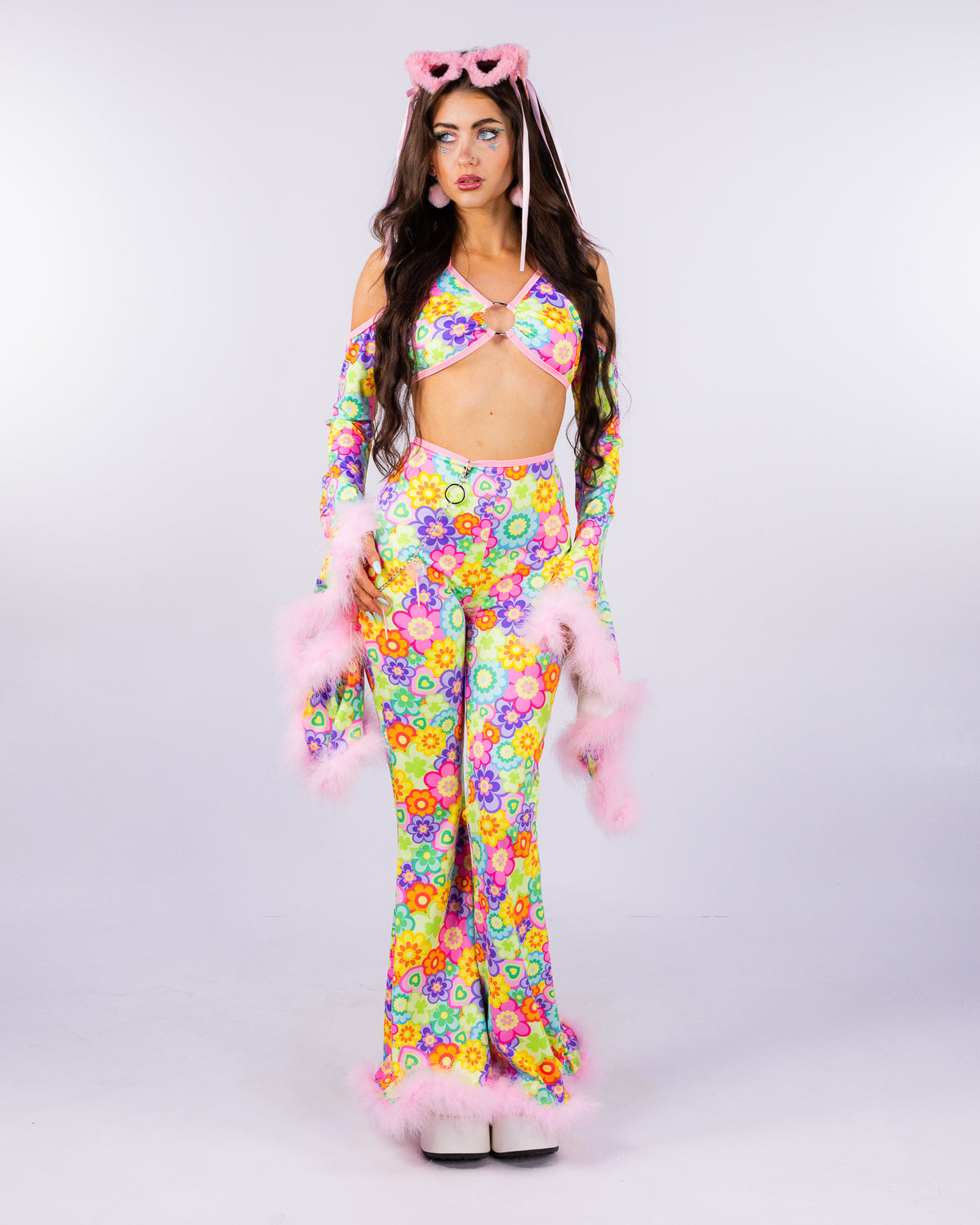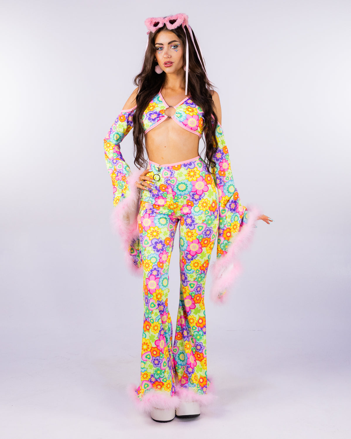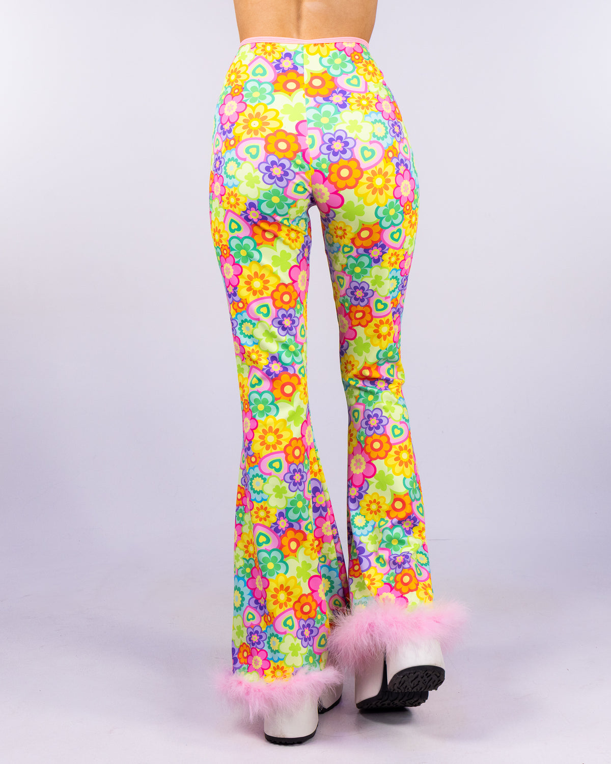 The Flower Power Bell Bottoms features a flowy flare cut and is made of mesh, perfect for adding extra coverage without the extra heat! The pants are hemmed with soft fluffy faux fur at the bottom. Search "Flower Power" to shop the whole collection and effortlessly build your fest fit!