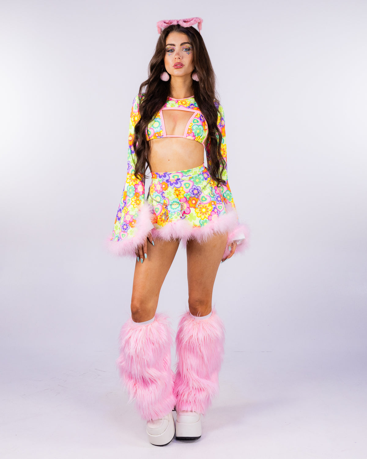 The Flower Power Faux Fur Trim Mini Skirt features a flattering skater skirt cut with super soft baby pink marabou trim on the hem! Search "Flower Power" to shop the whole collection and effortlessly build your fest fit!
