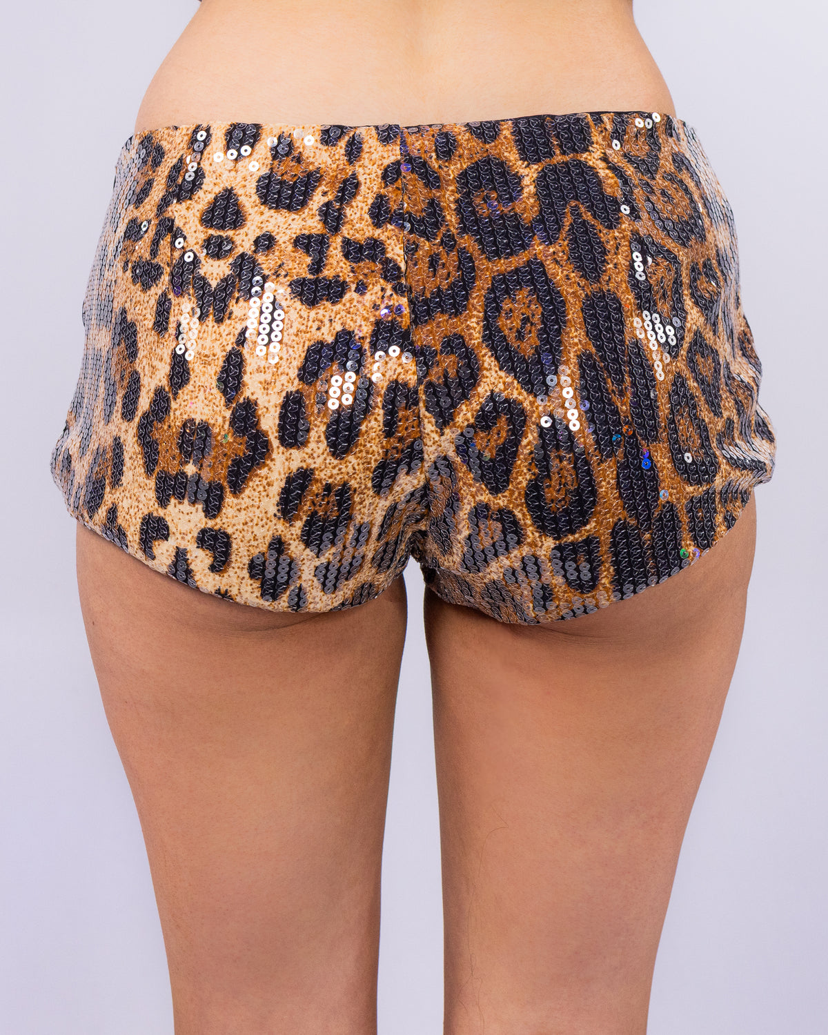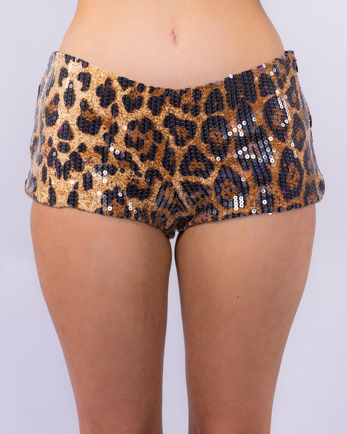 Be the life of the party with Frisky Business Women's Leopard Sequin Shorts. Let your inner animal shine with the bold cheetah leopard print and sparkly sequins. Perfect for dancing all night at a festival or rave, these shorts are a daring addition to your wardrobe. Embrace the wild side and turn heads wherever you go!