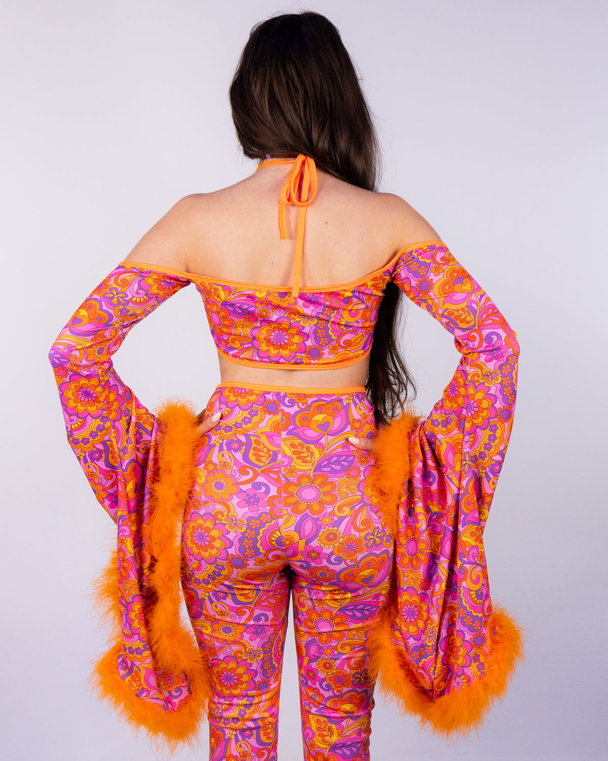 The Paisley Daze Bell Sleeve Halter features center o-ring detail and flowy mesh flare sleeves lined with marabou trim.