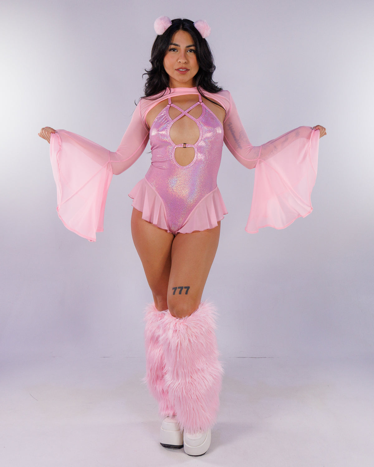 Don't blend in with the crowd – make a statement that stands out! This bodysuit's iridescent fabric and mesh flare detail on the skirt are designed to catch the eye and set you apart from the rest.