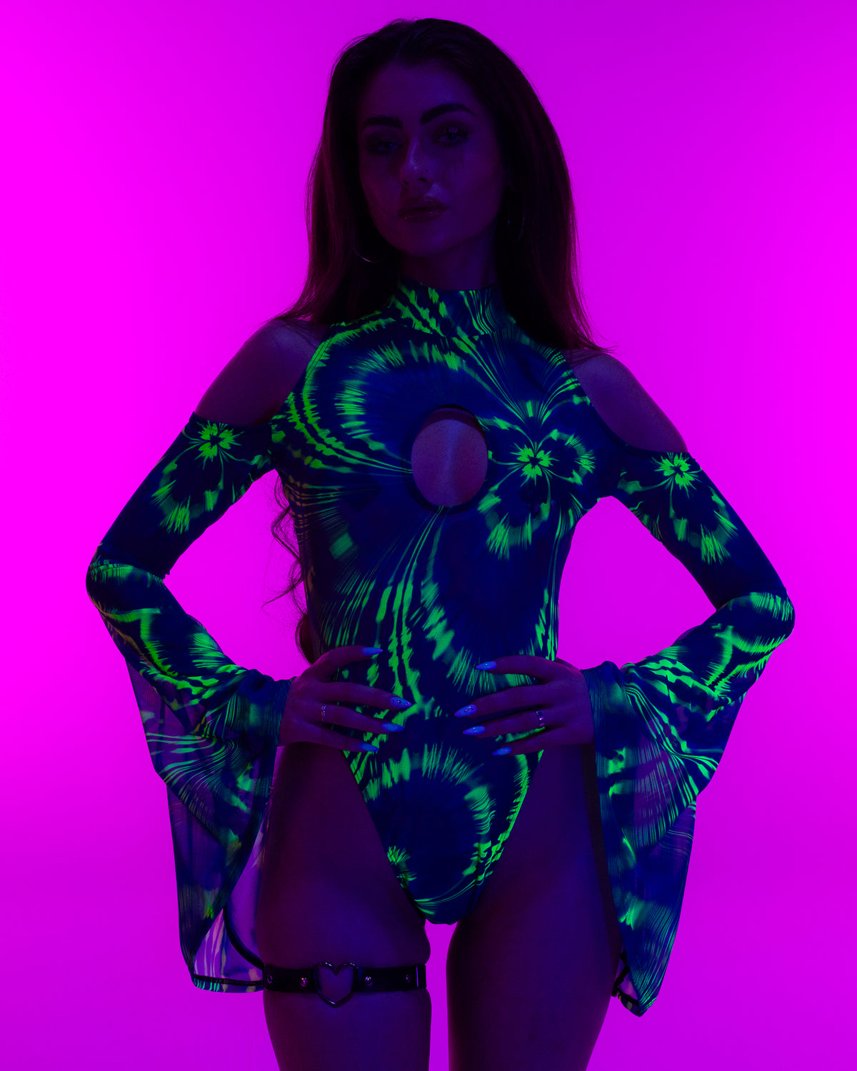 Flaunt your figure in this striking mesh bodysuit. The fine woven mesh fabric molds to your curves as a second skin that knows all your contours. Featuring an exposed shoulder design, a sultry keyhole opening, an exposed back and magnificent ultra flared sleeves, this bodysuit will elevate and add a dash of drama to any look. Redefine festival style with a look that attracts attention and keeps it.