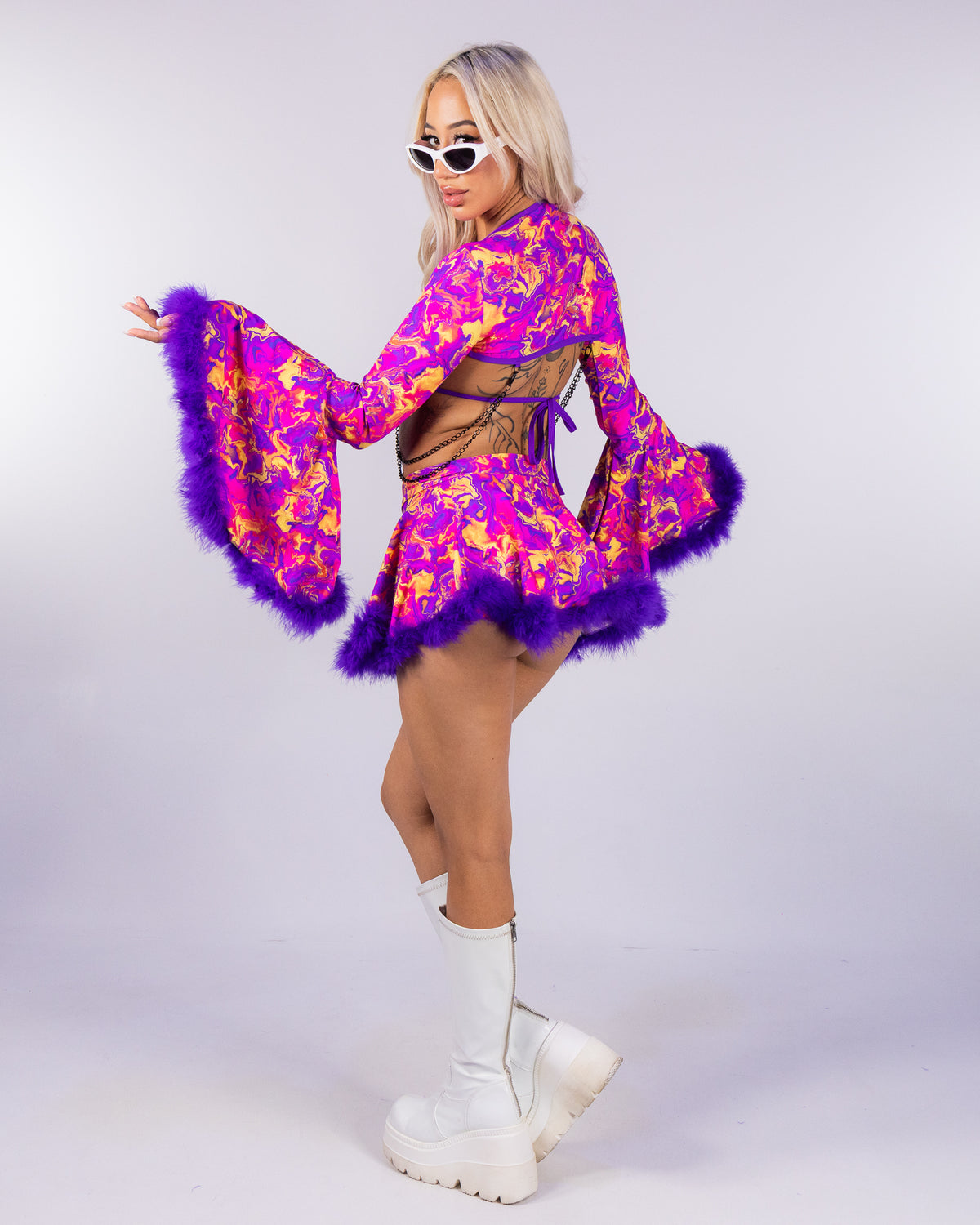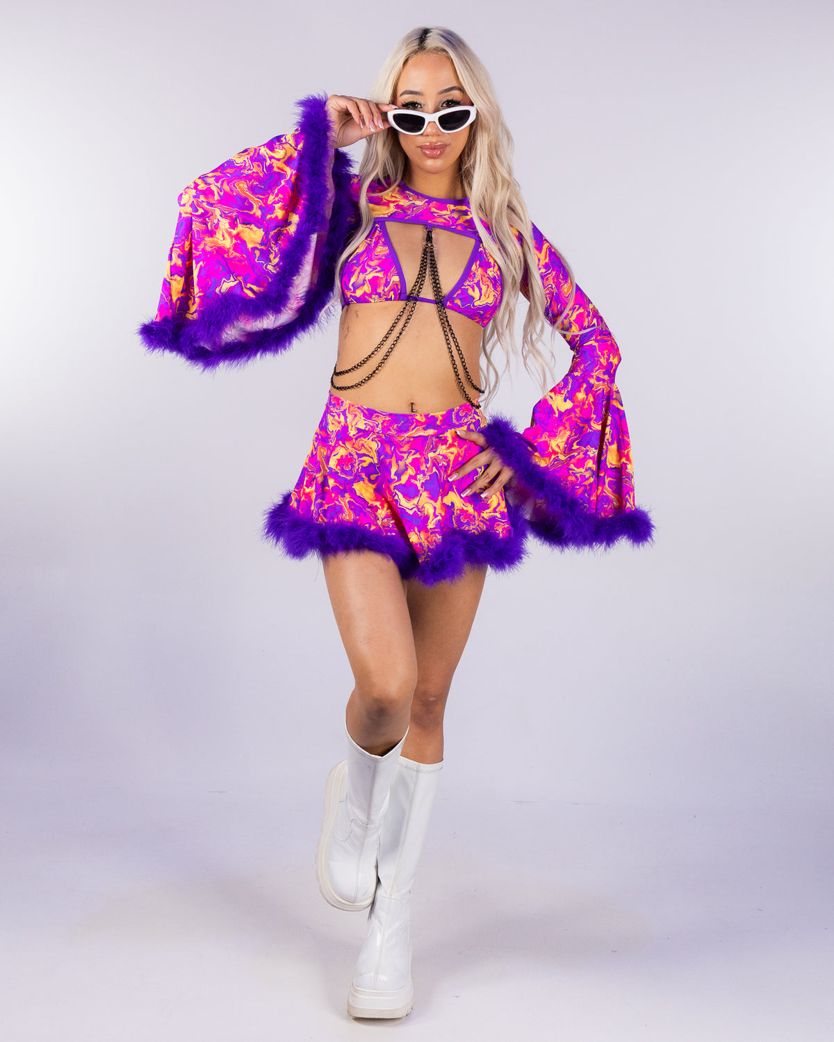 This shrug features detachable black chains and super soft marabou lined flare bell sleeves! Pair with your favorite Ultraviolet Vision top or go bold with just pasties to complete the look!