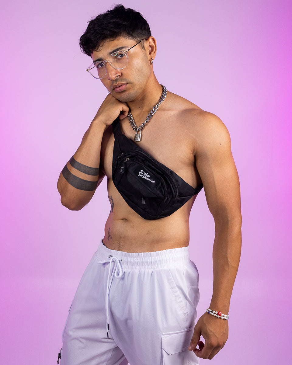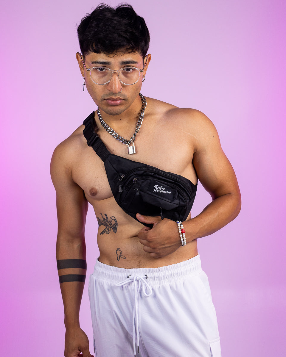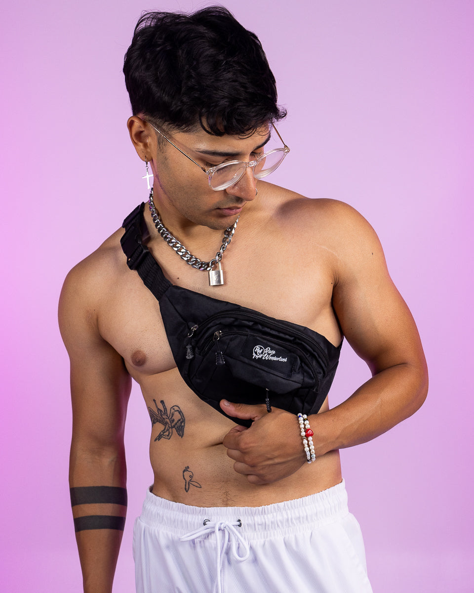 Perfect basic fanny pack for raves or everyday! Features adjustable buckle waistband and two main compartments and one small front front pocket.