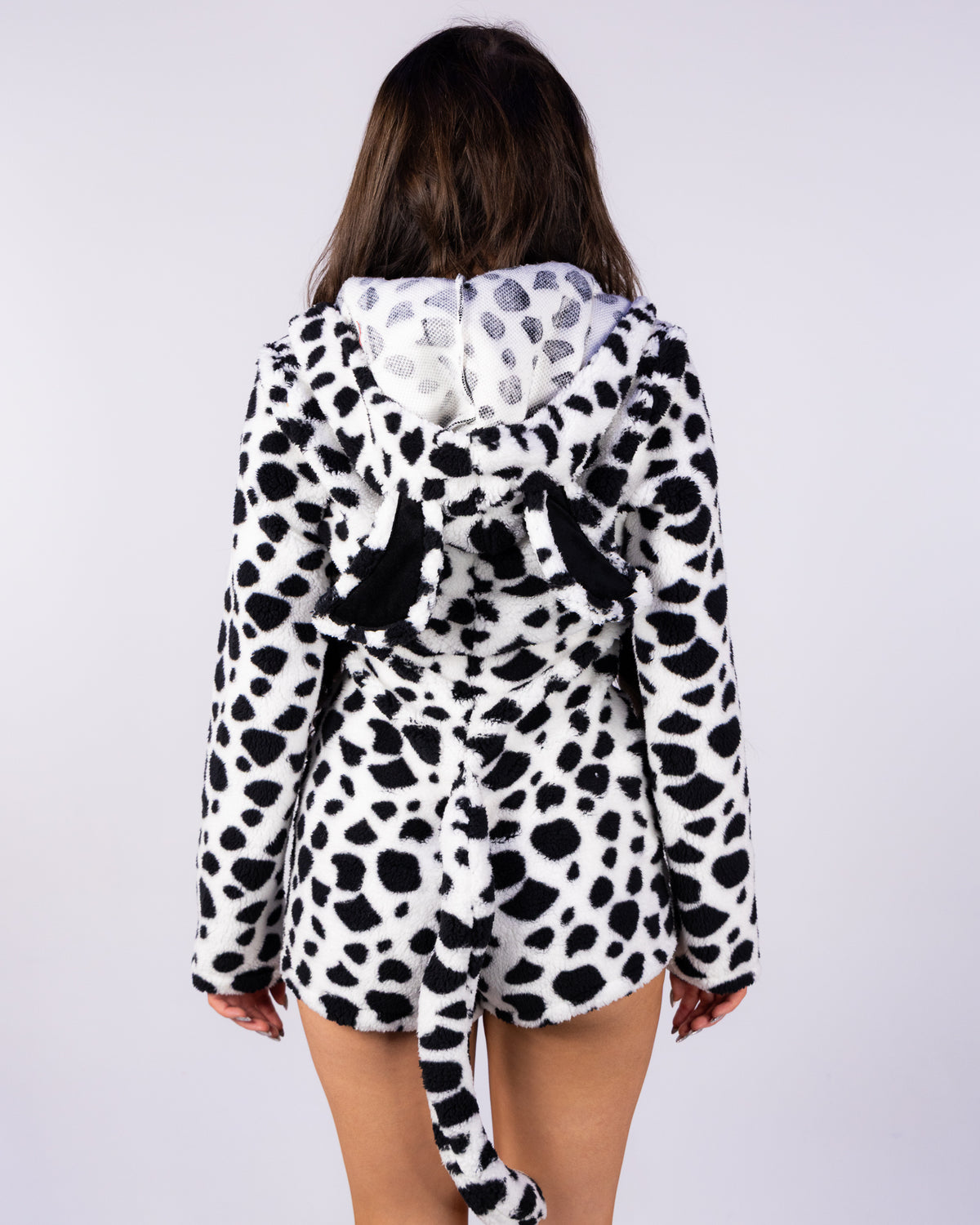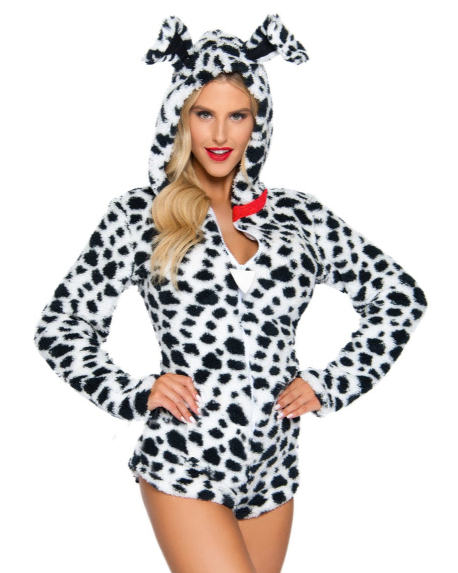 Cute, cozy and oh-so adorable the Darling Dalmatian Romper costume is perfect for any comfort-loving babe. You’ll be the cutest canine around in the ultra-soft plush zip up bodysuit with collar accent, ear hood, and attached tail.