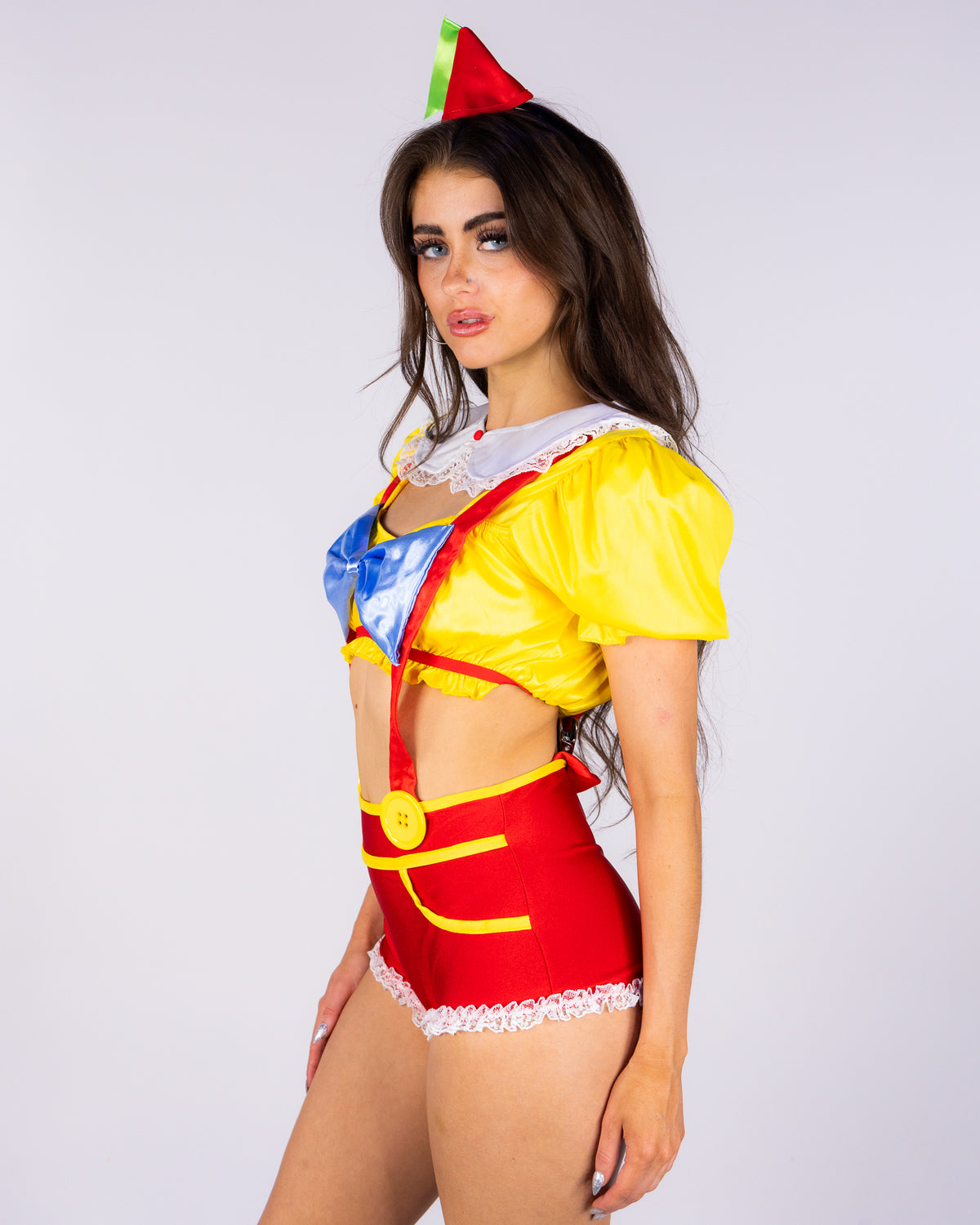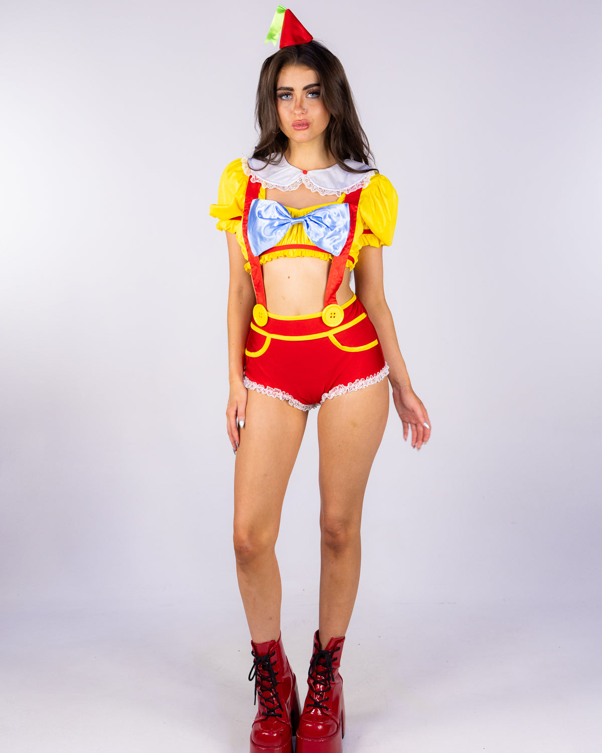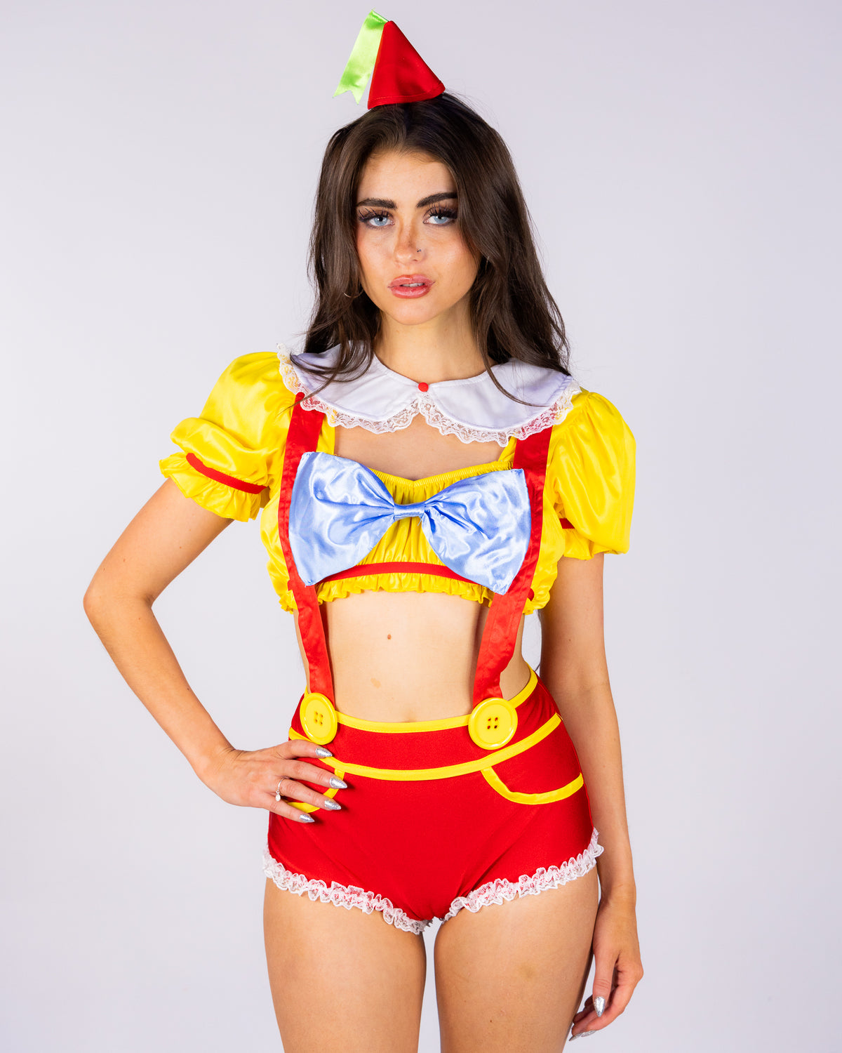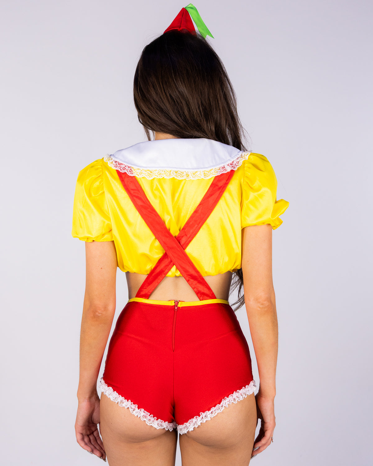 Step into the whimsical world of Wonderland with this playful 3-piece Tweedle Twin costume. Featuring a charming crop top with a classic Peter Pan collar, suspender shorts accented with a cute bow, and a matching hat headband, this set perfectly captures the mischievous spirit of Tweedle Dum and Tweedle Dee. Ideal for costume parties or themed events, it brings a fun and quirky vibe to your look.