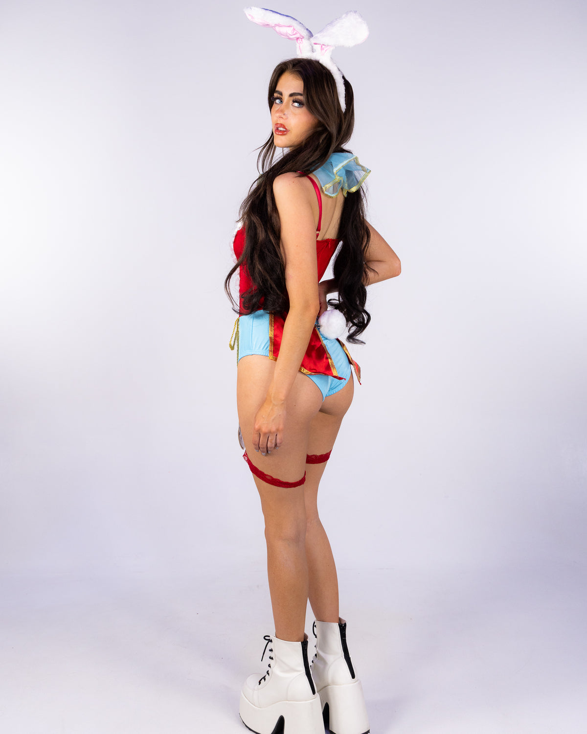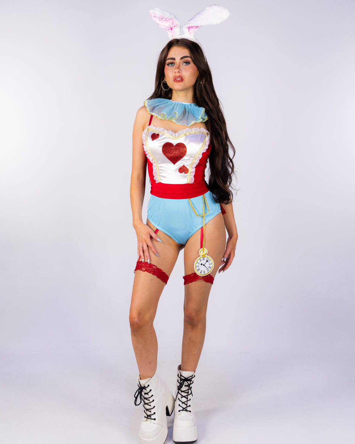 • Fit & Style: The crazy cute White Rabbit features a curve-hugging snap crotch bodysuit with attached leg garters, glittering heart details, pocket watch chain, and ruffle bib accent.