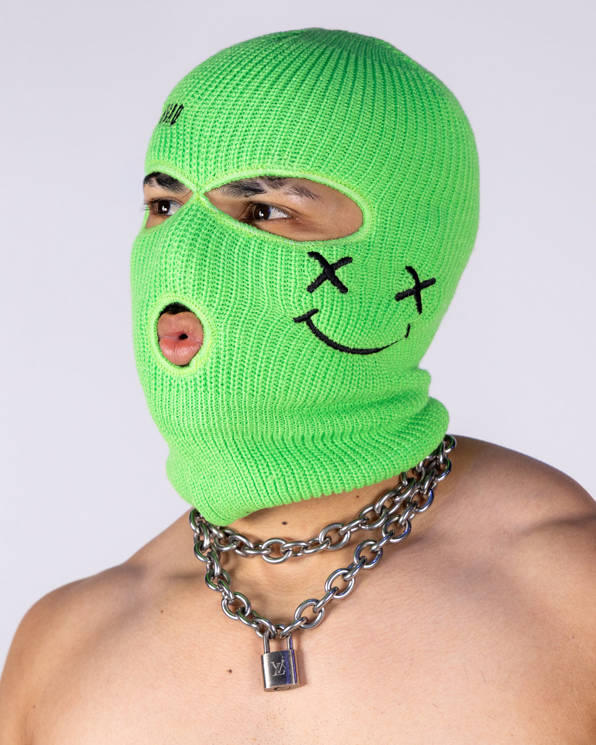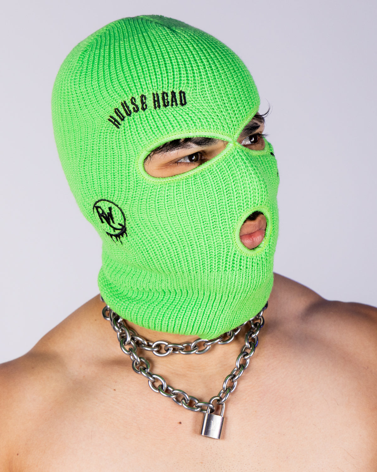Step into the spotlight with the Neon Green House Head Smiles Unisex Ski Mask, designed to make a bold statement wherever you go. This striking ski mask features vivid neon green fabric adorned with expertly embroidered "House Head" text and a playful smiley face, capturing the electric energy of raves and music festivals.