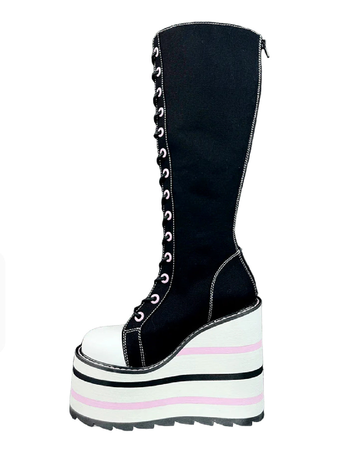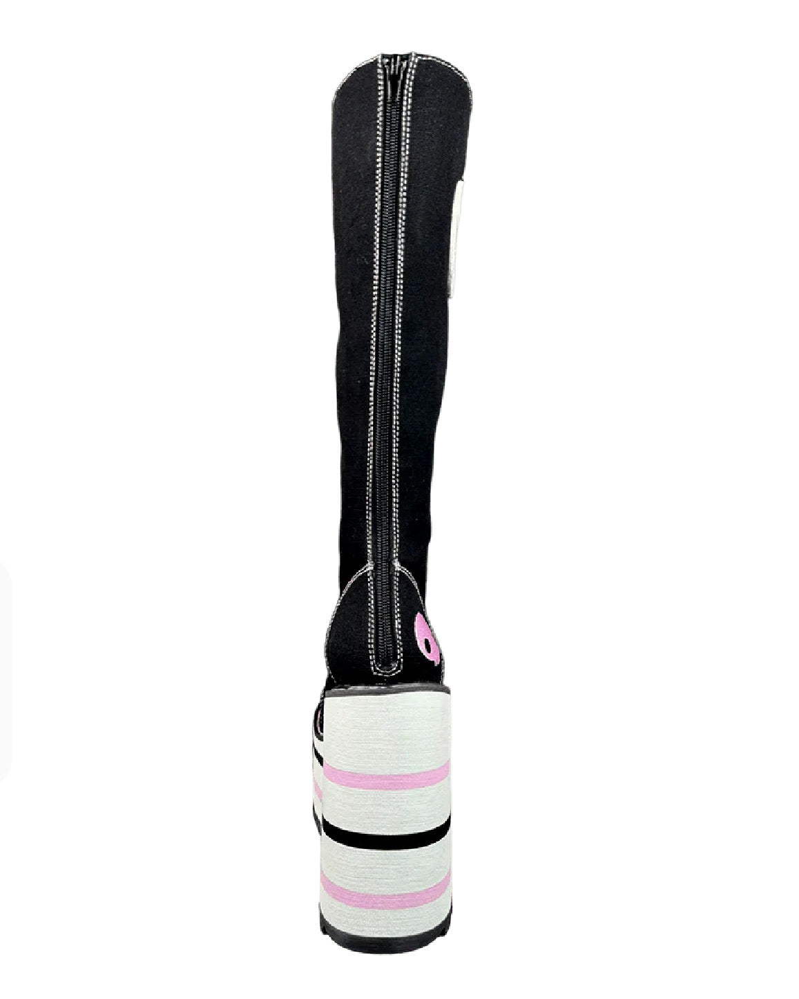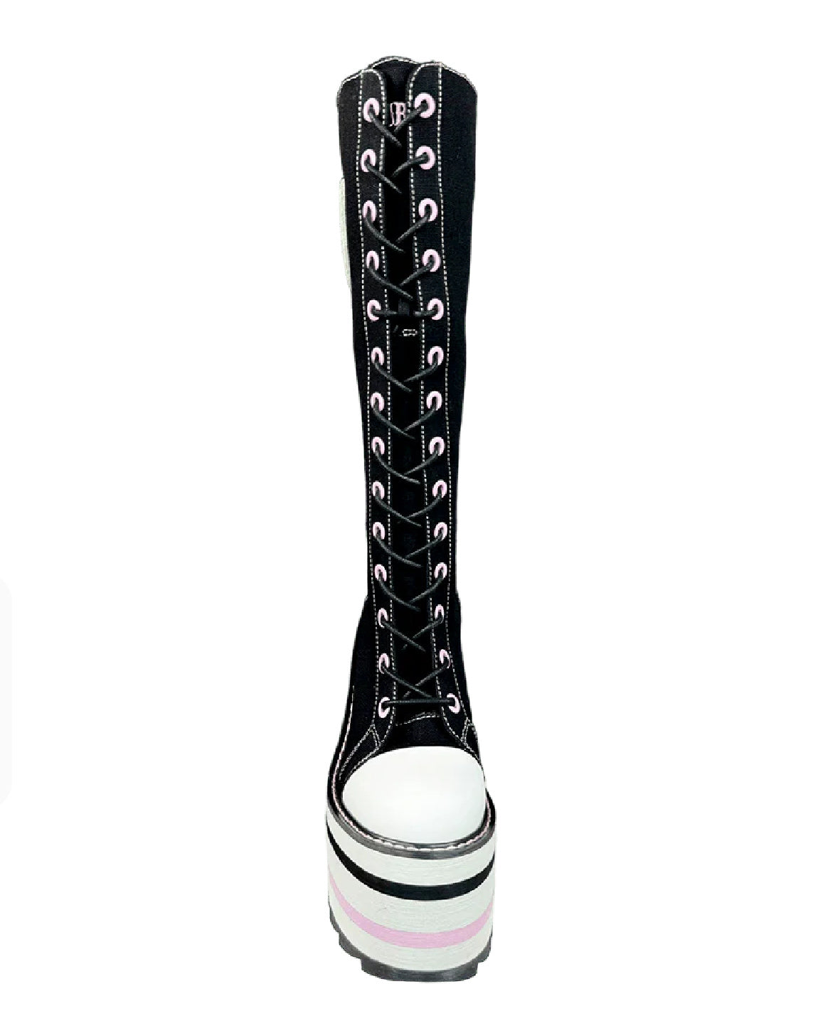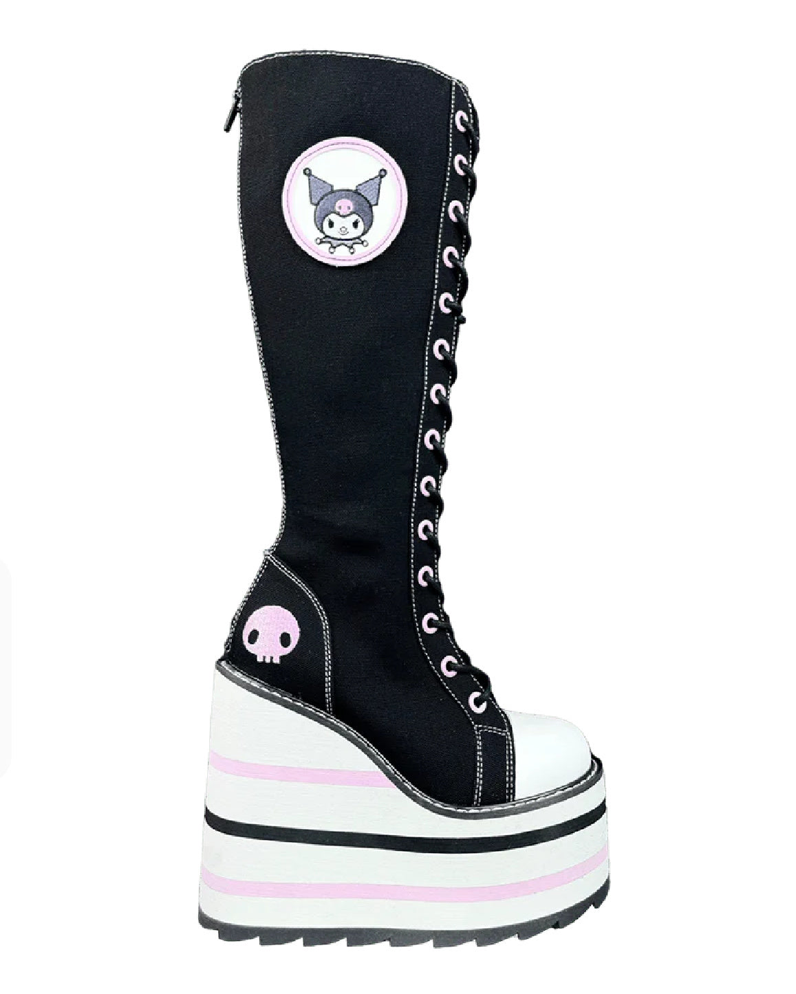 The latest addition to our lineup features a partnership with the iconic Kuromi. This detention piece boasts a sleek black canvas upper and matching lining, complete with a bold Kuromi patch detail and a classic white rubber toe cap. A striped EVA bottom and towering 3 inch platform with a 6 inch heel add a touch of height and style to this piece.