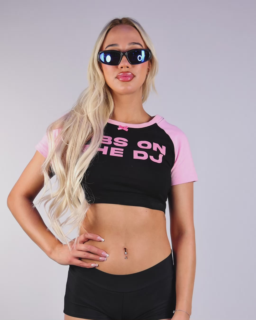Show off your love for the rave scene with this black and pink baseball-style baby tee made just for the girlies who know how to vibe. Perfect for rocking at raves or representing your rave love every day, it combines comfort with a playful edge that keeps your style on beat.