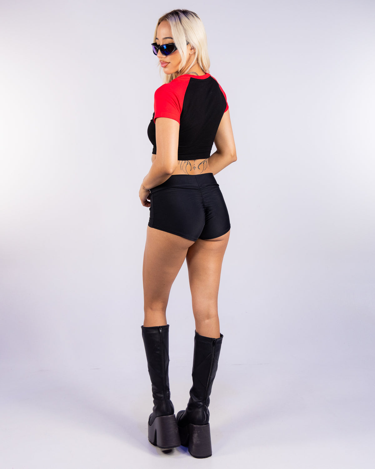 Show off your love for the rave scene with this black and red baseball-style baby tee made just for the girlies who know how to vibe. Perfect for rocking at raves or representing your rave love every day, it combines comfort with a playful edge that keeps your style on beat.