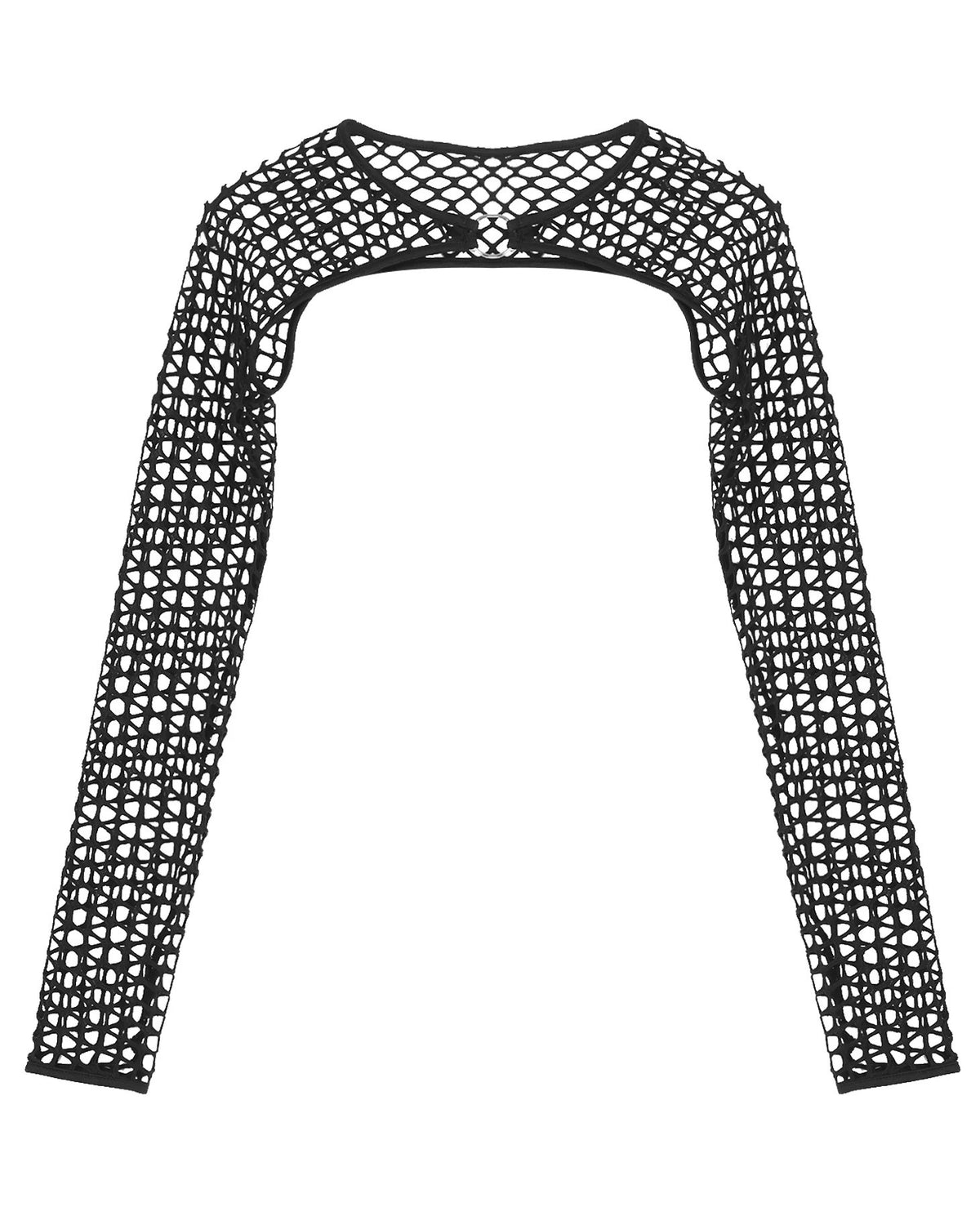 Add some daring and versatility to your wardrobe with our Tech Babe Fishnet Shrug! Made from soft, breathable fishnet fabric, this long sleeve shrug features a silver metal o-ring detail in the center and can be paired with a variety of tops or pasties for a unique and fashion-forward look. Perfect for the risk-taker techno head in you! It's an edgy addition to your wardrobe that can elevate any outfit!