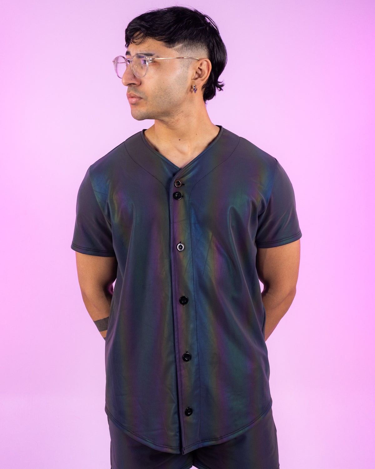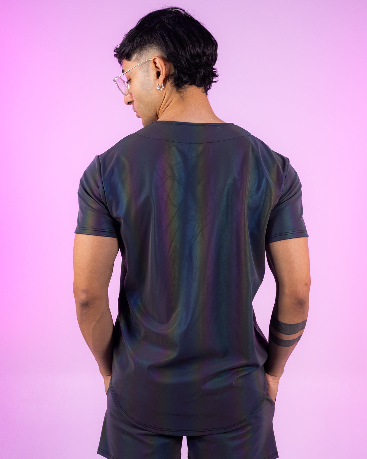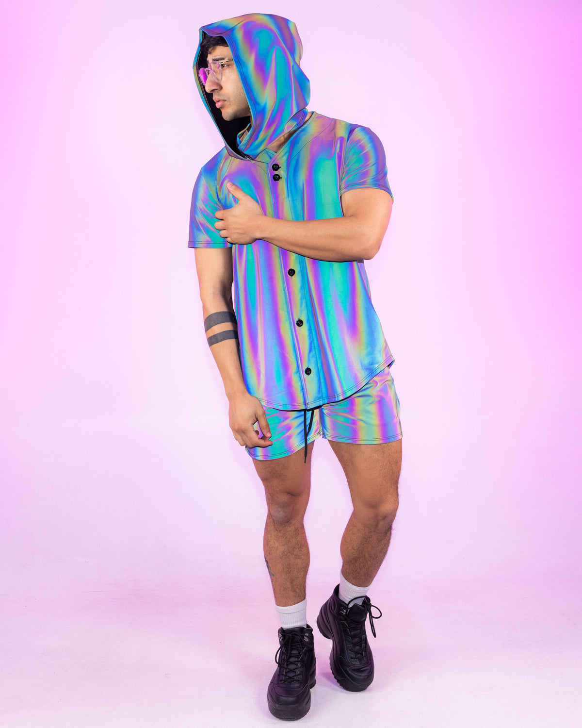 Stand out and take risks with our Rainbow Flash Reflective Jersey. Made with flash reflective material, this button-up jersey design will light up in the night at any rave, concert, or music festival. Be bold and adventurous with a jersey that will make you shine.