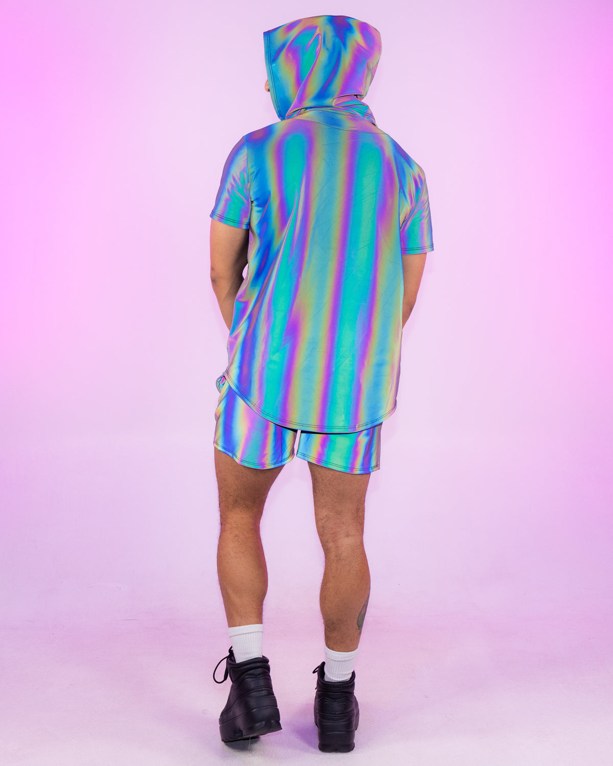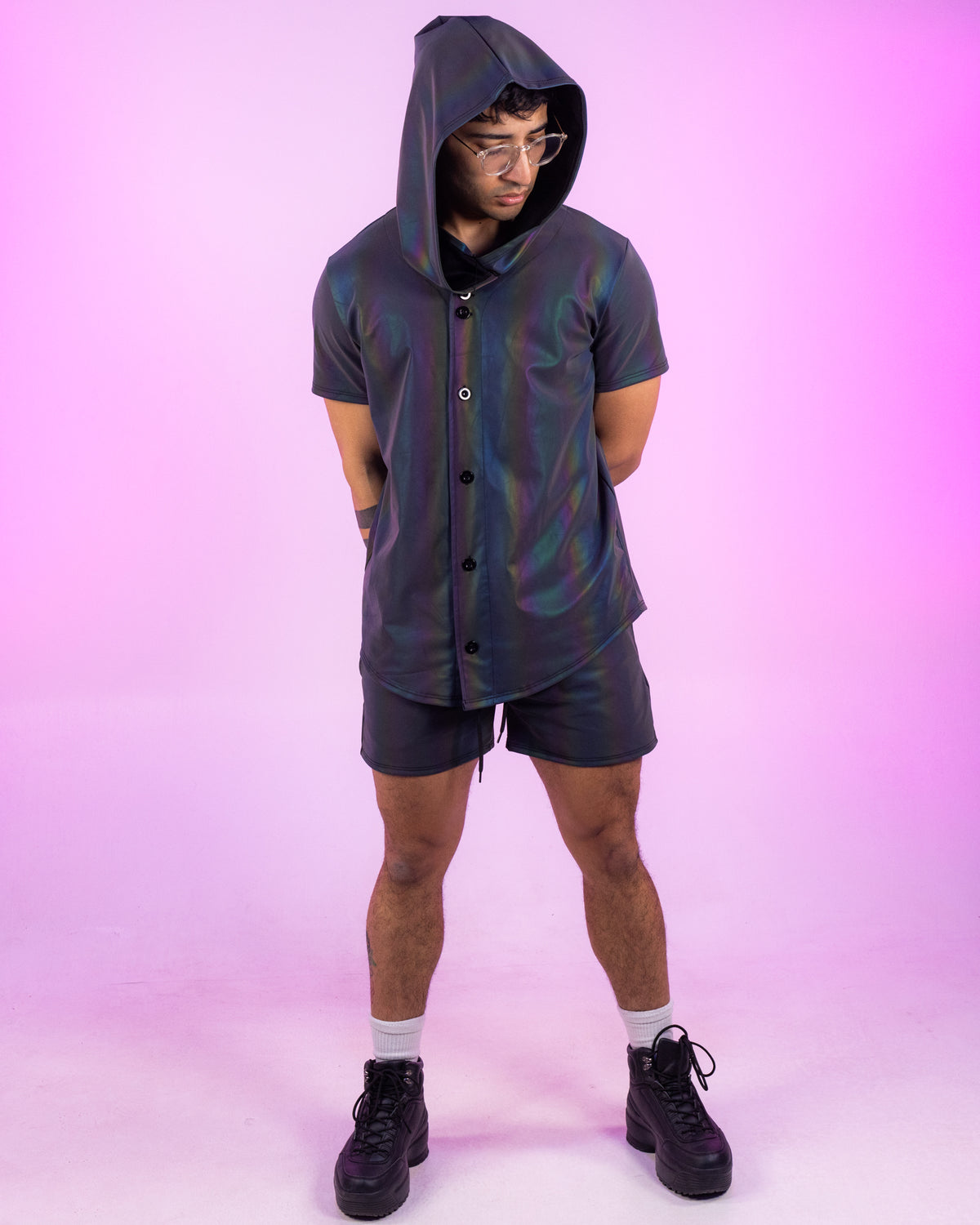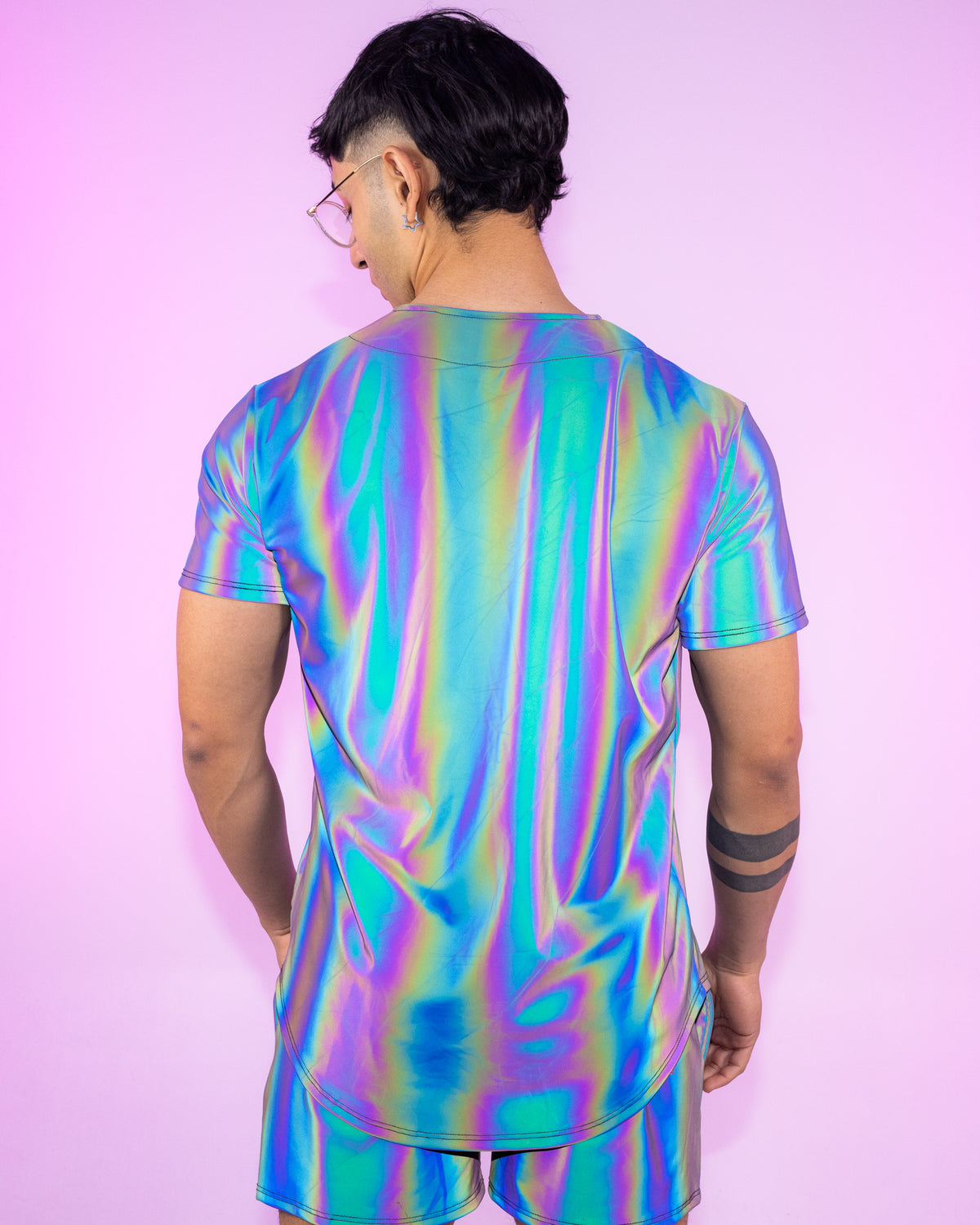 Stand out and take risks with our Rainbow Flash Reflective Jersey. Made with flash reflective material, this button-up jersey design will light up in the night at any rave, concert, or music festival. Be bold and adventurous with a jersey that will make you shine.