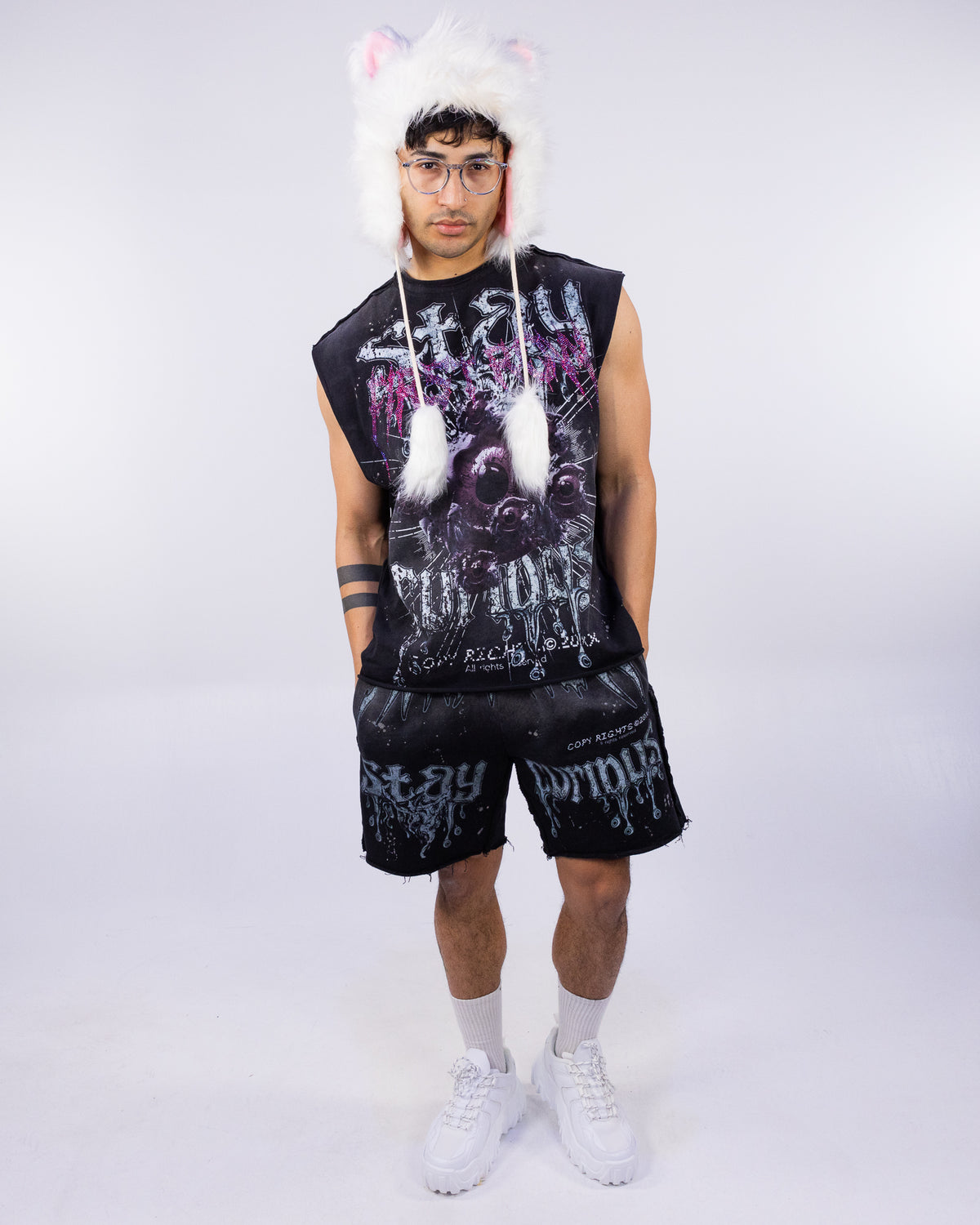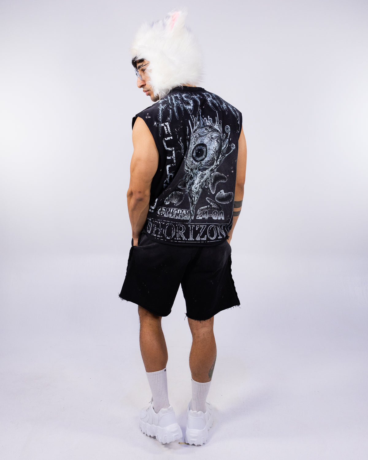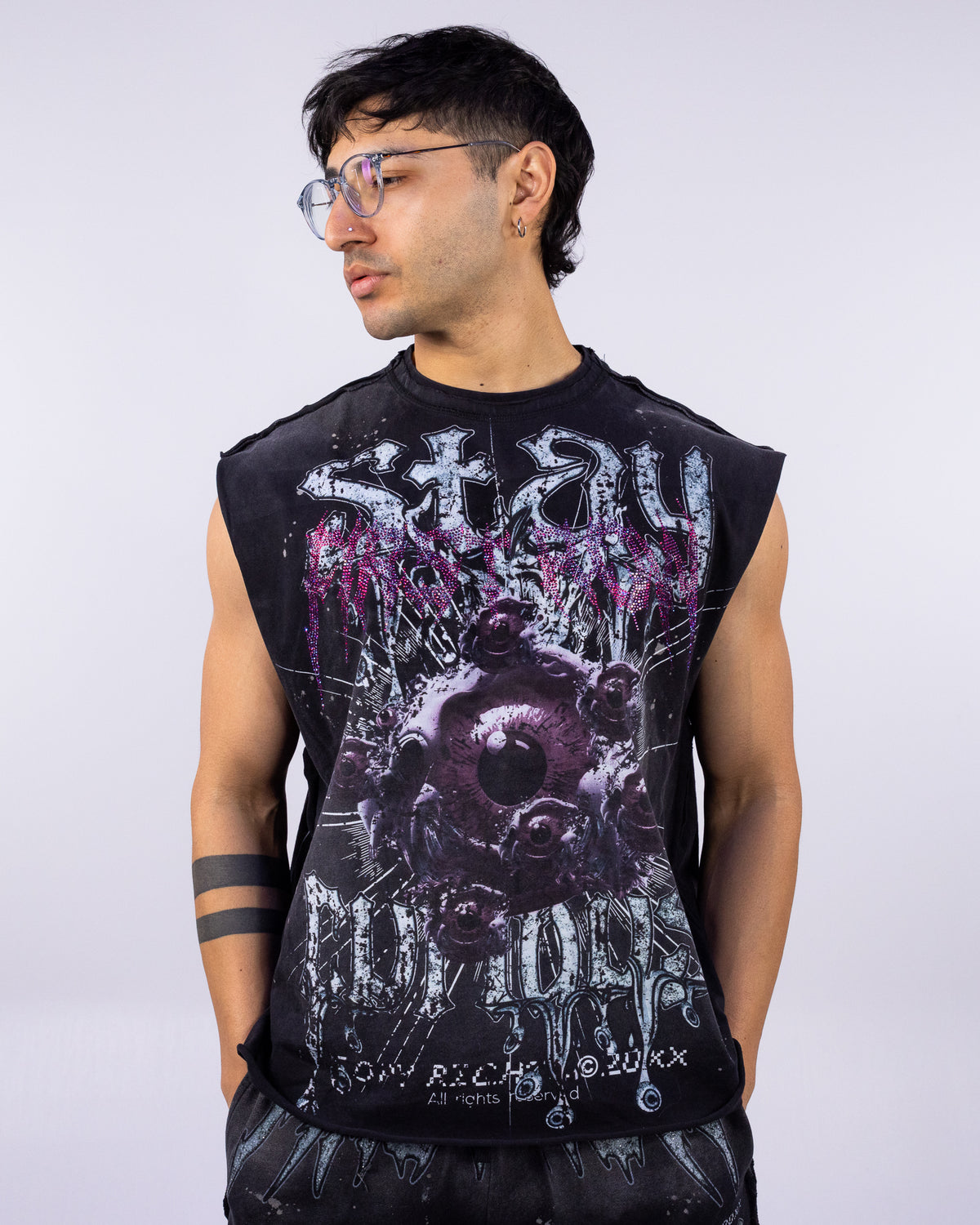 Whether you're shopping for a tomboy or any guy in your life, this premium graphic print muscle tank top with rhinestone detailing are the perfect edgy piece to have in your rave or everyday wardrobe for a little Y2K throwback! Featuring a front and back design, a flat hem line and slightly dropped shoulder fit with raw edge hem.