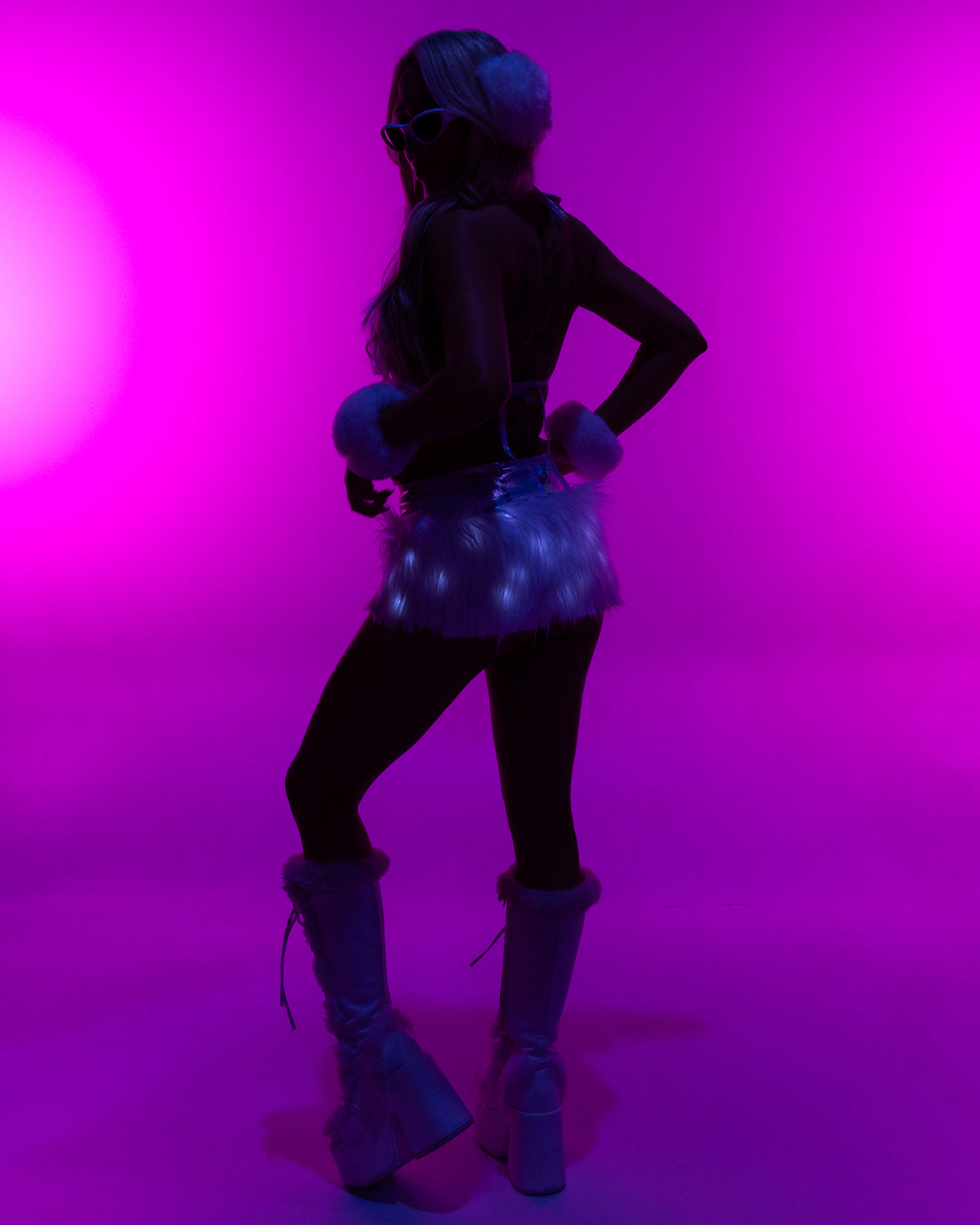 Conquer the dance floor at any rave and festival with the LED Light Up Women's White Faux Fur Skirt. Made from super soft faux fur, this ultra mini circle skirt features LED lights inside and is a bold must-have for any risk-taking fashionista. The stretchy metallic foil waist gives an extra pop of shine to your fit! Be bold, be daring, be fabulous!