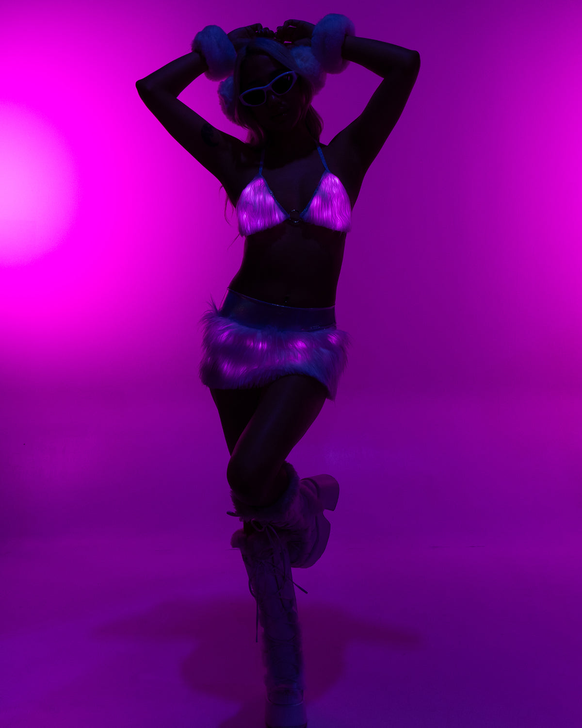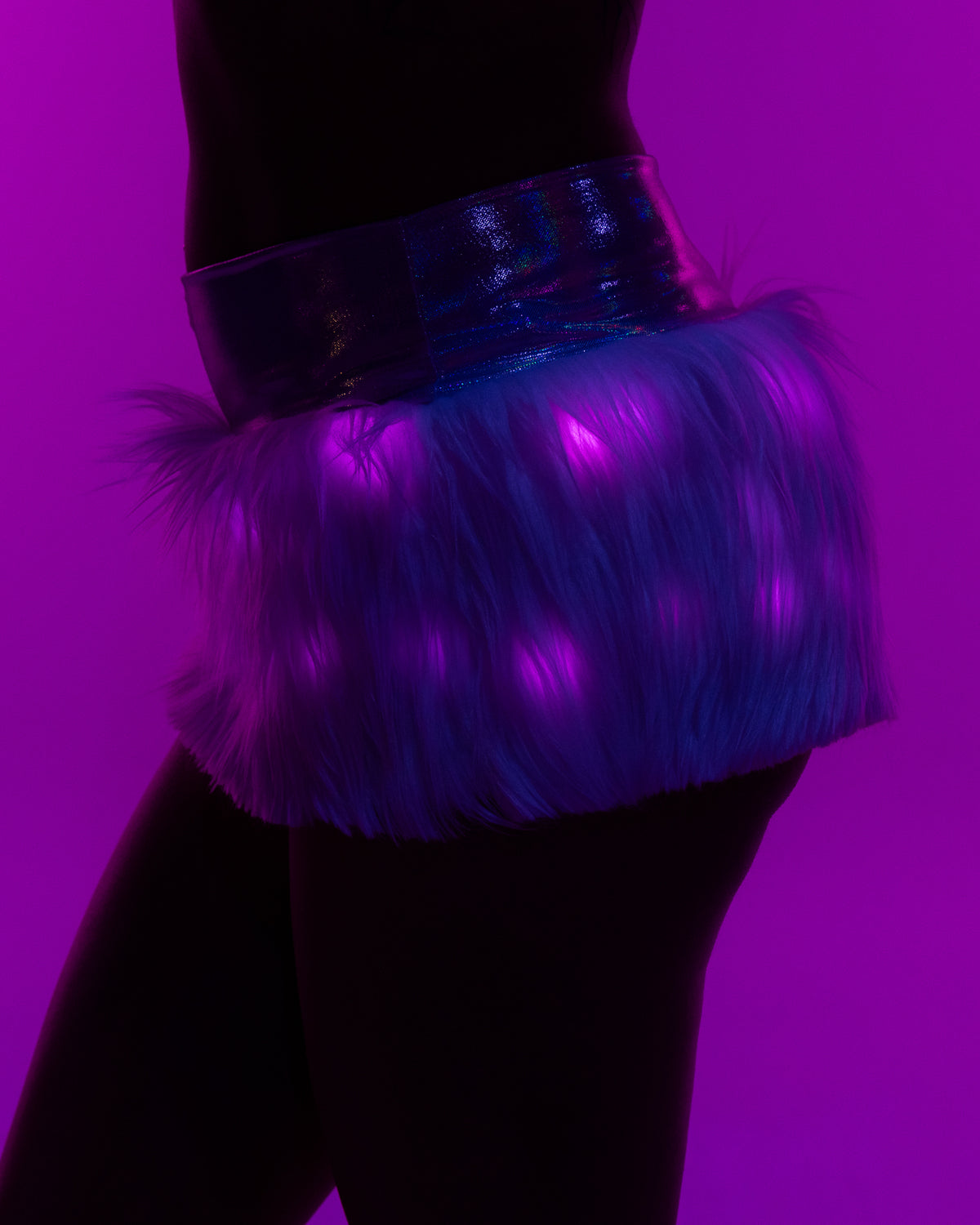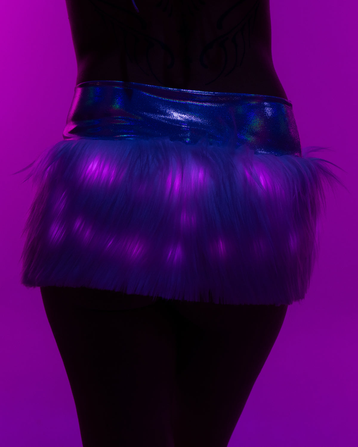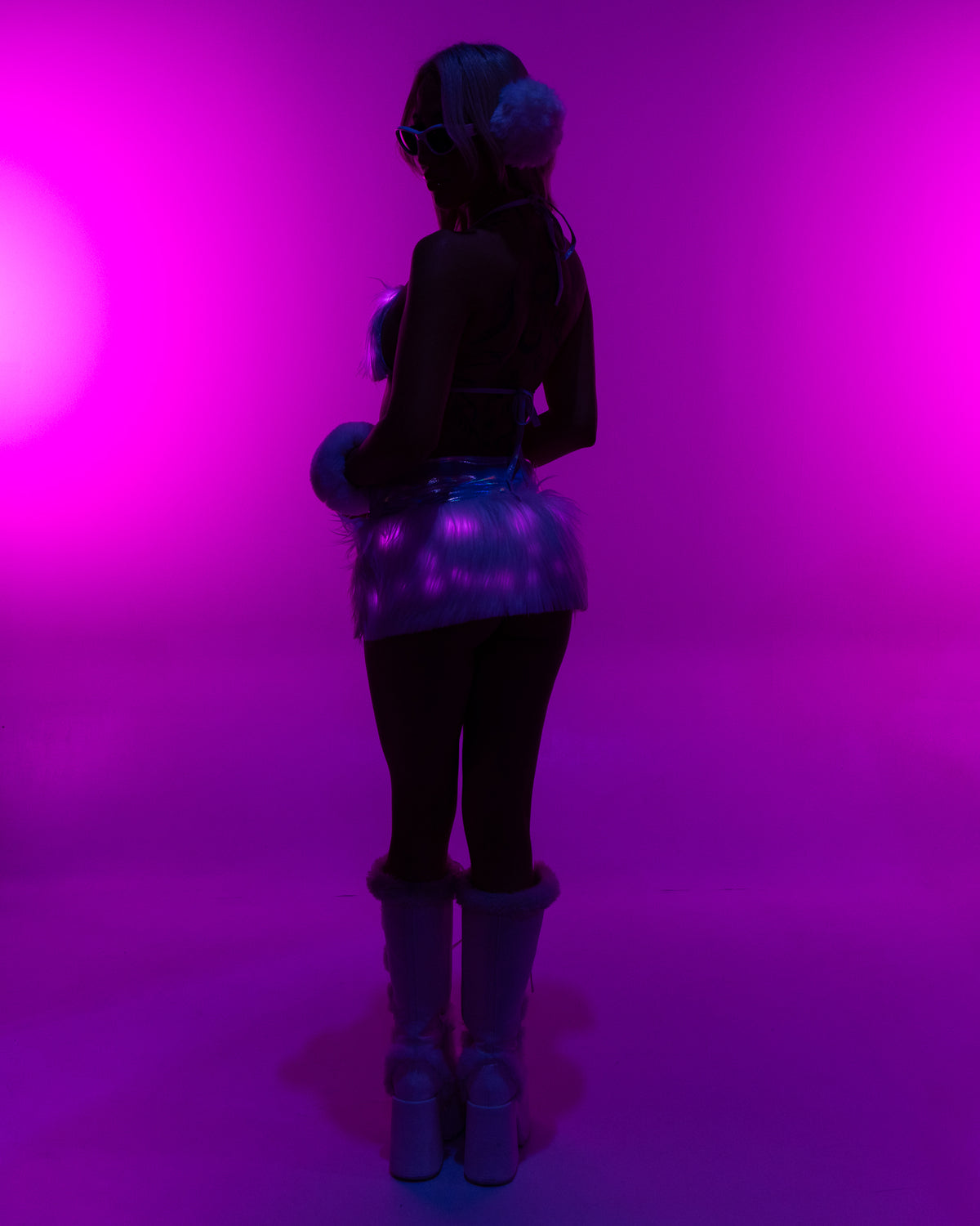 Conquer the dance floor at any rave and festival with the LED Light Up Women's White Faux Fur Skirt. Made from super soft faux fur, this ultra mini circle skirt features LED lights inside and is a bold must-have for any risk-taking fashionista. The stretchy metallic foil waist gives an extra pop of shine to your fit! Be bold, be daring, be fabulous!